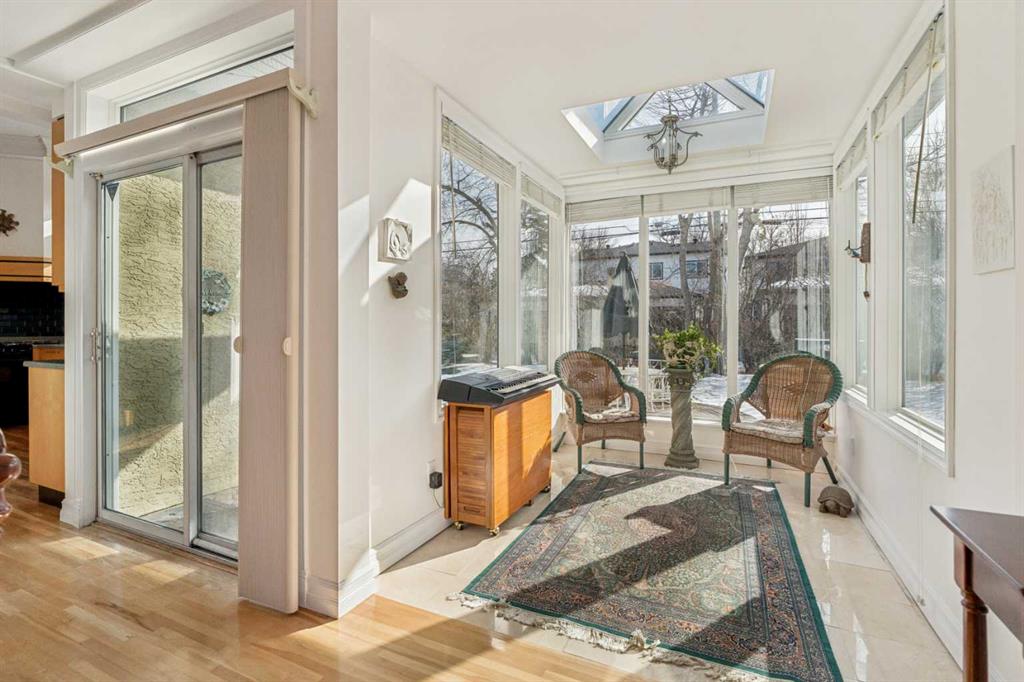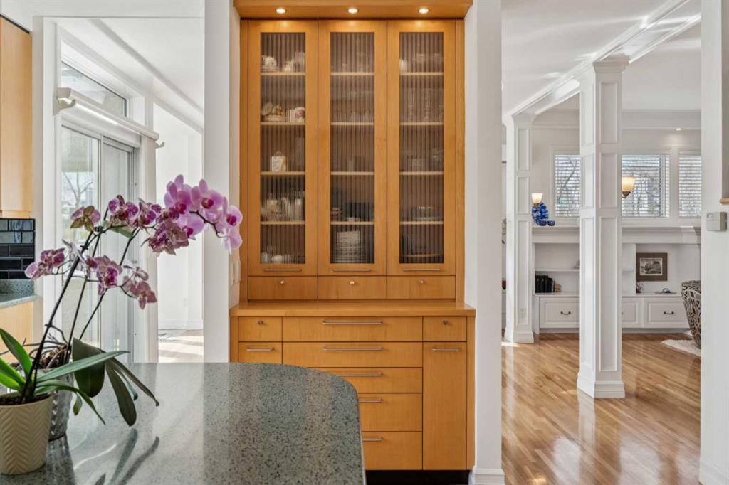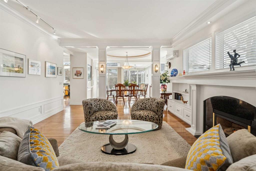 The elegant living room is filled with natural light from an abundance of windows and anchored by a gas fireplace with a substantial mantel and built-in shelving. It flows into the dining area—perfect for large family gatherings—and a bright sunroom ideal for plants or a relaxing retreat. The kitchen impresses with an 11-foot ceiling, sleek Denca cabinetry, generous counter space, and large windows overlooking the stunning backyard.