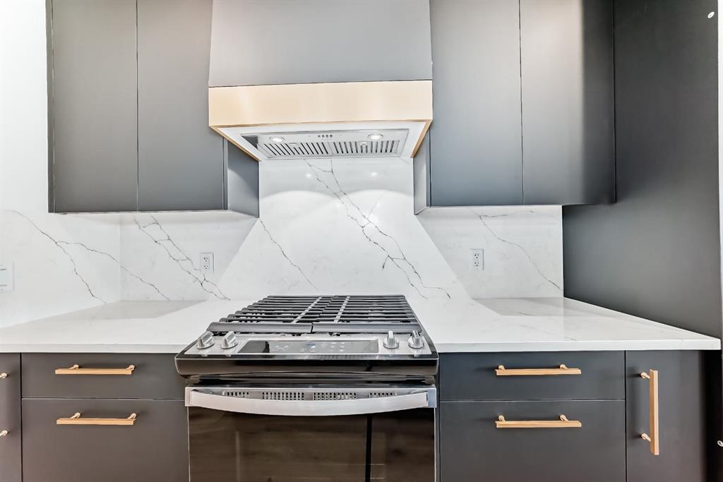 The main living level is bright and inviting, with soaring ceilings, wide-plank flooring, and an open-concept layout designed for modern living. The chef-inspired kitchen is a showpiece, featuring full-height cabinetry with soft-close doors, a gas range, integrated refrigerator, built-in microwave, and a spacious pantry. A large eat-up quartz island anchors the space—perfect for casual dining, hosting friends, or enjoying a quiet morning coffee.
