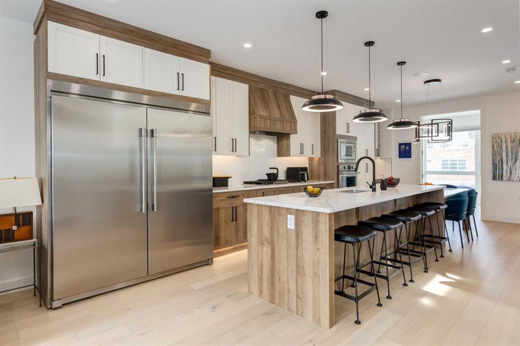 The sun-filled main floor features 9’ ceilings, wide-plank oak hardwood, and an open-concept layout designed for entertaining. The chef-inspired kitchen is anchored by a large quartz island and equipped with a professional oversized refrigerator/freezer, gas cooktop with grill, wine fridge, and extensive custom cabinetry. A versatile main floor bedroom—ideal as a private office—includes French doors and a built-in closet. The living room with custom nuilt ins and a natural gas fireplace is lit by west sun and walks out to a spacious elevated deck with a BBQ gas line.