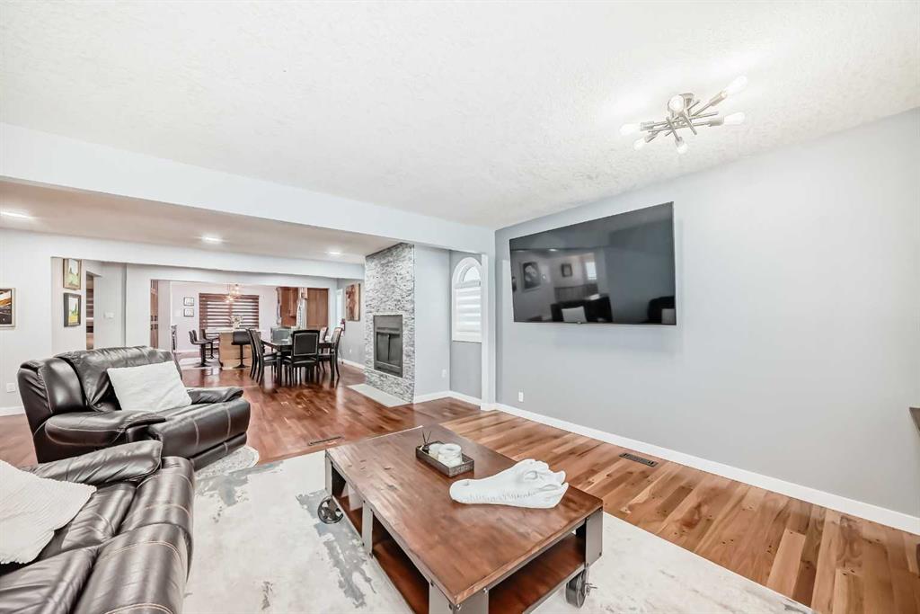 The home showcases a renovated kitchen with custom cabinetry, quality finishes, ample counter space, and a large central island, seamlessly connecting to the dining and living areas. Large windows and a skylight fill the home with natural light, while hardwood flooring enhances the warm and inviting atmosphere throughout the main living spaces.