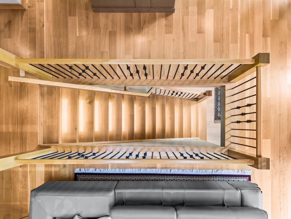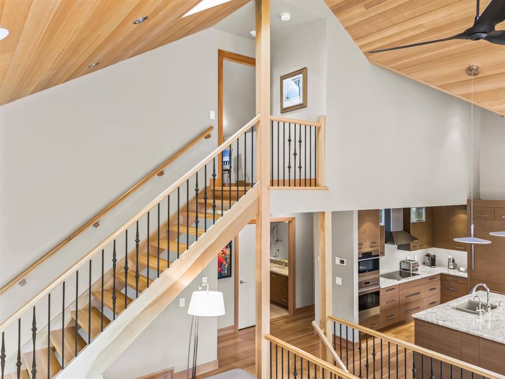 From the moment you enter, every detail reflects quality. Site-finished white oak flooring, custom solid oak, open-riser stairs, and soaring clear fir vaulted ceilings set a warm and sophisticated tone.
