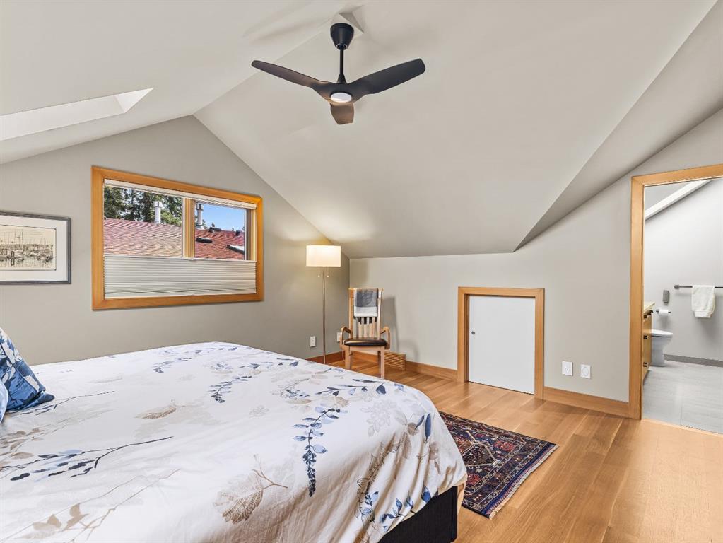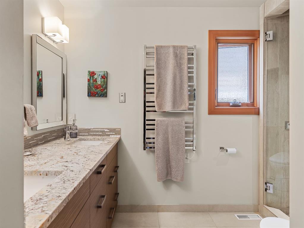 The home features two beautiful and spacious primary retreats. The main floor suite is filled with natural light and has a stylish walk-in closet. It also offers a spa-inspired ensuite with dual sinks, a steam shower, heated towel bar, and a Toto toilet with bidet seat. Head up the stunning, open riser stairs to the second primary suite which offers a similar luxurious ensuite, with the addition of a deep soaker tub.