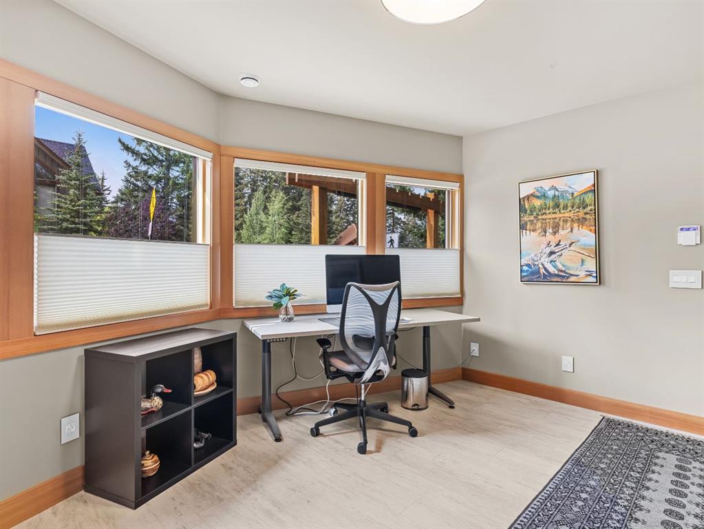 On the ground level, a cozy family room offers the ideal spot for movie nights or game days, while a bright home office makes working from home effortless. A well-designed laundry room with abundant cabinetry, counter space, and a drying cabinet ensures that even chores feel streamlined. Completing this level are a fourth bedroom, a fourth full bath, and an epoxy-finished, heated double garage with ample space for all your mountain gear.