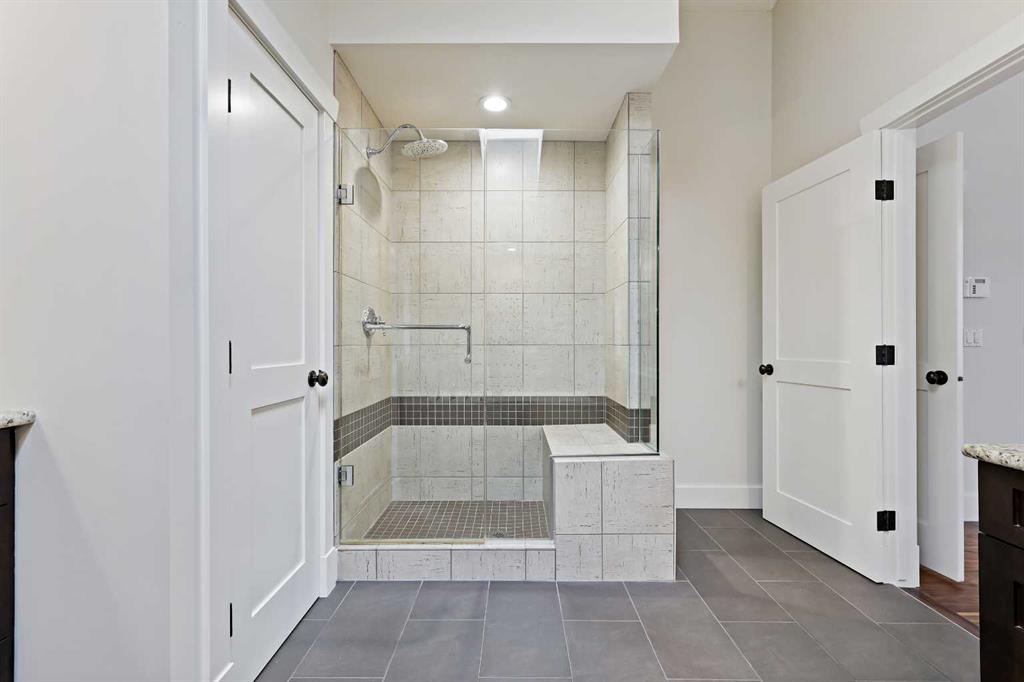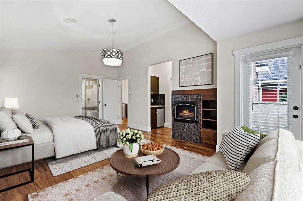 Upstairs, the second floor features high vaulted ceilings and a stunning south-facing primary suite complete with a fireplace, very private upper balcony, built-in coffee bar with mini fridge, walk-in closet, and spa-style ensuite with soaker tub and dual vanities. Two additional bedrooms and a full laundry room complete the upper level — including a dedicated built-in study nook with custom cabinetry, and one bedroom with its own walk-in closet.
