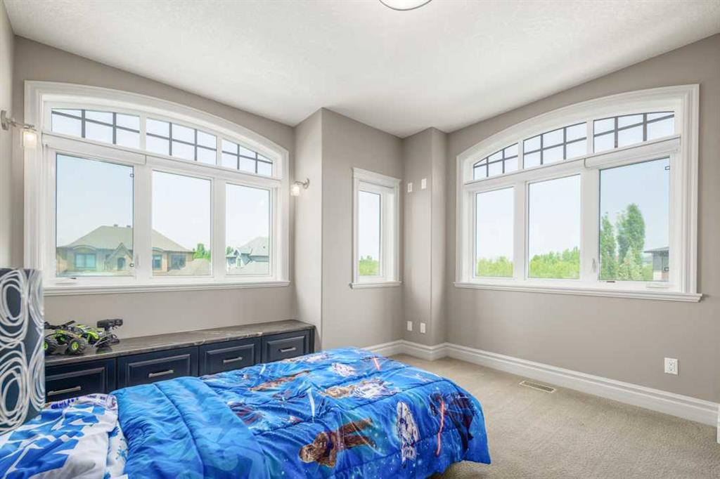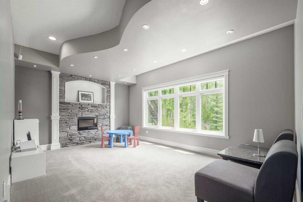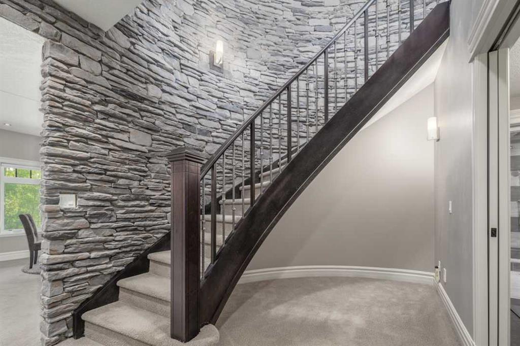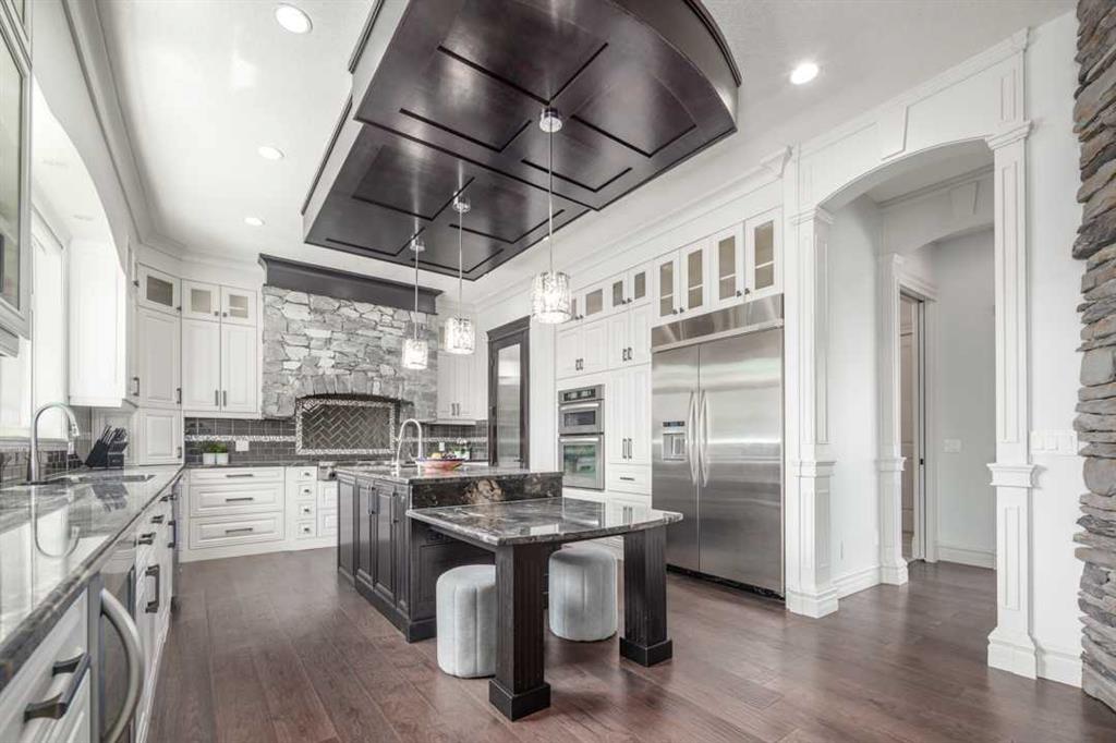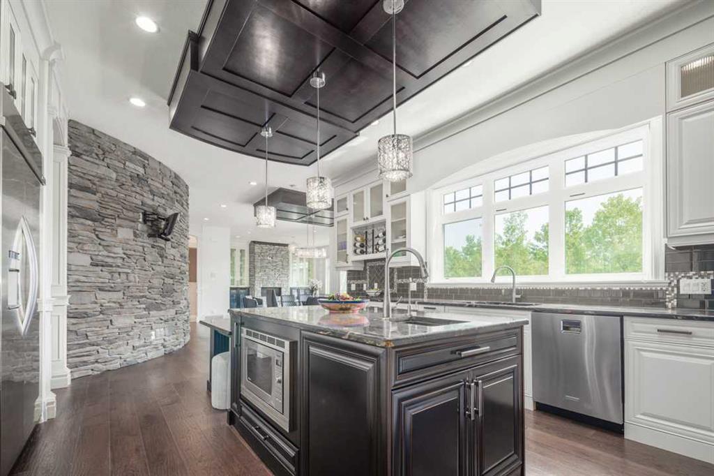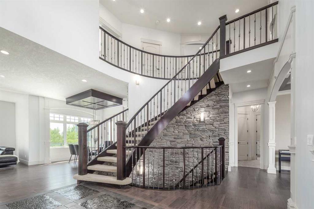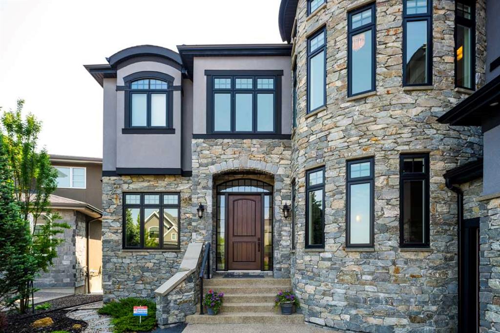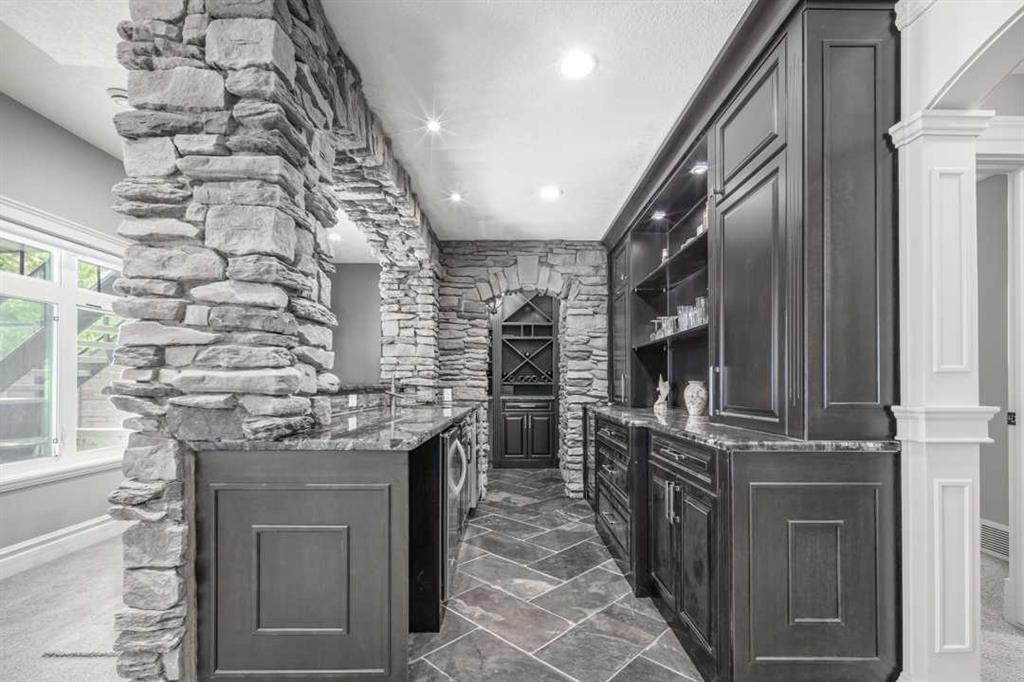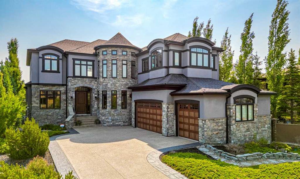 Directly backing onto a massive ravine with a private gated access to scenic walking paths nestled in a quiet cul-de-sac of the prestigious Aspen Ridge Estates, this meticulously maintained (BRAND NEW ROOF AND GUTTERS IN SEPTEMBER 2025), truly custom-built Modern French Country-inspired architectural gem exudes “Nouveau-Medieval” Castle character with a distinctive 2-storey rotunda-style front turret tower, extensive natural stonework on all four exterior elevations & a timeless design of luxurious elegant, Smoke & Pet-Free Living. Step into the grand 20-foot foyer where a crystal chandelier sparkles above custom natural pebble stone flooring, transom windows over the solid front door with sidelites & a soaring spiral open-riser staircase. Solid wood cabinetry with stylish furniture kick, custom millwork, built-ins & enclosed glass display shelves with LED lighting & premium Titanium granite, modern curved archways, wall niches & windows, flat tray ceilings with recessed & pot lighting, solidcore doors, wide-plank hand-scraped Hickory engineered hardwood flooring by Mirage, designer light fixtures & mirrors set a tone of high-end finish throughout the entire home. The 10-foot ceiling main floor showcases a gourmet kitchen featuring custom cabinetry with premium grade Titanium granite countertop, glass tile with metal 3-D mosaic backsplash, bar with built-in wine rack and cooler, and seamless flow into dining and living areas. A powder room blends luxury with natural white marble floor and walls along with a natural stone sink — mirrored in lower-level bathroom for cohesive sophistication. With 5 bedrooms 6 baths - 4 with spa-inspired ensuite each including a custom-built Kohler body massage shower, & the primary suite elevates the experience with additional steam shower, air massage tub, heated floors, & a bar with a built-in wine cooler. Upper floor features 9 to 11 foot ceilings, 4 bedrooms and a bonus room with a wetbar & built-in fridge. Fully finished walkout basement features spiral staircase, full-height display wall niches with natural stone and LED, curved decorated flat ceilings, entertaining bar with wine cellar, home theatre, game room, gym, recreation room, and a bedroom with full bath. Additional comfort features include 2 Carrier ACs and furnaces, built-in sound system and central vacuum. Step outside to the professionally landscaped backyard with a mini-golf putting green, underground sprinklers, & maintenance-free vinyl deck and stairs with tempered glass railings overlooking tranquil ravine views. Exposed aggregate concrete driveway with stamped borders, stairs, front landing, & rear patio. Oversized triple side-drive garage offers ample space for storage, a workshop, or even tandem parking for a 4th vehicle. Close to top-rated private & public schools including Rundle, Webber & Ernest Manning High School, Westside Rec Center & LRT. A true one-of-a-kind estate for those who appreciate timeless design, privacy, & a connection to nature.
