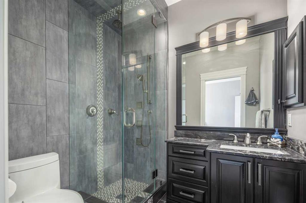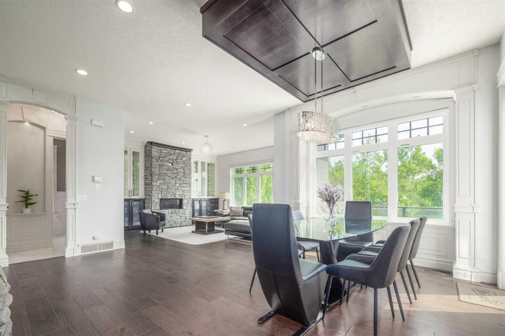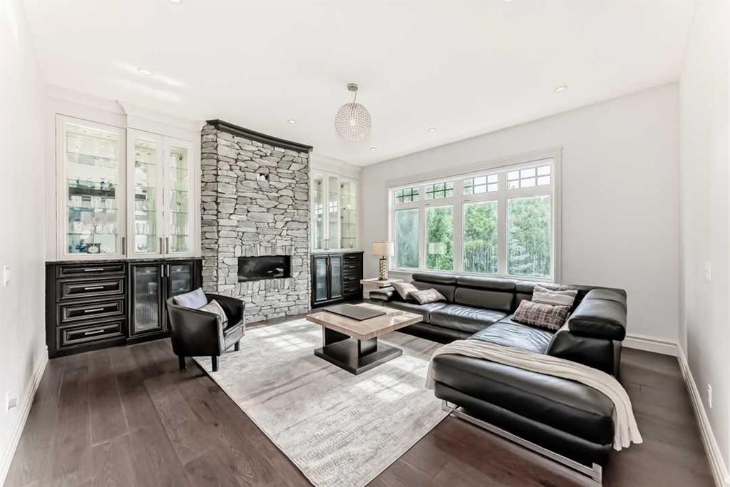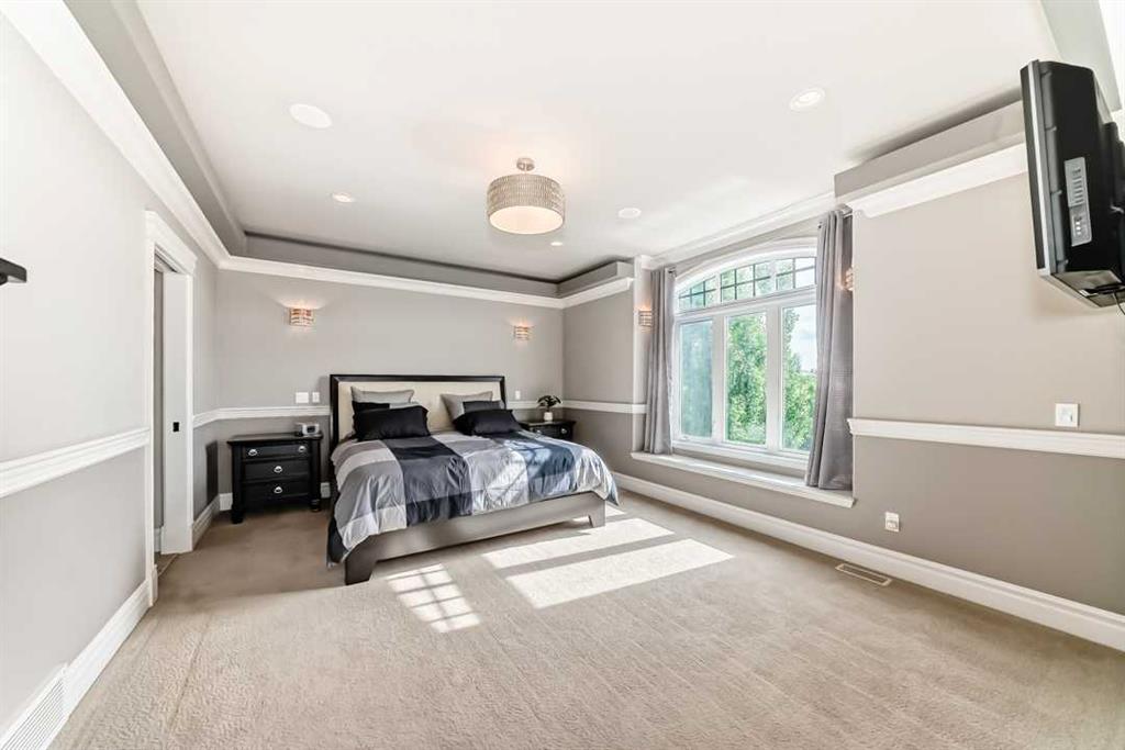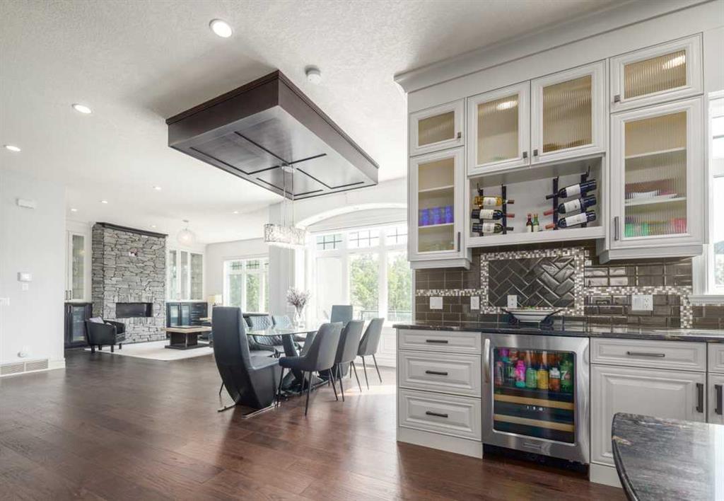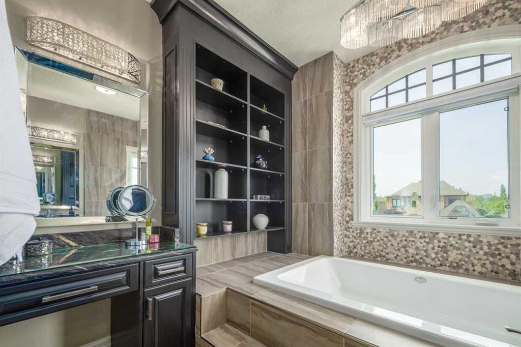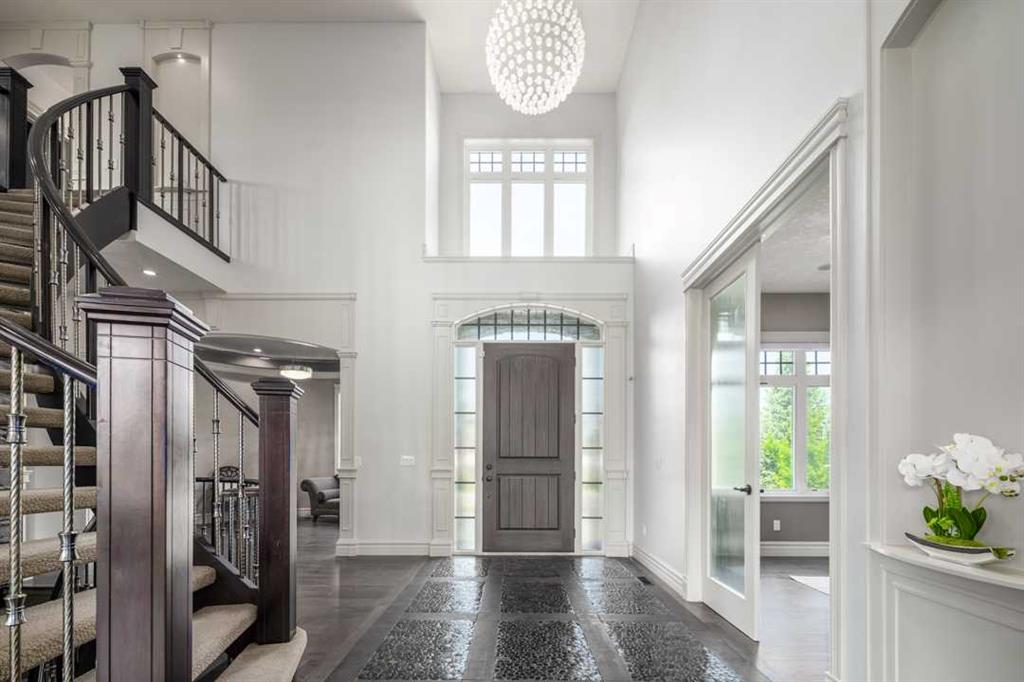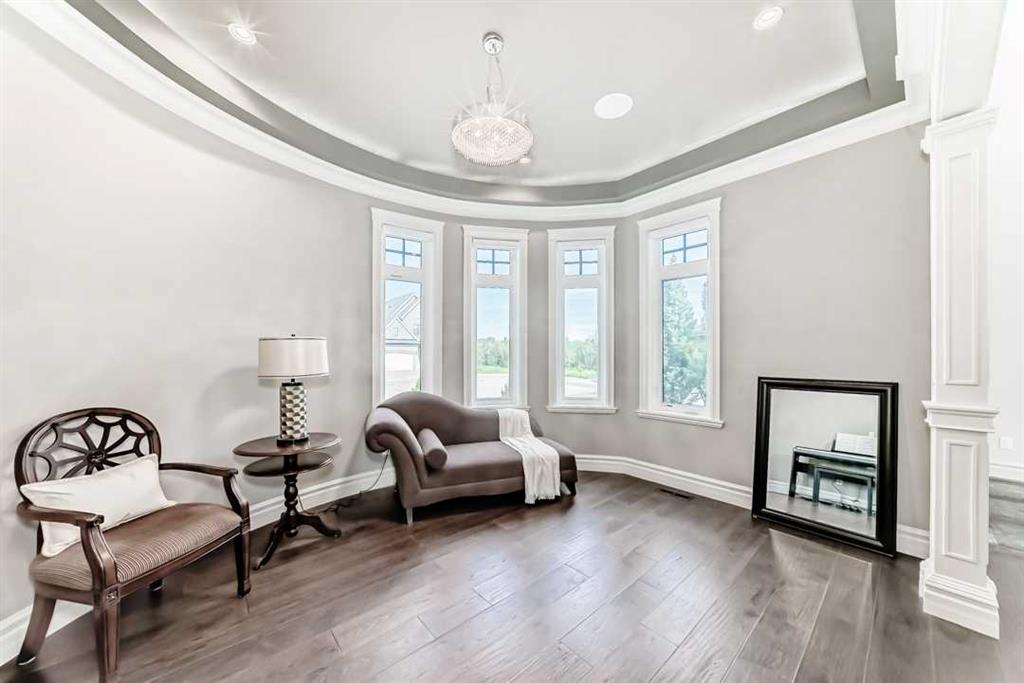 Directly backing onto a massive ravine with a private gated access to scenic walking paths nestled in a quiet cul-de-sac of the prestigious Aspen Ridge Estates, this meticulously maintained (BRAND NEW ROOF AND GUTTERS IN SEPTEMBER 2025), truly custom-built Modern French Country-inspired architectural gem exudes “Nouveau-Medieval” Castle character with a distinctive 2-storey rotunda-style front turret tower, extensive natural stonework on all four exterior elevations & a timeless design of luxurious elegant, Smoke & Pet-Free Living. Step into the grand 20-foot foyer where a crystal chandelier sparkles above custom natural pebble stone flooring, transom windows over the solid front door with sidelites & a soaring spiral open-riser staircase. Solid wood cabinetry with stylish furniture kick, custom millwork, built-ins & enclosed glass display shelves with LED lighting & premium Titanium granite, modern curved archways, wall niches & windows, flat tray ceilings with recessed & pot lighting, solidcore doors, wide-plank hand-scraped Hickory engineered hardwood flooring by Mirage, designer light fixtures & mirrors set a tone of high-end finish throughout the entire home. The 10-foot ceiling main floor showcases a gourmet kitchen featuring custom cabinetry with premium grade Titanium granite countertop, glass tile with metal 3-D mosaic backsplash, bar with built-in wine rack and cooler, and seamless flow into dining and living areas. A powder room blends luxury with natural white marble floor and walls along with a natural stone sink — mirrored in lower-level bathroom for cohesive sophistication. With 5 bedrooms 6 baths - 4 with spa-inspired ensuite each including a custom-built Kohler body massage shower, & the primary suite elevates the experience with additional steam shower, air massage tub, heated floors, & a bar with a built-in wine cooler. Upper floor features 9 to 11 foot ceilings, 4 bedrooms and a bonus room with a wetbar & built-in fridge. Fully finished walkout basement features spiral staircase, full-height display wall niches with natural stone and LED, curved decorated flat ceilings, entertaining bar with wine cellar, home theatre, game room, gym, recreation room, and a bedroom with full bath. Additional comfort features include 2 Carrier ACs and furnaces, built-in sound system and central vacuum. Step outside to the professionally landscaped backyard with a mini-golf putting green, underground sprinklers, & maintenance-free vinyl deck and stairs with tempered glass railings overlooking tranquil ravine views. Exposed aggregate concrete driveway with stamped borders, stairs, front landing, & rear patio. Oversized triple side-drive garage offers ample space for storage, a workshop, or even tandem parking for a 4th vehicle. Close to top-rated private & public schools including Rundle, Webber & Ernest Manning High School, Westside Rec Center & LRT. A true one-of-a-kind estate for those who appreciate timeless design, privacy, & a connection to nature.