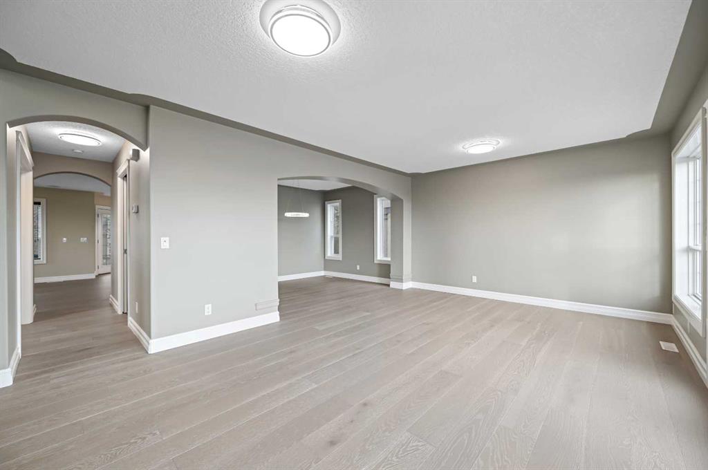 The main floor is open and airy with oversized windows and a bright front living room. French doors lead directly to a large front balcony, providing a private outdoor space for morning coffee or watching the Stampede fireworks. The kitchen blends warmth and function with solid wood cabinetry, a built-in pantry, granite countertops, and stainless steel appliances. The layout connects effortlessly to the breakfast nook, formal dining area, and family room, making it an ideal setup for both entertaining and daily family life.