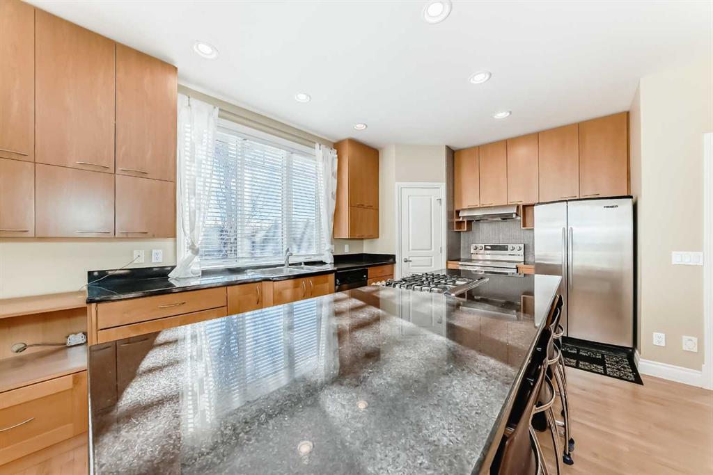 The kitchen is equipped with maple cabinetry, granite countertops, a large island, and a bright, sunny eating nook. Additional features include an oversized dry walled double garage with built in shelving. 2 decks, 2 fireplaces, maple hardwood flooring, and in-floor heating in the basement.