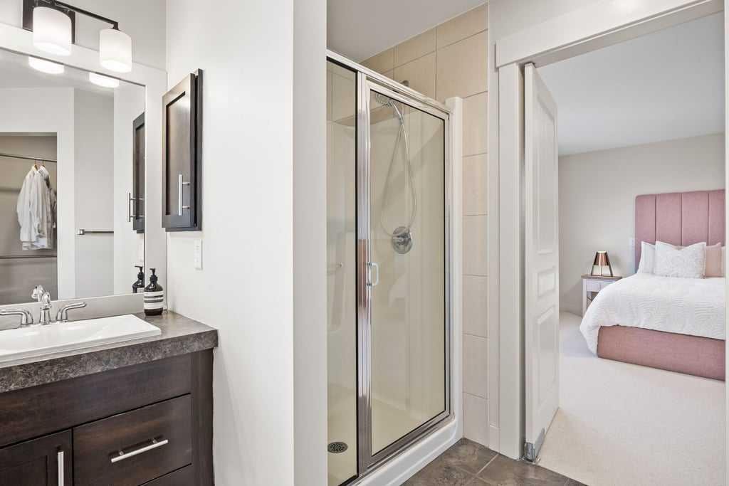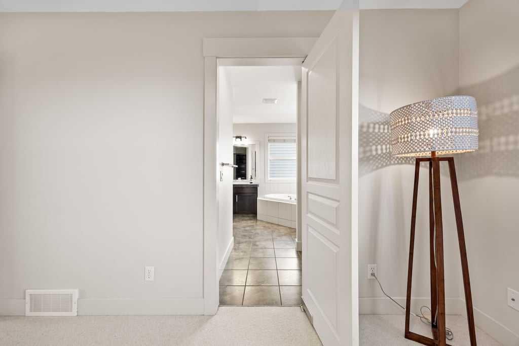 Upstairs, three generous bedrooms, a full family bathroom, and a spacious bonus room with custom decorative wood screening continue the home’s refined aesthetic. New wool carpet with premium underlay adds comfort and durability. The primary suite serves as a serene retreat, offering mountain views, a well-appointed ensuite, and solar-control window film for year-round comfort and efficiency.