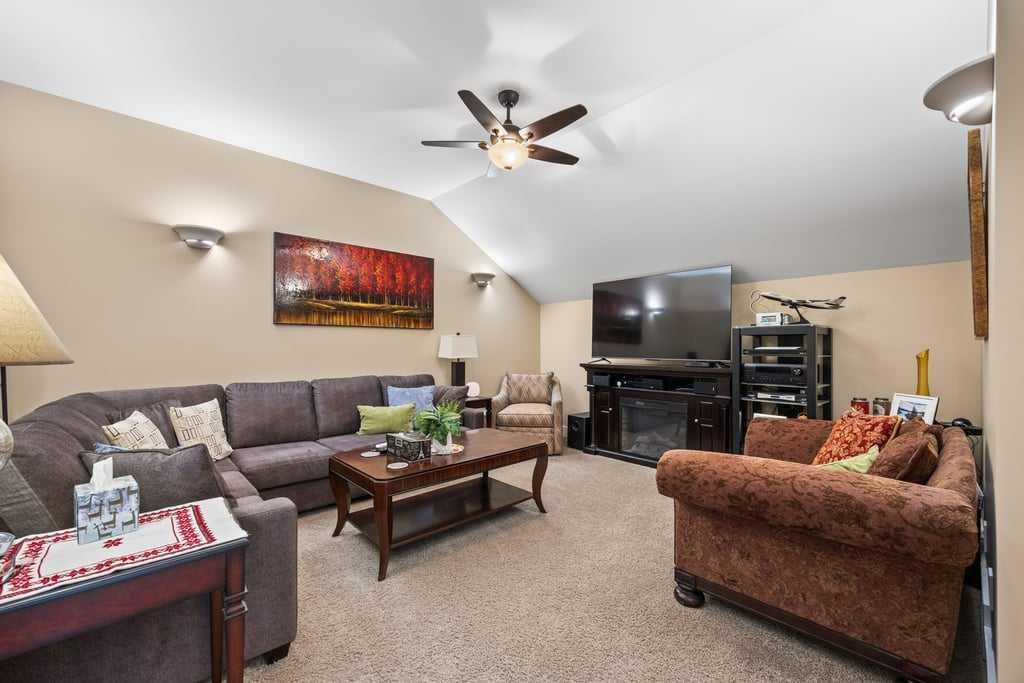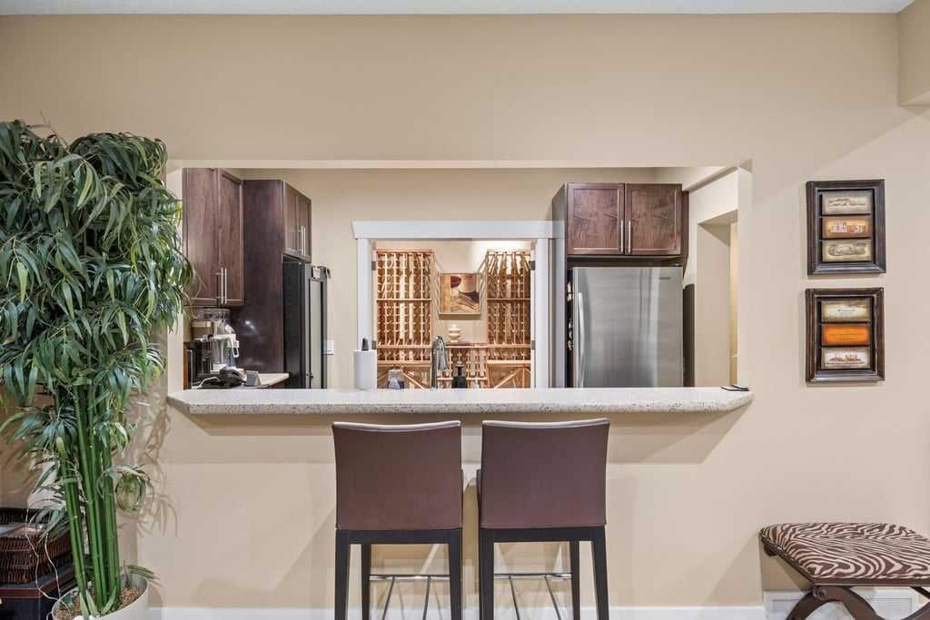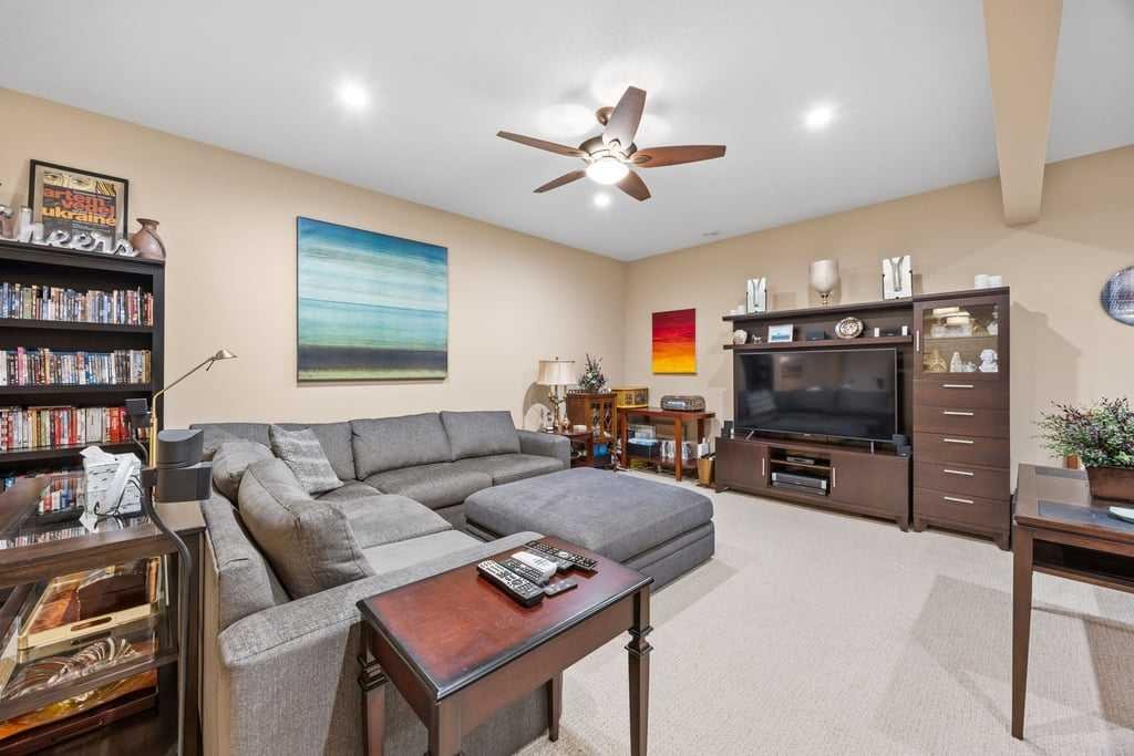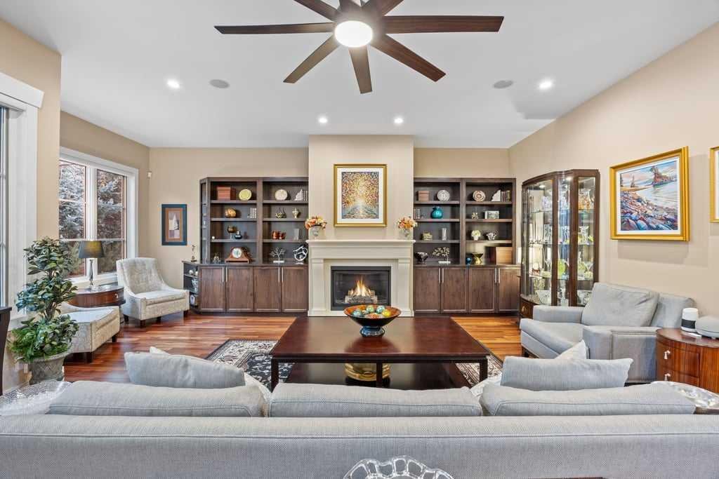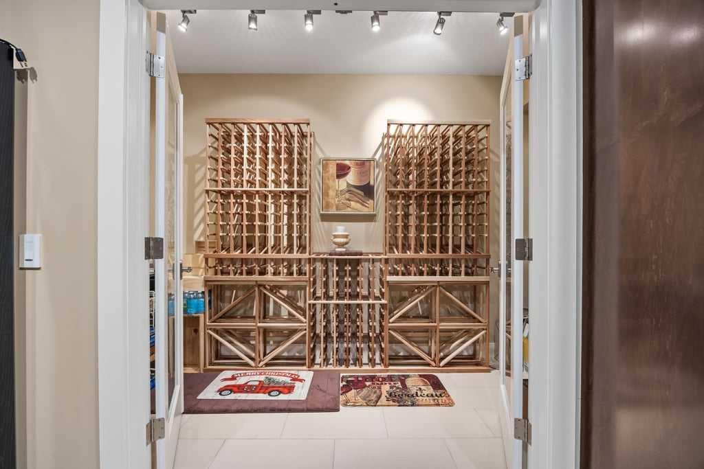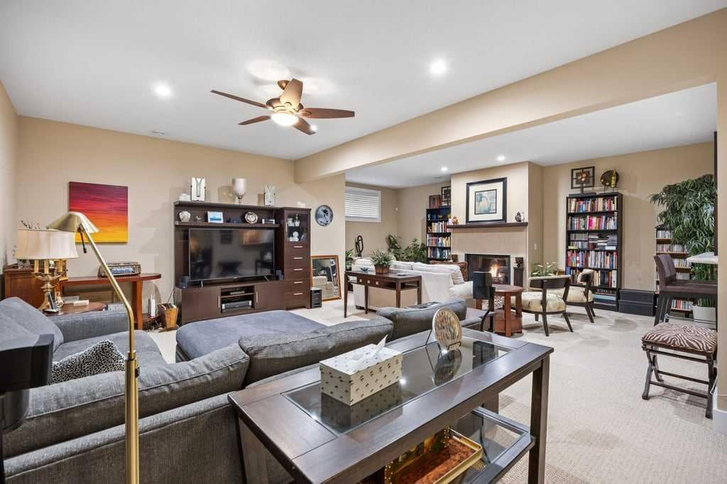 The fully developed basement is designed for relaxation and entertaining, complete with a wet bar, KitchenAid fridge with ice maker, dishwasher, and a dedicated wine cellar with built-in racks. One of three fireplaces adds warmth and ambiance, complemented by hydronic in-floor heating that extends into the heated garage with epoxy floor coating and additional overhead storage.