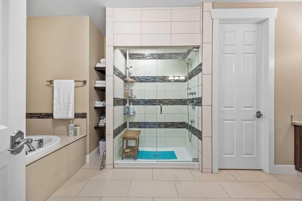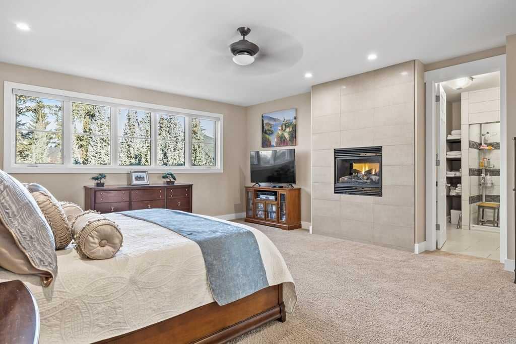 The primary suite is a true retreat, featuring a double-sided fireplace, expansive walk-in closet, and a spa-inspired ensuite with upgraded Grohe, Toto, and Kohler fixtures. Enjoy a two-person Bain Ultra thermomasseur tub with heated backs, and a luxurious shower with oversized rain head and handheld fixture.