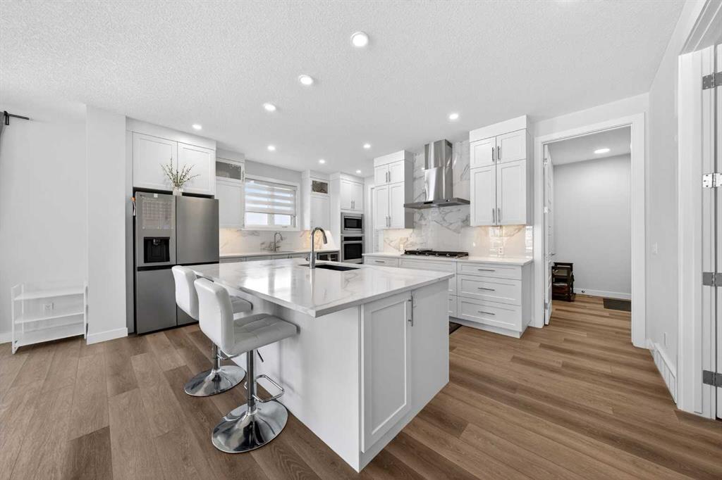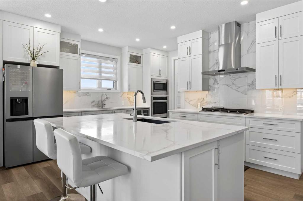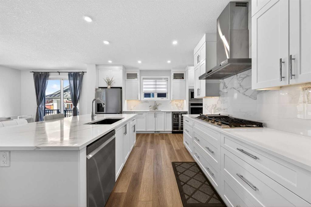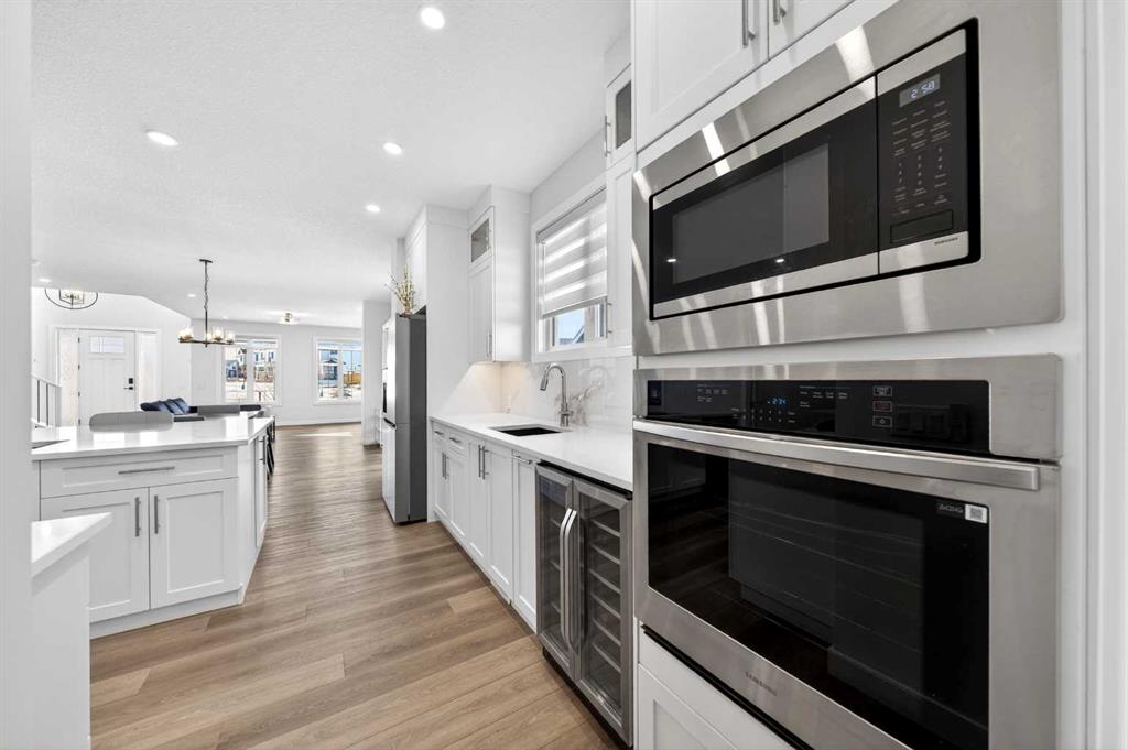 The bright open floorplan seamlessly connects the Living room, Dining room, and Kitchen—perfect for family gatherings and entertaining. The spacious Living room with south-west-facing windows floods the space with natural light. The premium gourmet Kitchen boasts quartz countertops, full-height cabinetry, stylish tile backsplash, stainless steel appliances including gas cooktop, built-in wine cabinet, built-in microwave, and built-in oven, plus a walk-through pantry connecting to the Mudroom. The Dining room provides access to your private side Patio (12’x12’) with gas hookup—ideal for outdoor dining and summer barbecues. A Den with French doors offers a quiet workspace, and a powder room completes the main level. The triple attached garage at the back with back lane access provides exceptional parking and storage space.