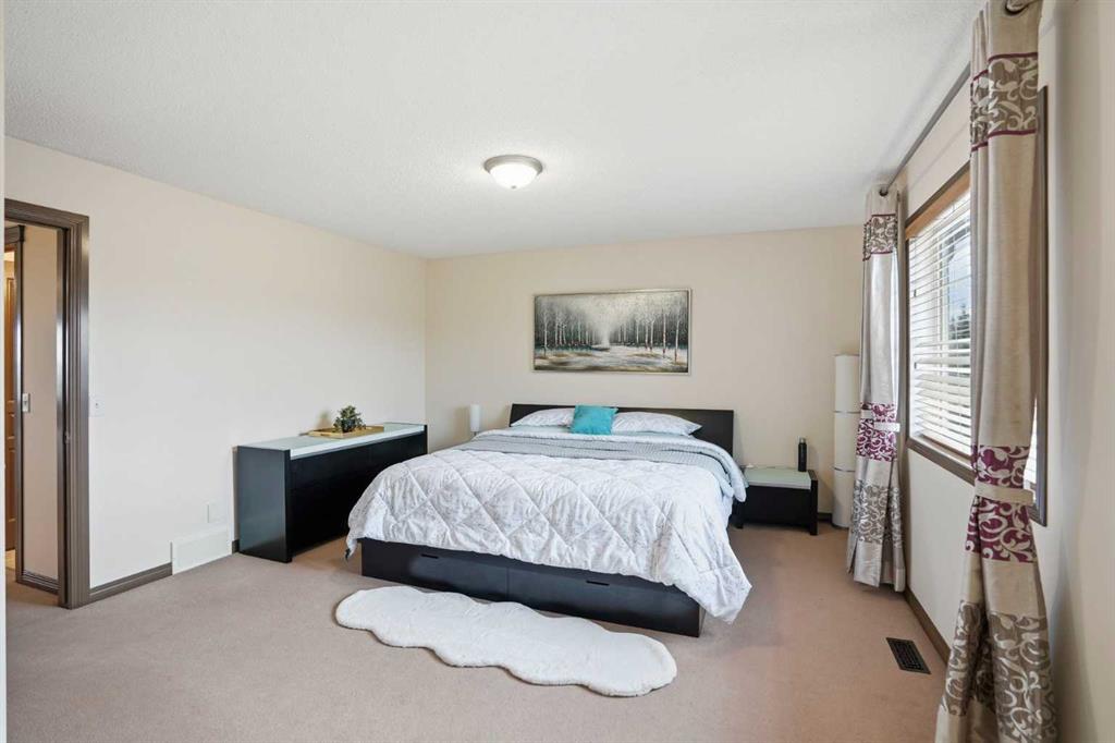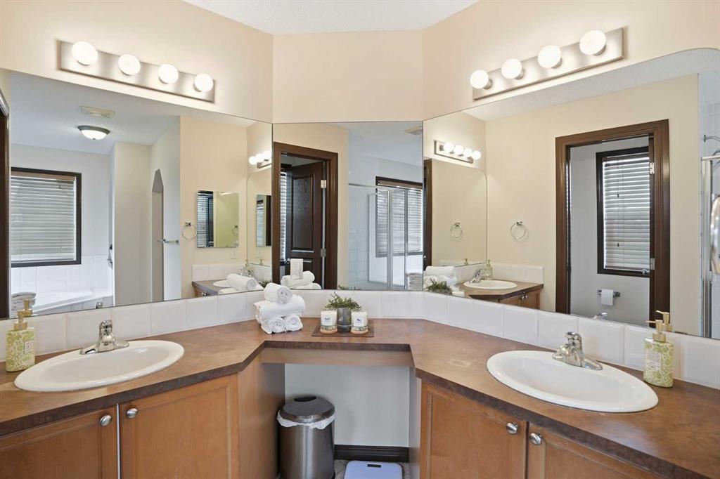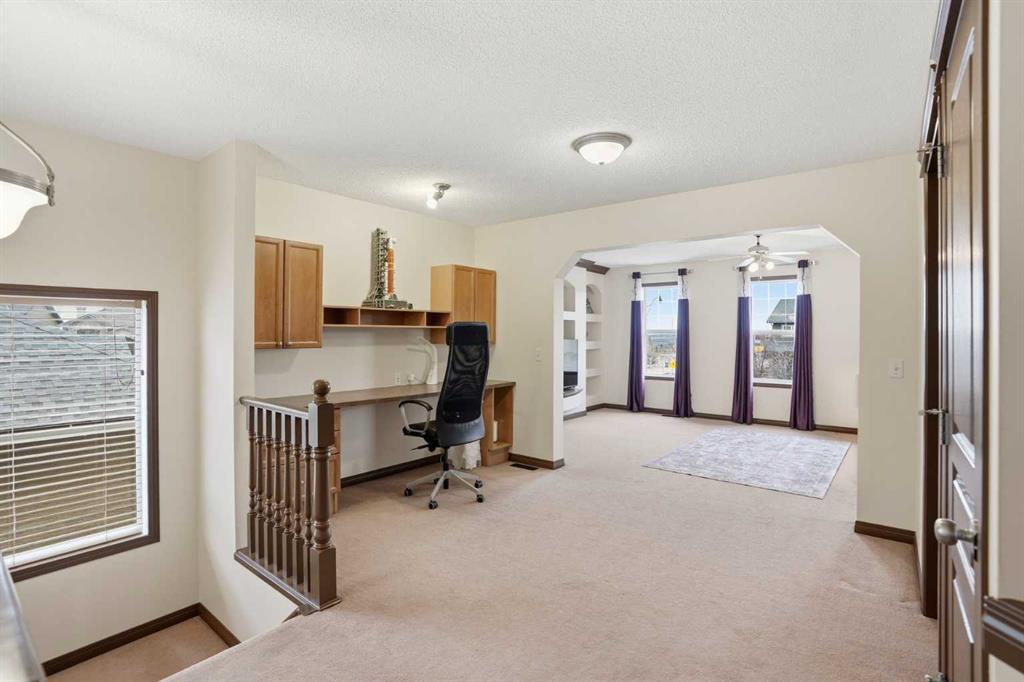 Upstairs, the primary bedroom impresses with a large walk-in closet and a 5-piece ensuite featuring double sinks, a corner soaker tub with west-facing views, a separate shower, and a private water closet. Two additional spacious bedrooms, a 4-piece bath, and a dedicated laundry room round out the upper level. The oversized bonus room features a wall of built-ins and opens to a loft with a built-in computer station. Partial mountain views to the south and west make this a space you will actually want to spend time in.