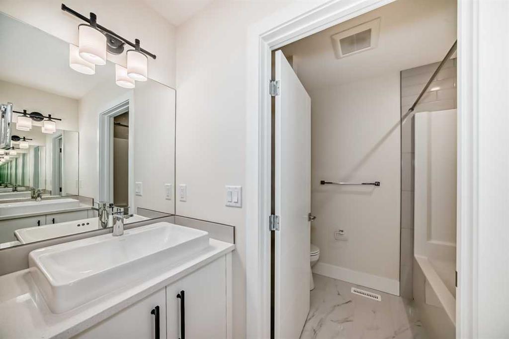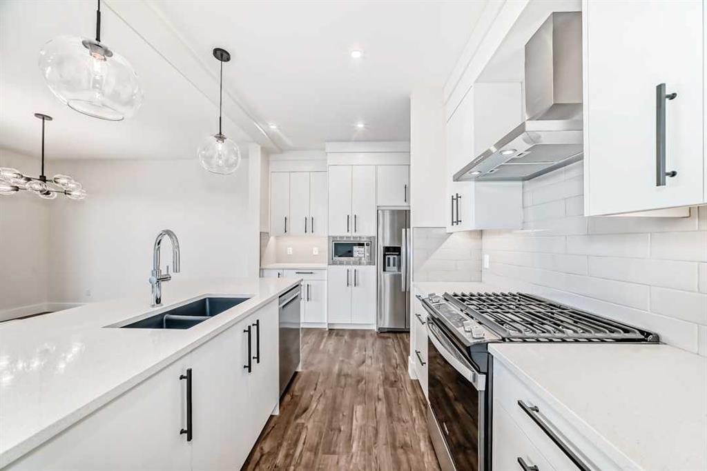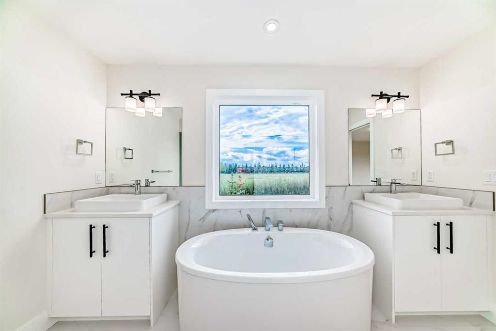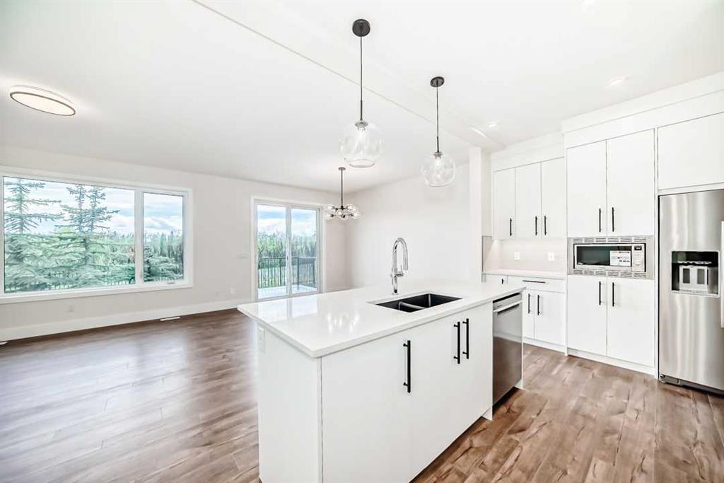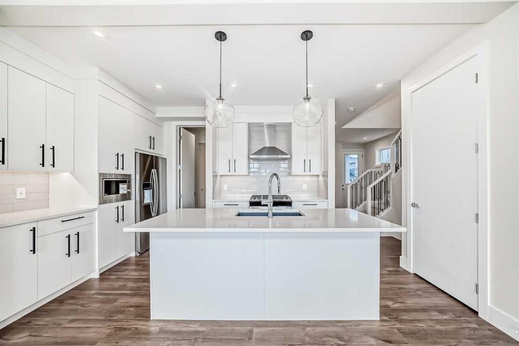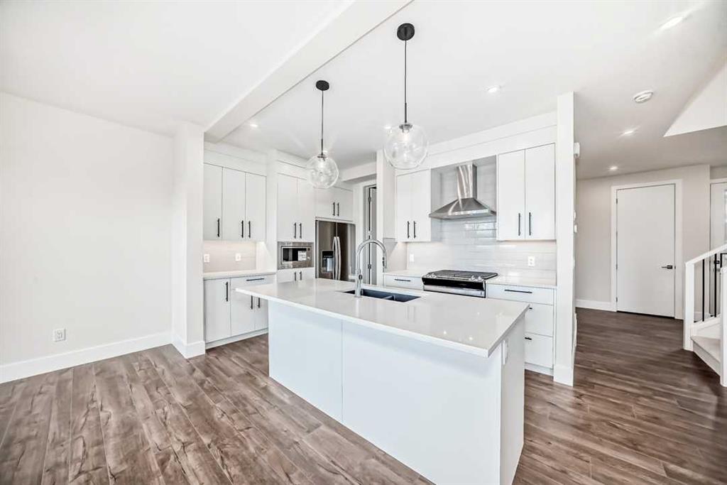 Immerse yourself in elevated living within this brand-new, never-lived-in Truman "Forte" residence, where sophistication and architectural finesse converge over 2,800 sq ft of exquisite living space. This home is a showcase of understated luxury, featuring an all-white and cream palette complemented by modern floors and striking 8 ft doors from the entry all throughout the main level accentuated by soaring 9 ft ceilings – a signature of grandeur and open space. The gourmet kitchen is a culinary sanctuary, adorned with gleaming quartz countertops, custom cabinetry with undermount lighting, and a premium stainless steel appliance package, including a gas range. The seamless flow extends to the vinyl deck – perfect for al fresco dining – complete with a gas line for BBQs. Upstairs, retreat to the serene primary suite, a sanctuary of tranquility with a 5 pc spa-inspired ensuite that exudes sophistication. Double vanities, a deep soaker tub, and a glass-enclosed shower are framed by crisp white finishes and gleaming chrome accents. Three additional bedrooms share a stunning 5 pc family bath, and a spacious bonus room offers a welcoming space for relaxation or a home office. The fully finished basement is a masterpiece of versatility, featuring a wet bar, expansive recreation room, private guest suite, and a luxurious 4 pc bathroom – all with the same exquisite design continuity. The separate entrance provides added privacy and functionality, making it ideal for entertaining or multi-generational living. The meticulously crafted exterior showcases stucco and Hardie board siding, harmonizing beauty and durability. Built to Truman’s Benchmark specifications, this home is a testament to quality, with a Vacu-Flo rough-in, security system rough-in, and a substantial 80-gallon high-efficiency hot water tank providing continuous comfort. Situated in one of Calgary’s most prestigious communities, this residence offers an unparalleled lifestyle with proximity to Aspen Landing’s upscale shopping and dining, the Westside Rec Center, and premier schools such as Webber Academy, Rundle College, and Ernest Manning High School. Discover the epitome of luxurious living where timeless design meets exceptional craftsmanship – a haven of sophistication with a palette of white and cream accented by rich, dark hardwood floors.