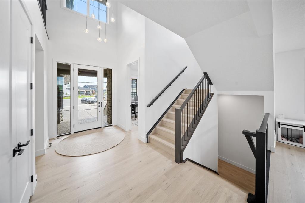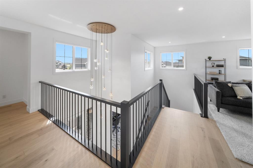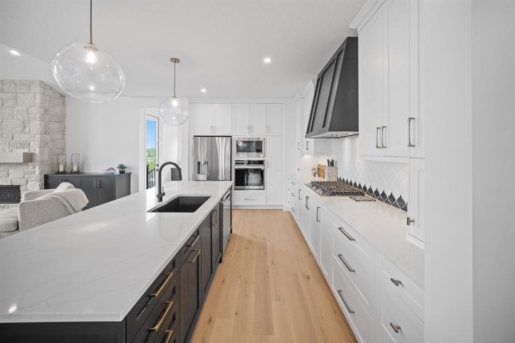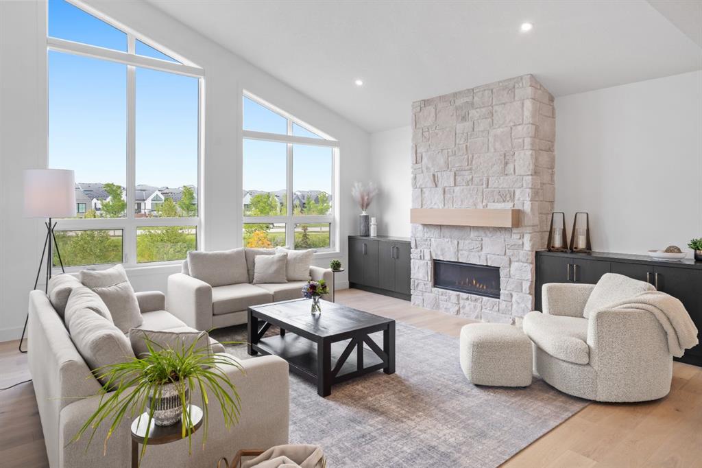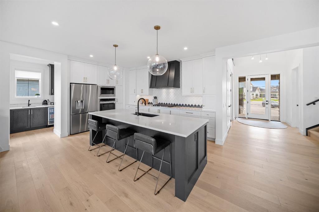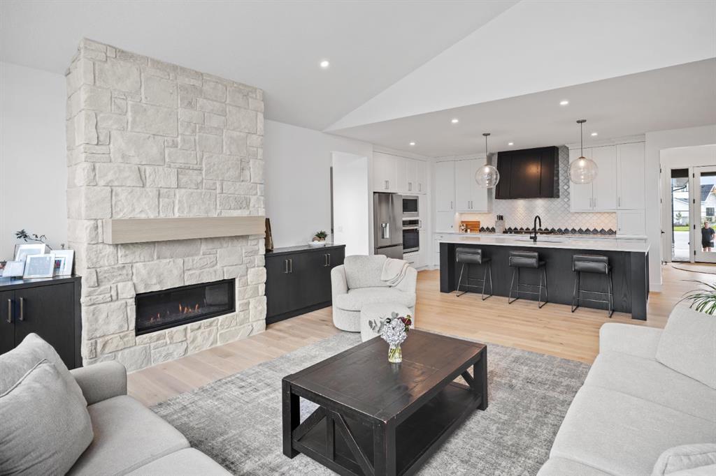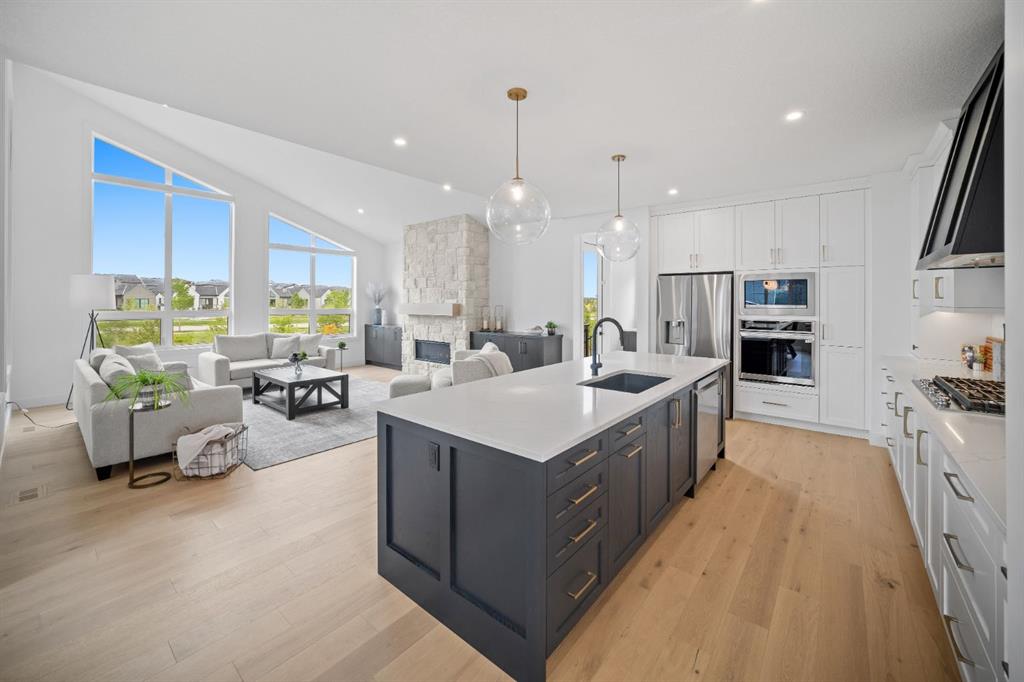 Welcome to your Baywest Built Luxury Estate Home with Private Dock Access in Harmony. Over 4,300 square feet of beautifully developed living space, this luxury estate home is where sophistication meets lifestyle, designed for those who appreciate elevated finishes, functional luxury, and custom built-ins throughout. Perfectly positioned in Harmony, this residence delivers golf course, lake, and mountain views, with a convenient rear path leading to one of the community’s most coveted amenities: a private dock and sandy beach shared exclusively by only 16 homes. Whether it’s morning paddle-boarding, a sunset glass of wine on the water, or a quick swim on a summer day, this rare feature transforms your backyard into your own lakeside escape. From the grand entrance with soaring ceilings and show-stopping light fixtures, to the blond oak hardwood throughout, the details of the home captivate. The heart of the home is the chef’s kitchen with premium appliances, gas cooktop, custom hood fan, and a large centre island that invites gathering and entertaining flowing into an airy dining space fit for casual lunches or grand celebrations. This spectacular layout flows into an impressive butler’s pantry with sink, bar fridge, custom drawers, ample counter space, and a tucked-away pantry for extra storage and seamless prep. The main living room showcases soaring vaulted ceilings and expansive windows that frame breathtaking views, anchored by a gas fireplace with bleached stonework. For milder days and evenings, the spectacular four-season sunroom offers 300 sq. ft. of indoor-outdoor living with fireplace, lighting, TV hook-up, and gas line. Upstairs, a bonus room is ideal for play, study, or Netflix. Choose your wing: the primary suite is a vogue-inspired retreat with spacious bedroom, walk-in closet, and spa-like ensuite with soaker tub and glass shower. The additional wing has two bedrooms with custom closets, a bathroom with double-sink vanity, and a laundry room with sink. The harmonious layout continues in the expansive walk-out basement, offering another bedroom, a full bathroom, and ample space for relaxation and recreation. Step directly outside to one of the largest lots in Harmony at .33 acres, large enough for a future sport court. The showstopper for automotive and recreation enthusiasts is the OVERSIZED triple heated garage. With epoxy floors, 12’ ceilings for a lift, and expansive storage, it’s designed to store multiple vehicles, watercraft, or mountain gear with ease. More features of this home include: dual A/C, two furnaces, Ecobee, and sump pump. Power blinds on all high windows are included with convenient switch control. Set steps away from Mickelson National Golf Club, LaunchPad, Harmony Lake, and close to world-class schools like The Edge Sports School, this home is more than a residence, it is your private dockside retreat, your luxury entertaining space, and your ultimate sunroom & garage space, all in one extraordinary Harmony address.