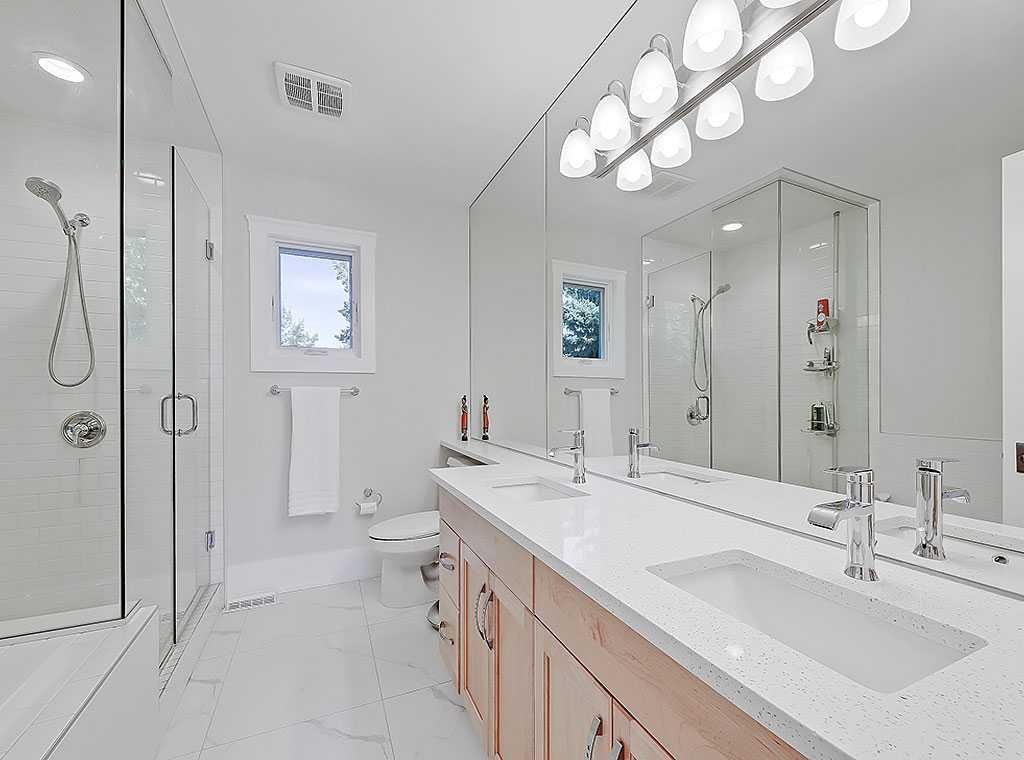 The technical infrastructure has been comprehensively modernized: a three-zone high-efficiency HVAC system with Ecobee smart thermostats and UV air purification (2023), CAT5 and coaxial wiring throughout, a 220V EV charging rough-in in the double detached garage, and fully replaced, upsized water and sewer lines with backflow prevention.