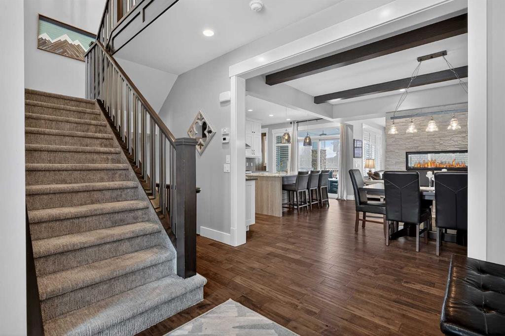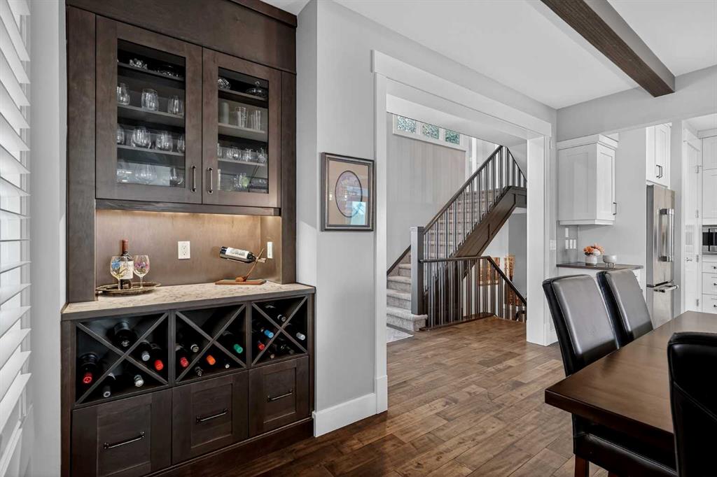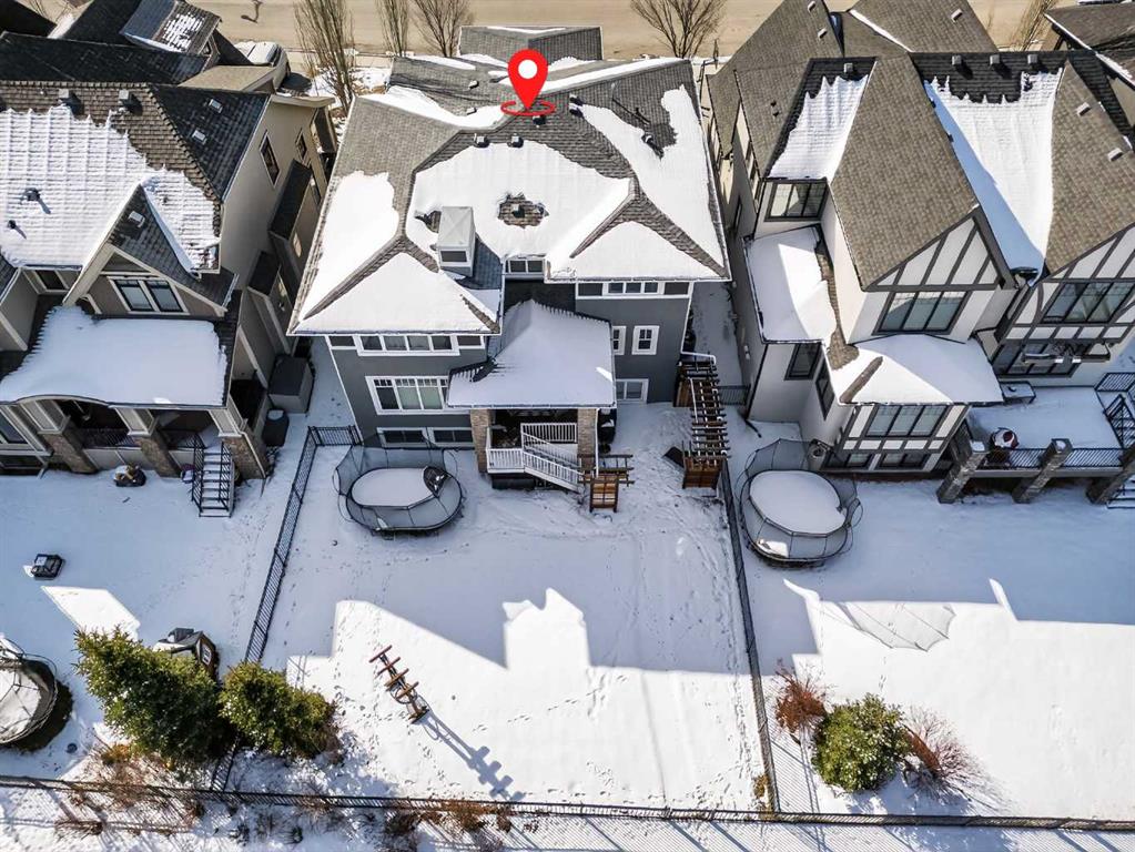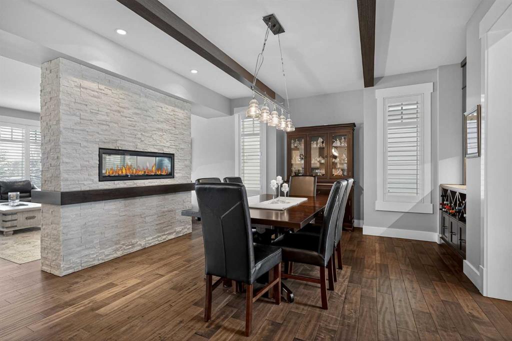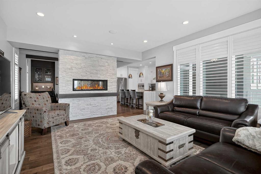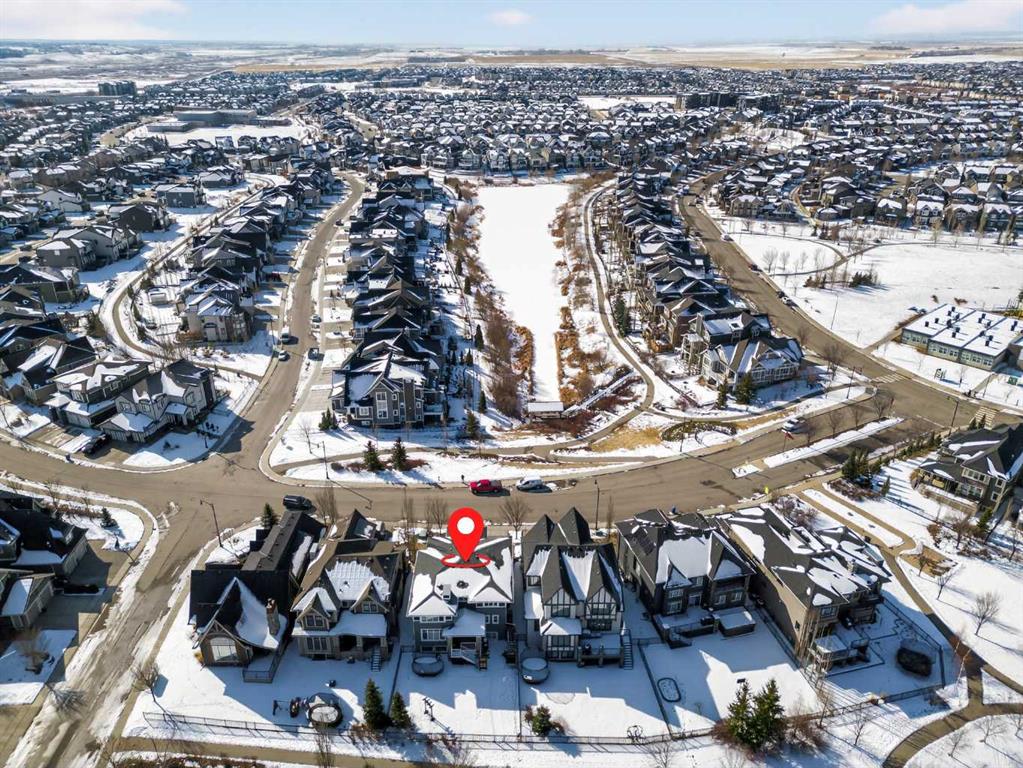 This former Crystal Creek show home is the definition of opulence and luxury. Located directly across the street from Coopers Pond, this 4 bedroom, 3.5 bathroom stunner truly has it all. Curb appeal is evident as you approach the home welcoming you before you even enter. As you come inside, you are immediately greeted with high ceilings and gorgeous wood floors that span the main level. Your eyes will be drawn to the infinite details that are impossible to miss such as the wood beams on the ceiling above your dining room, which is framed with a double-sided fireplace set into a stone wall and accompanied by a classy wine bar. The kitchen is a chef's dream equipped with ultra-high-end Viking stainless steel appliances, 2 different types of stone countertops, tons of cabinetry and drawers featuring every upgrade available when the home was constructed. The open floor plan flows from your kitchen into your dining room and through to your large living room overlooking the north facing back yard making this the perfect space for entertaining or for quiet nights at home with the family. A beautiful sliding door allows for ease of access to your large, covered deck, creating the best indoor/outdoor cooking and dining experience. Your half-bathroom with custom wallpaper and a fully equipped laundry room finish off the main level before heading upstairs. With a truly unique design feature exclusive to this home, the home office is a show piece in itself, featuring a gorgeous feature wall framing 3 large south facing windows looking over Coopers Pond and bathing the space in natural light. Your home office has been taken to a level you have never seen before! The bonus room is a great size for family movie nights and offers you a built in desk area for homework or arts and crafts. The primary suite is something you would see in a high end New York hotel and is the perfect space to make your own retreat. The bedroom itself is huge and will easily fit your king-size bed and all of the accompanying bedroom furniture. The spa inspired ensuite is to die for with gorgeous tile floors, an upgraded dual vanity, a massive soaker tub, and a walk-in shower with custom tile work and a seat. Your large walk in closet finishes off the primary suite before heading to the second and third bedrooms which are in a separate wing upstairs. Both are a great size and have direct access to the 4 piece bathroom located between the two bedrooms. The basement is fully finished and is an entertainer's dream. You have your own wet bar with a fridge as well as a games area and large living space making it optimal to host friends and family for the big game or just a game night at home. The guest bedroom is a great size and is tucked into a private corner of the basement right beside another full bathroom. This home has dual furnaces, dual air conditioners, in floor heating, a triple tandem garage ,and hot water on demand. The large lot gives you a tranquil back yard backing on to green space.