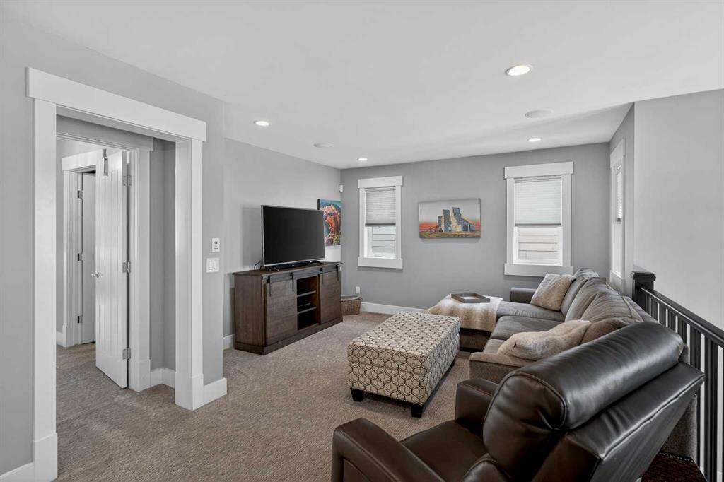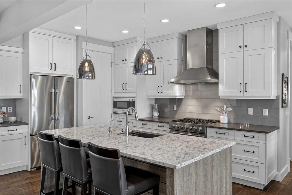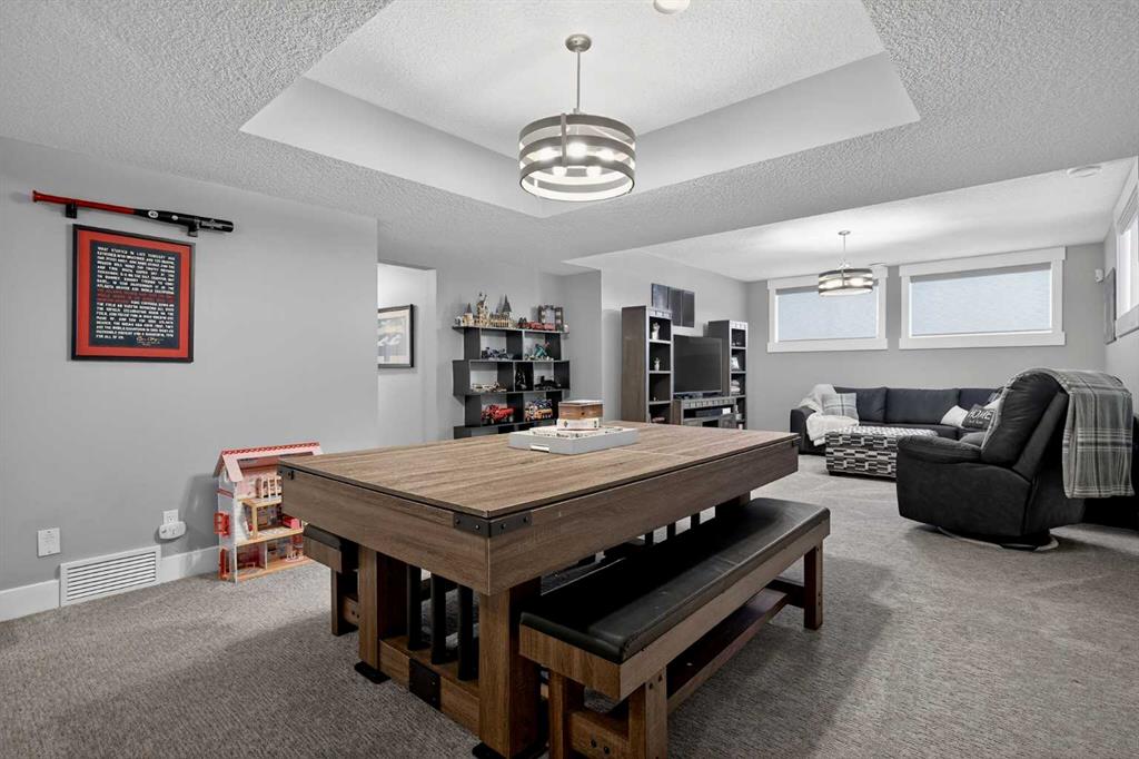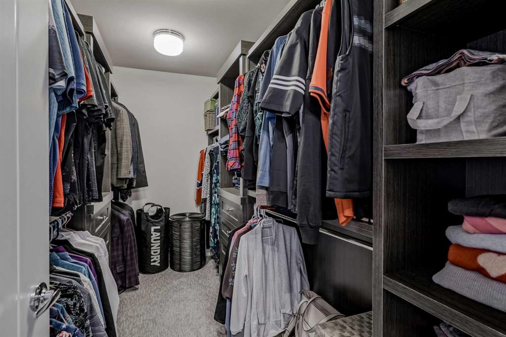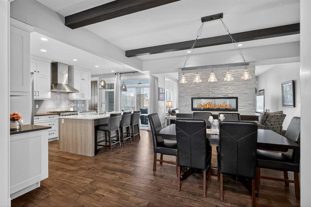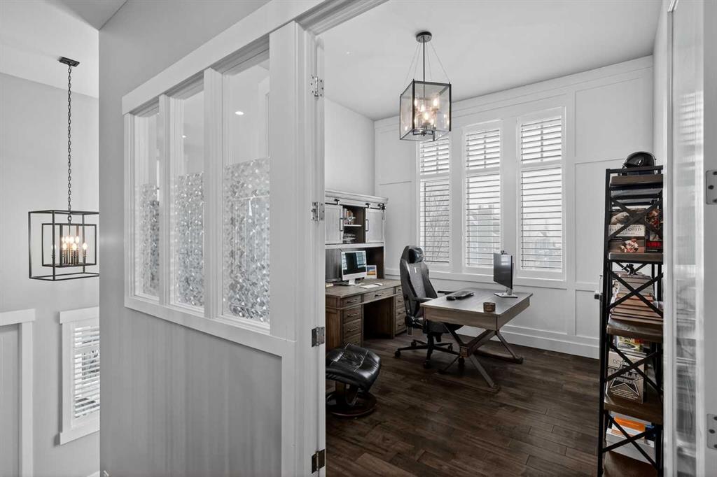 This former Crystal Creek show home is the definition of opulence and luxury. Located directly across the street from Coopers Pond, this 4 bedroom, 3.5 bathroom stunner truly has it all. Curb appeal is evident as you approach the home welcoming you before you even enter. As you come inside, you are immediately greeted with high ceilings and gorgeous wood floors that span the main level. Your eyes will be drawn to the infinite details that are impossible to miss such as the wood beams on the ceiling above your dining room, which is framed with a double-sided fireplace set into a stone wall and accompanied by a classy wine bar. The kitchen is a chef's dream equipped with ultra-high-end Viking stainless steel appliances, 2 different types of stone countertops, tons of cabinetry and drawers featuring every upgrade available when the home was constructed. The open floor plan flows from your kitchen into your dining room and through to your large living room overlooking the north facing back yard making this the perfect space for entertaining or for quiet nights at home with the family. A beautiful sliding door allows for ease of access to your large, covered deck, creating the best indoor/outdoor cooking and dining experience. Your half-bathroom with custom wallpaper and a fully equipped laundry room finish off the main level before heading upstairs. With a truly unique design feature exclusive to this home, the home office is a show piece in itself, featuring a gorgeous feature wall framing 3 large south facing windows looking over Coopers Pond and bathing the space in natural light. Your home office has been taken to a level you have never seen before! The bonus room is a great size for family movie nights and offers you a built in desk area for homework or arts and crafts. The primary suite is something you would see in a high end New York hotel and is the perfect space to make your own retreat. The bedroom itself is huge and will easily fit your king-size bed and all of the accompanying bedroom furniture. The spa inspired ensuite is to die for with gorgeous tile floors, an upgraded dual vanity, a massive soaker tub, and a walk-in shower with custom tile work and a seat. Your large walk in closet finishes off the primary suite before heading to the second and third bedrooms which are in a separate wing upstairs. Both are a great size and have direct access to the 4 piece bathroom located between the two bedrooms. The basement is fully finished and is an entertainer's dream. You have your own wet bar with a fridge as well as a games area and large living space making it optimal to host friends and family for the big game or just a game night at home. The guest bedroom is a great size and is tucked into a private corner of the basement right beside another full bathroom. This home has dual furnaces, dual air conditioners, in floor heating, a triple tandem garage ,and hot water on demand. The large lot gives you a tranquil back yard backing on to green space.