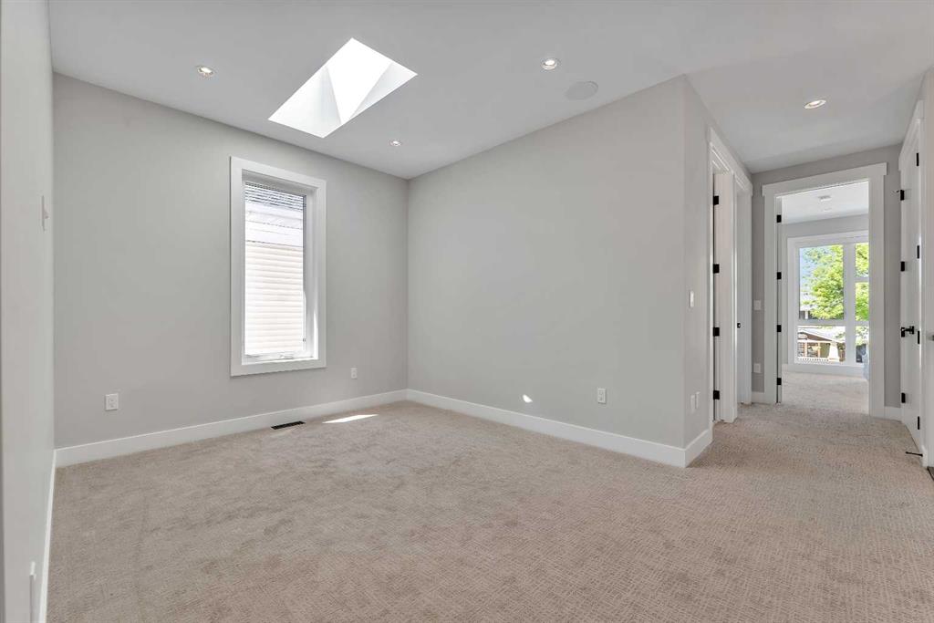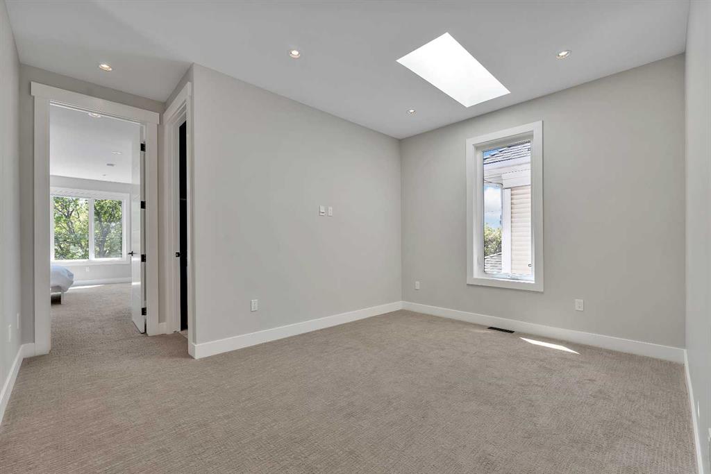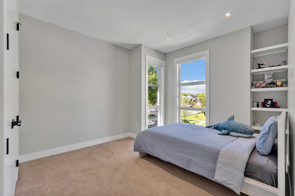 The primary suite is a true retreat with dual-aspect windows, a boutique-style walk-in closet with LED rails and a spa-like ensuite featuring a soaker tub, steam shower, dual vanities and heated tile floors – an ideal place to unwind. Two additional bedrooms include custom built-ins and enormous windows, and a well-appointed main bath designed for family comfort.