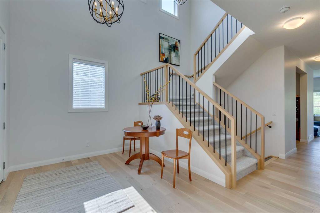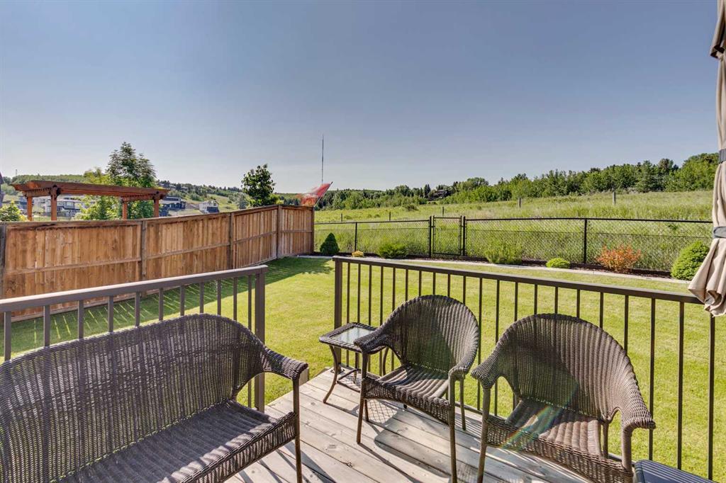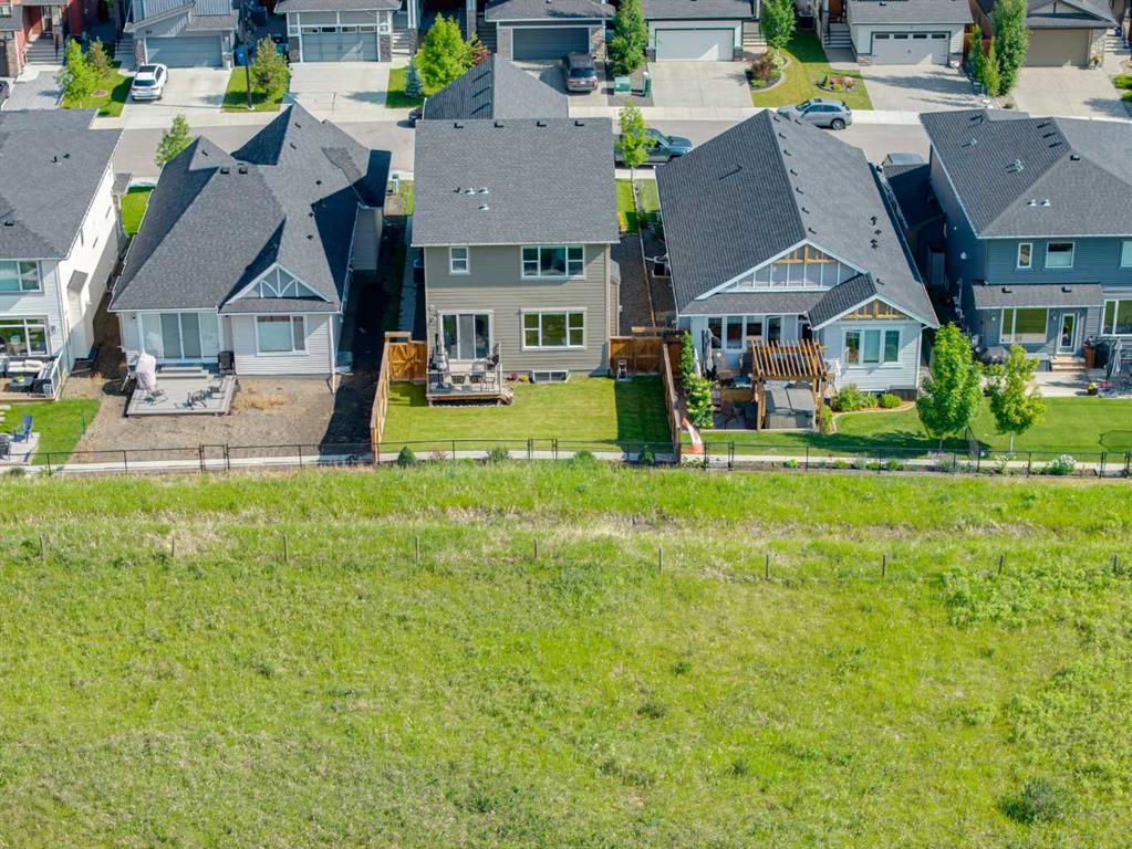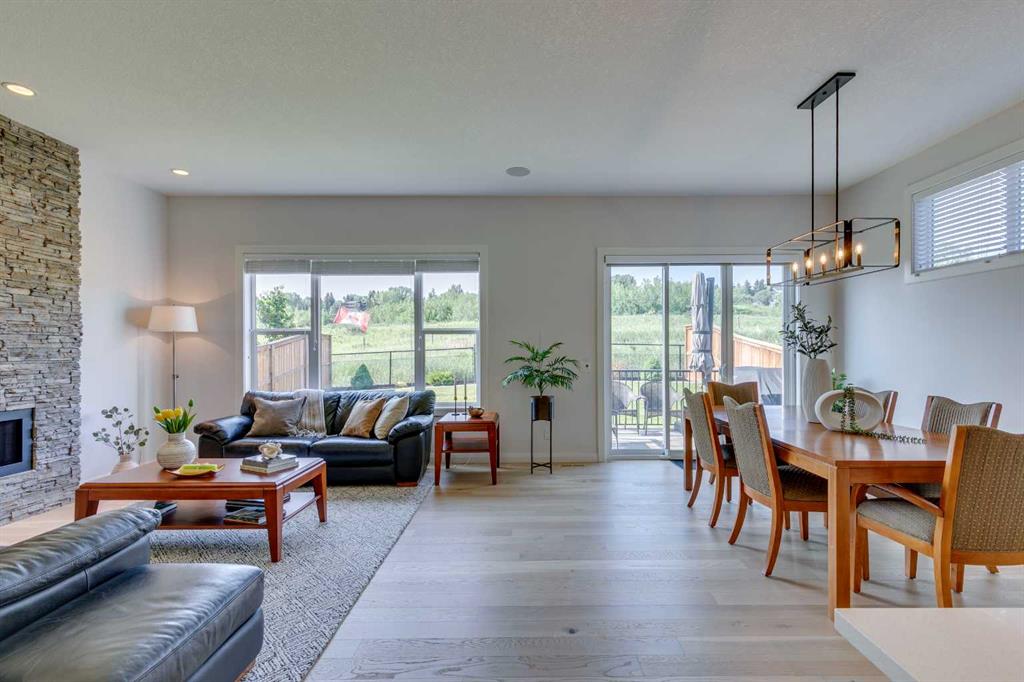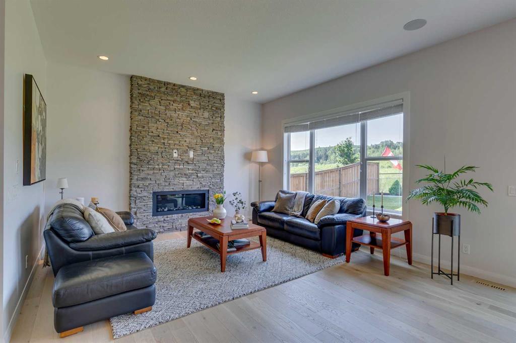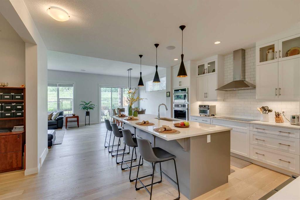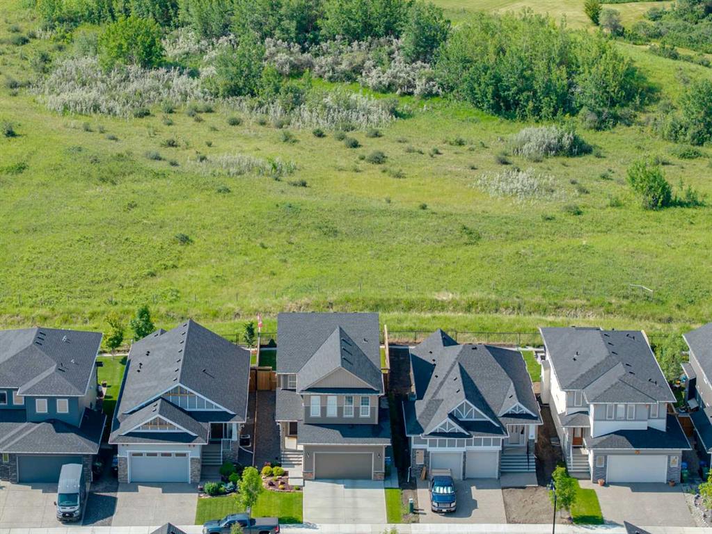 Backed by a natural foothills green space and styled with chic, airy design details, this home is the perfect balance of serenity and style. Step into a foyer with a soaring ceiling, wide plank light-toned hardwood floors and a palette of gentle neutrals, creating an inviting first impression of what lies beyond. With its open concept layout, ten foot ceiling and wall of windows framing the views to the outside, the main floor is designed for togetherness. Relax in front of the welcoming living room fireplace with stone facade. Host memorable meals in the dining room, where doors out to the deck make al fresco dining dining an effortless extension of your celebrations. At the heart of the home, the contemporary two-toned kitchen features quartz counters, subway tiles, cabinets to the ceiling, and upgraded appliances including an induction cooktop and a large central island for everyone to gather around. Whether it’s brewing your morning coffee or pouring a glass of wine with friends, the bar area with beverage fridge and wine storage is a daily luxury for your morning ritual or for serving signature cocktails. Through the reeded glass door of the pantry you can easily access the mudroom and garage, making grocery unpacking effortless. A versatile office provides a quiet retreat for work or study. At the top of the stairs on the second floor is a bright, open loft ideal for family movie nights, game hangouts or for children to play. The spacious primary bedroom is a true escape, with a sweeping view of the hillside, dual walk-in closets and an ensuite featuring double vanities, a soaking tub and a large shower. On the opposite wing, two additional bedrooms offer privacy, complimented by a convenient laundry room and a bathroom with dual sinks. The undeveloped basement contains a rough-in for a future bathroom and endless potential to customize and grow with your needs. Outside, the private south-facing yard is fully fenced, and has been thoughtfully landscaped with shrubs and a programable irrigation system. This home was built by Broadview Homes a higher calibre builder with many upgrades including light fixtures, carpet underlay, wiring, insulation, and foundation protection. Extra bonuses include: A/C, CAT6, flush-mount speakers, motorized shades, Kinetico water softener and de-chlorinator, water re-circulating system, utility sink and floor drain in garage, and radon gas exertion system. The neighbourhood is in a convenient location with easy access to Stoney Trail and the Trans-Canada making getting around the city or out to the mountains a breeze. Hiking Trinity Hills, shopping the Calgary Farmer’s Market, enjoying the year round sporting facilities at Winsport, or exploring the local pathways and parks are just a few of the great lifestyle amenities this location has at its doorstep. This is where families will gather, grow and thrive!