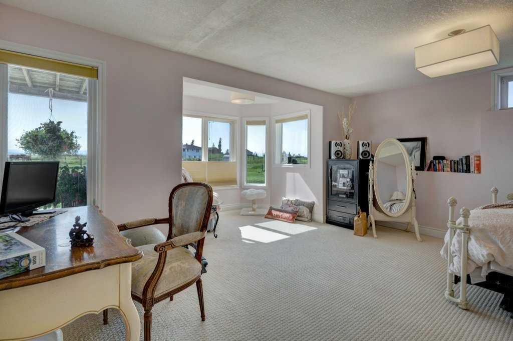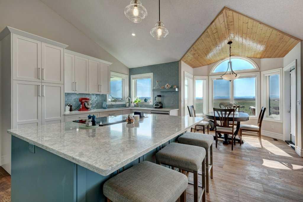 The kitchen offers both style and function with stainless steel appliances, quartz countertops, a bold blue tile backsplash, garburator, stylish pendant lighting, and a large island with breakfast bar seating. The smart layout and ample cabinetry make it ideal for everyday living and entertaining. From here, step onto one of two expansive decks; one covered and equipped with a gas hookup for year-round BBQing. The second deck also connects to the private primary bedroom, offering peaceful views across the prairies.