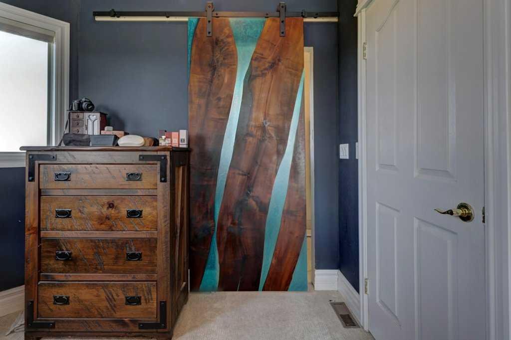 The primary bedroom features vaulted ceilings, a gas fireplace, and a custom California Closet. The spa-inspired ensuite is a true showpiece, showcasing a live-edge black walnut vanity with a waterfall leg and mortise & tenon joinery, a rainfall shower, heated towel rack, and handcrafted maple sliding door. A main floor office, perfect for remote work, and a two-piece guest bath complete this level.