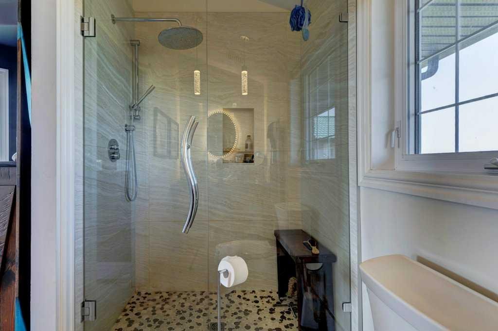 Step into the bright and spacious main floor, where vaulted ceilings and floor-to-ceiling windows invite natural light to pour in. The home features beautifully crafted 7” wide French oak plank flooring with an oil finish that adds warmth and richness to the space. The living room is an inviting area centered around a gas fireplace with a striking glass tile surround and a custom black walnut mantle; a truly premium detail that sets the tone for the quality throughout.