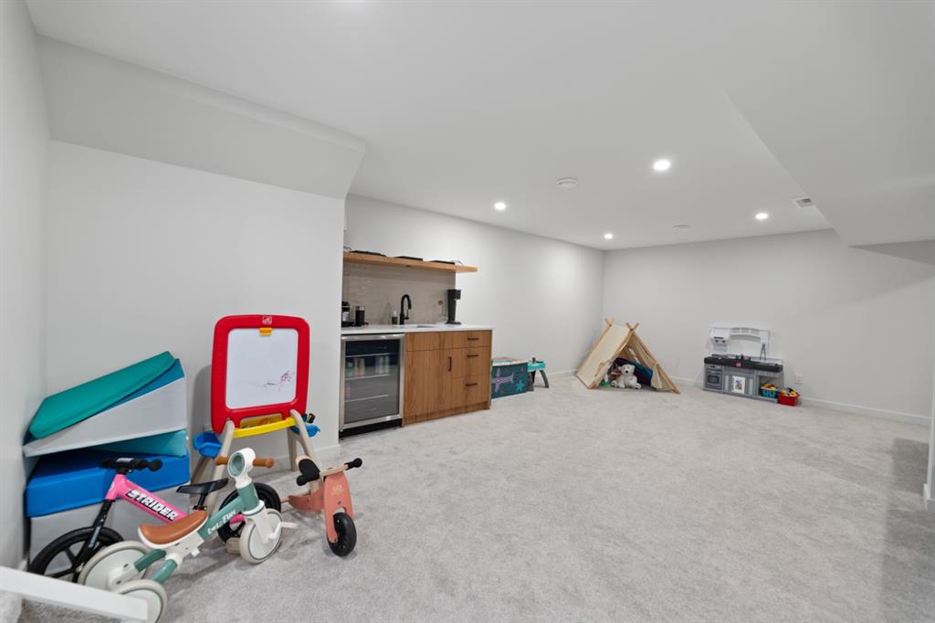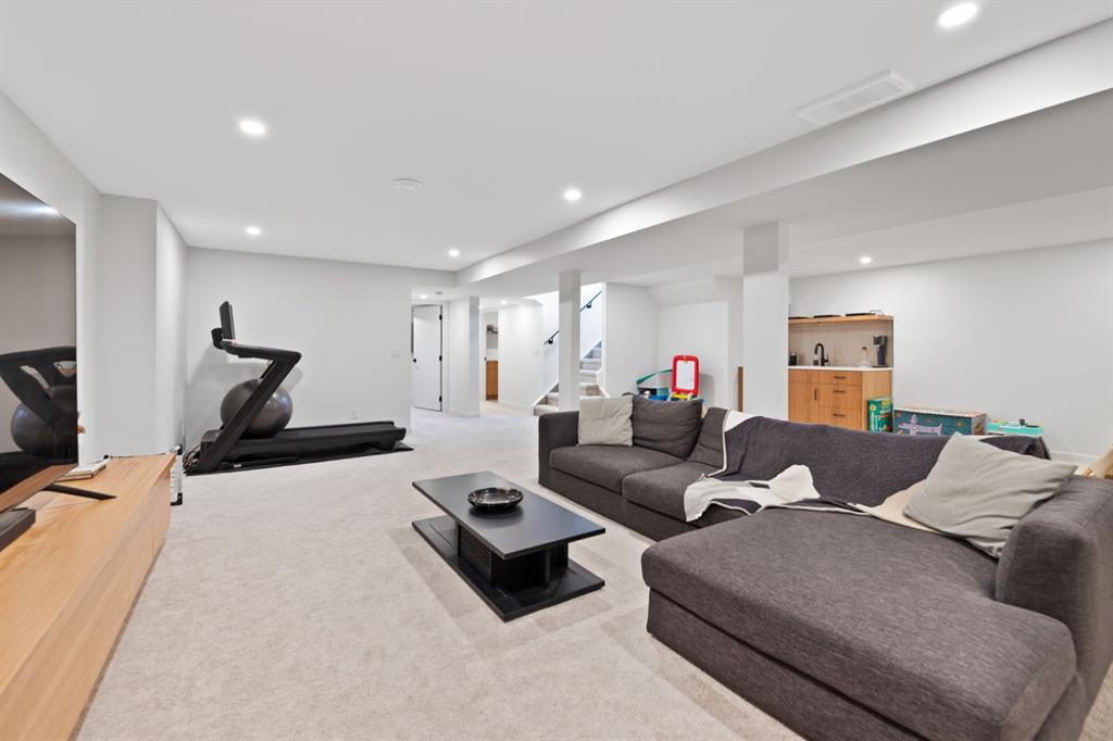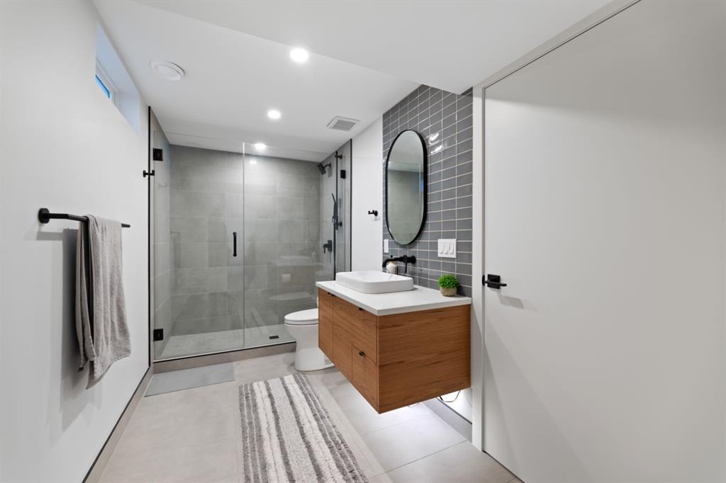 The fully finished basement extends the home’s living space with a generous recreation room, a stylish bar area, a well-equipped laundry room and a fifth bedroom featuring a walk-in closet. Another full four-piece bathroom with in-floor heating completes the lower level, making it ideal for guests or multi-generational living.