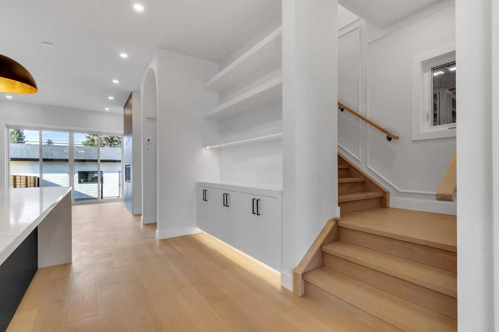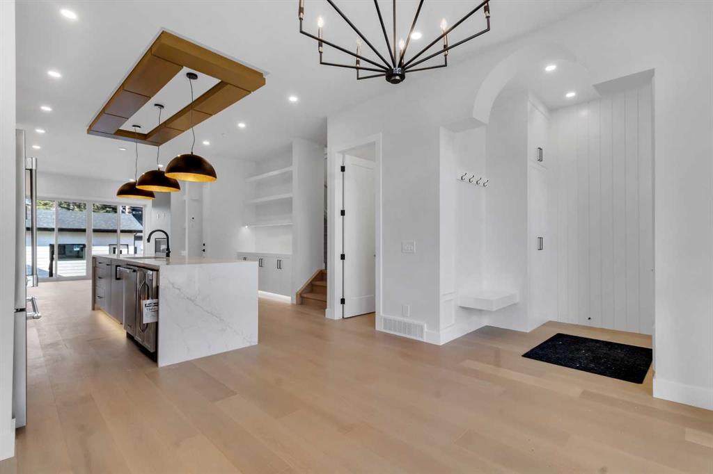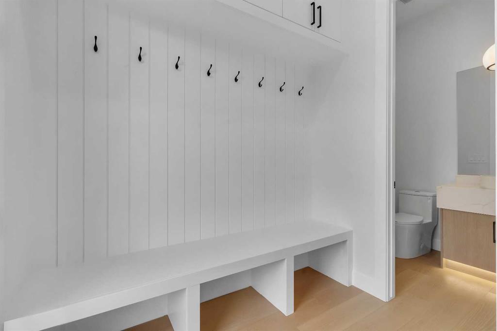 The chef inspired kitchen is a true showpiece, featuring a massive quartz island, built in Frigidaire Professional Series appliances, a custom slat hood fan, bar fridge, and extensive full height cabinetry with pull out storage. Integrated LED lighting throughout the kitchen, including toe kick, under cabinet, floating shelf, and glass front upper lighting, adds both function and ambiance. A dedicated home office with a built in desk and under lit floating shelves is positioned near the entry. At the rear, a well designed mudroom with bench seating and coat hooks leads to a stylish powder room with a floating vanity and pendant lighting.