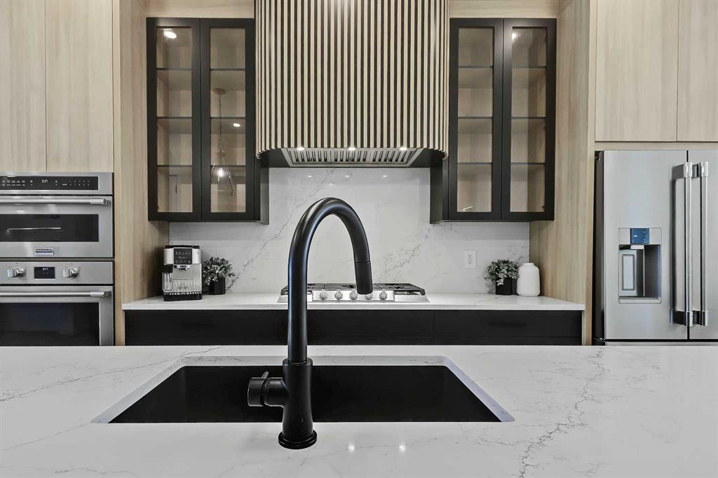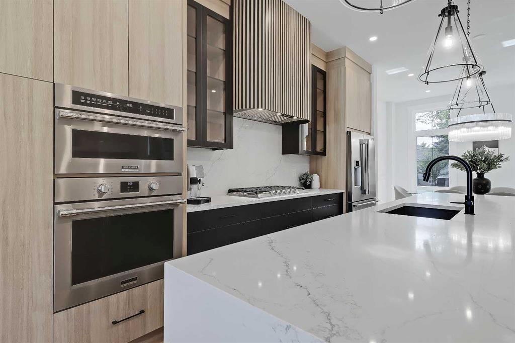 The chef’s kitchen is a showstopper, complete with premium stainless steel appliances, a custom range hood, quartz countertops, a central island with seating, and full-height cabinetry.