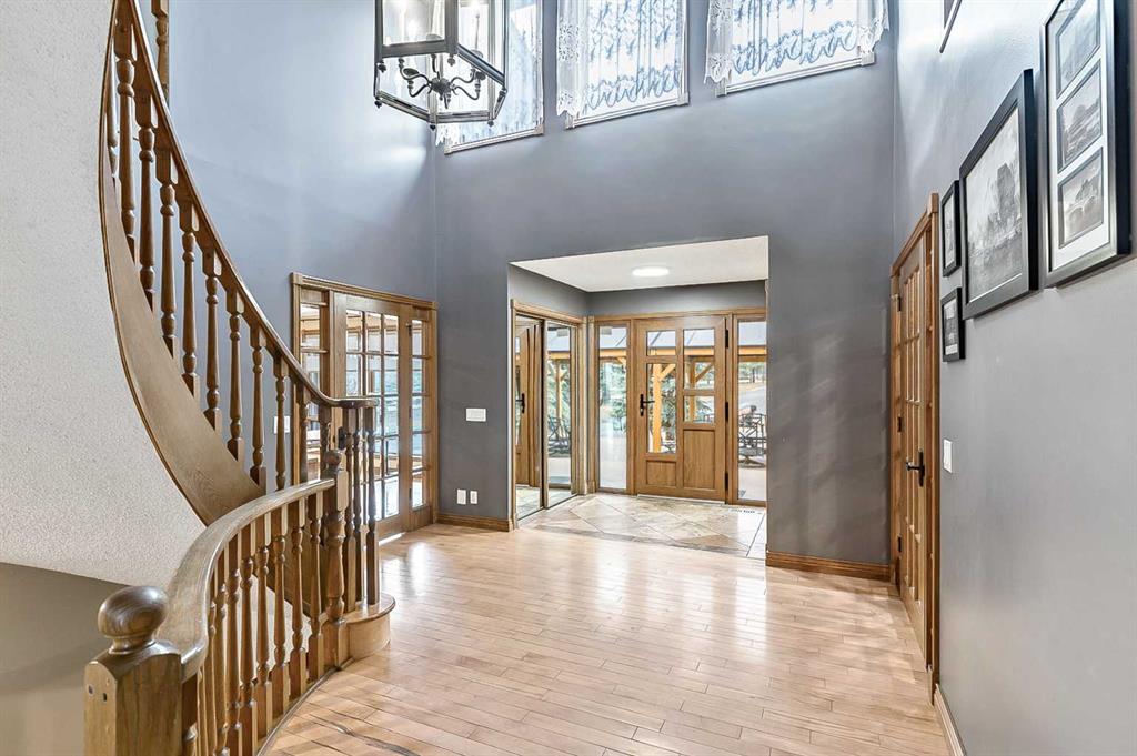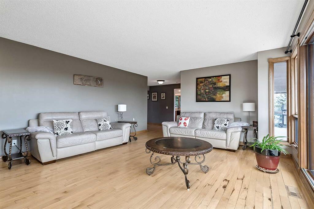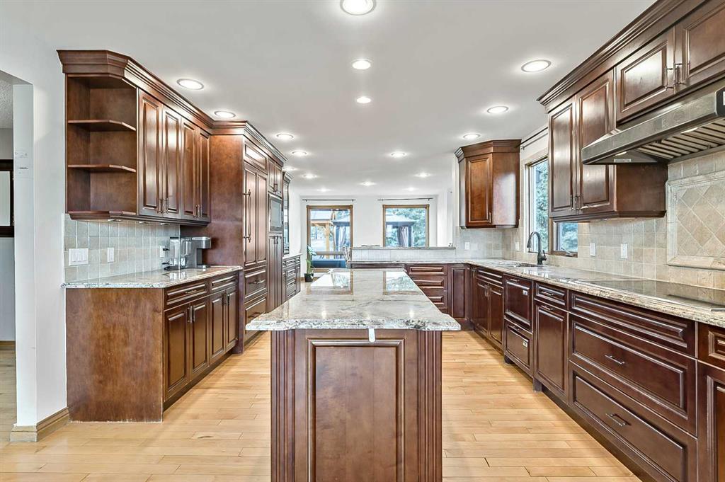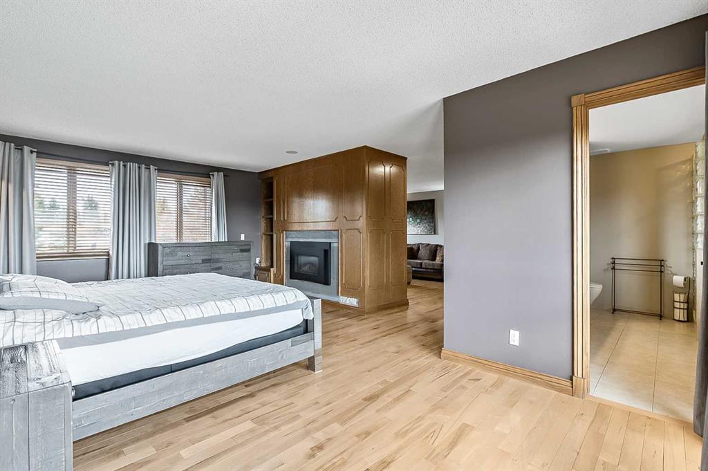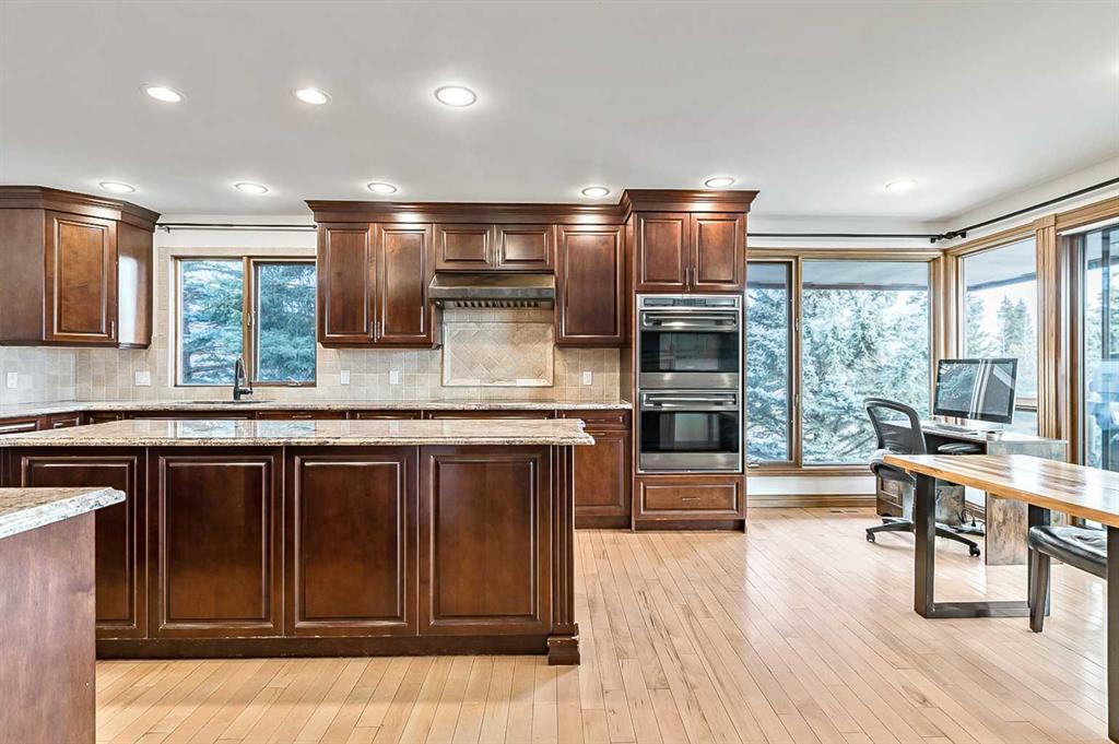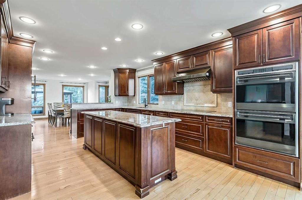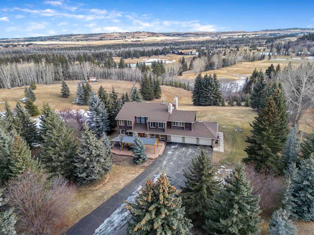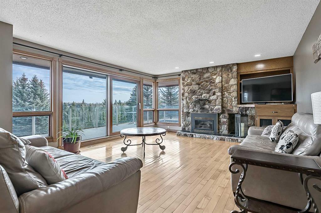 VIEWS VIEWS VIEWS! Welcome to this exceptional seven-bedroom, three-and-a-half-bathroom estate home in the prestigious Elbow River Estates community. Offering over 3,700 square feet of thoughtfully designed living space, this impressive two-storey residence is perfectly positioned on a premium lot capturing fantastic mountain views from the front and sweeping, unobstructed panoramas over the Glencoe Golf Course from the rear. A grand two-storey foyer with a graceful, curved staircase sets an elegant tone upon arrival. The main level is designed to highlight the scenery, featuring a warm and inviting living room with a wood-burning fireplace and large windows that frame the picturesque surroundings. The formal dining room, highlighted by a charming bump-out, provides an ideal setting for hosting. The beautifully updated kitchen is appointed with granite countertops, oak cabinetry, stainless steel appliances, and a built-in desk, all while enjoying serene backyard views. The adjoining family room, centered around a cozy gas fireplace, opens through sliding doors to a spacious deck—an outstanding vantage point to take in the spectacular golf course vistas and unforgettable sunsets. Upstairs, the primary suite offers a luxurious private retreat enhanced by beautiful views and a two-sided gas fireplace that separates the sleeping area from a tranquil sitting space. Four additional generously sized bedrooms and a full bathroom complete the upper level, offering comfort and flexibility for family or guests. The fully developed walkout lower level continues to impress with stunning, uninterrupted views of the golf course, along with an additional bedroom, recreation room, den, wine room, and abundant storage and utility areas. Step outside to enjoy the peaceful setting and expansive open landscape beyond. A triple attached garage and a well-designed mudroom with laundry and built-in storage add everyday convenience. Residents of Elbow River Estates enjoy access to exceptional community amenities including a playground, tennis and basketball courts, a seasonal outdoor rink, and a community horse arena—all just minutes from Calgary. Nearby Clearwater Park and Calgary Academy further enhance this highly desirable location. This is a rare opportunity to own a remarkable home defined by space and truly fantastic views in one of the area’s most sought-after communities!