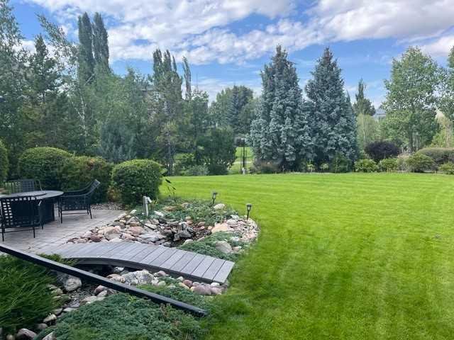 Executive WALKOUT BUNGALOW on a private OVERSIZED LOT in a park-like setting. Located in Elgin Estates BACKING ONTO WALKING PATHS with serene POND VIEWS. This beautifully maintained home features 10’ CEILINGS, CUSTOM 8’ DOORS & TRIM, with built-in CEILING SPEAKERS throughout. The MAIN FLOOR includes a stunning OFFICE with glass French doors, a spacious living room anchored by a GAS FIREPLACE with LARGE WINDOWS overlooking the backyard. The bright dining area with PATIO DOORS and transom window leads to the full width deck to enjoy outdoor dining. The upscale kitchen offers warm wood cabinetry, GRANITE countertops, UNDERMOUNT LIGHTING, abundant drawers, a built-in WINE RACK, and corner pantry—perfect for entertaining. The primary suite captures stunning backyard and pond views through floor-to-ceiling windows and includes a luxurious 5-PC ENSUITE with dual sinks, soaker tub, and WALK-IN CLOSET with CUSTOM BUILT-INS. The MAIN FLOOR LAUNDRY is complete with additional cabinets and storage with a sink for optimal convenience. The fully finished WALKOUT BASEMENT with IN-FLOOR HEATING provides a large family room for entertaining with a second GAS FIREPLACE. The SECONDARY OFFICE SPACE is host to built-in cabinetry, with two generous bedrooms, and a 4-pc bath perfect for the growing family or guests. A HOBBY ROOM WITH SINK (ideal for wine making) connects to a separate COLD ROOM, while the LARGE WORKSHOP features 240V power, its own ELECTRICAL PANEL, and ventilation rough-in creating endless opportunities for a future kitchen or home gym. Additional highlights include TRIPLE-PANE windows, central A/C, underground SPRINKLERS with Bluetooth control, GEMSTONE EXTERIOR LIGHTING, Dura-deck with glass railing, and a covered lower patio. The professionally designed and thoughtfully landscaped private backyard with WATER FEATURE completes the PARK-LIKE SETTING. Completing the home is an OVERSIZED double attached GARAGE with built-in WORKBENCH, drawers and shelving. A rare opportunity to own a meticulously maintained executive bungalow with PREMIUM FEATURES, exceptional outdoor space and convenient access to Stoney Trail.