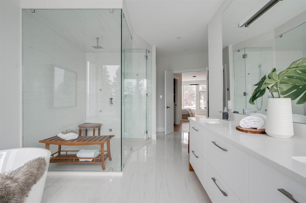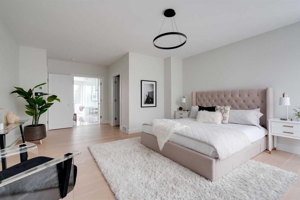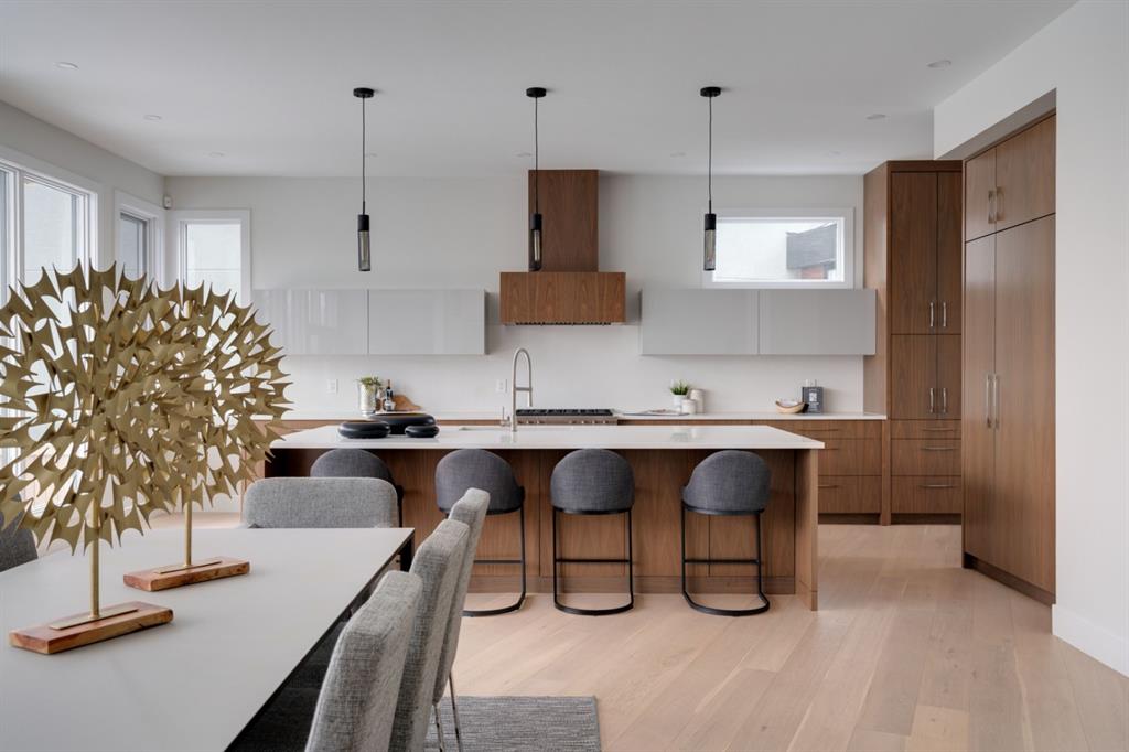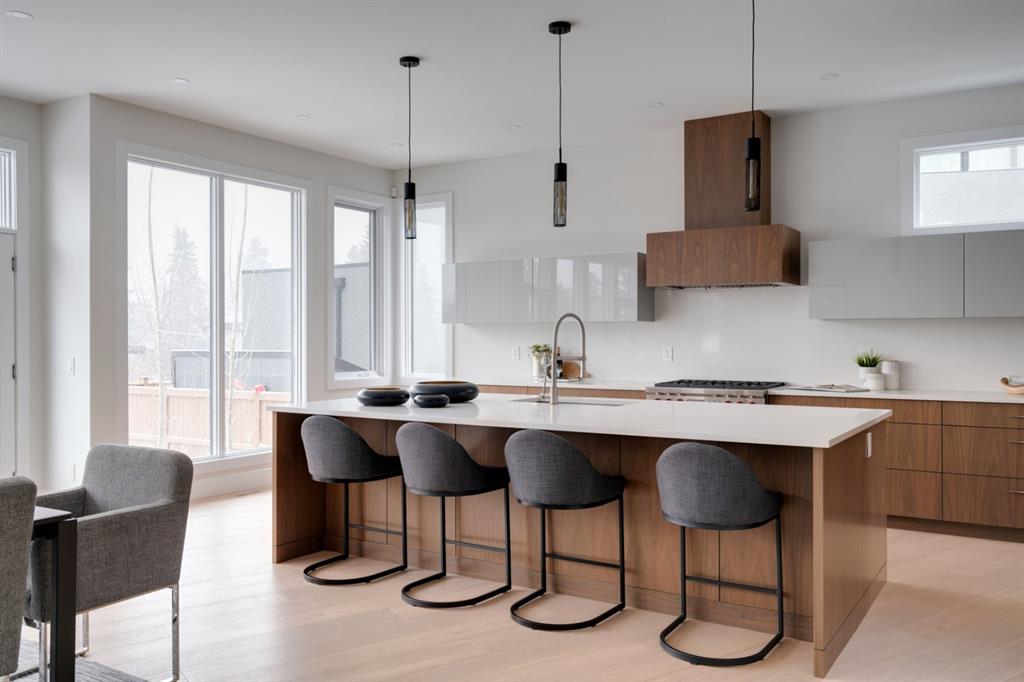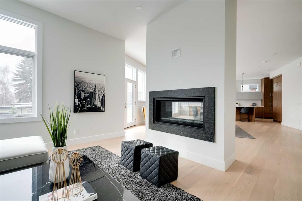 Built in 2020, this striking contemporary home offers 4,567 sq. ft. of thoughtfully designed living space, blending refined minimalist architecture with sophisticated modern finishes. Inspired by a relaxed, Californian sensibility, the home seamlessly balances everyday family living with stylish entertaining. Upon entry, a dramatic floating glass staircase makes an immediate architectural statement. The formal living room is both spacious and inviting, easily accommodating a grand piano while maintaining an intimate feel. The adjacent dining room is ideal for hosting large family gatherings or elegant dinner parties. At the rear of the home, a stunning wall of windows spans the family room, casual dining area, and sleek kitchen, flooding the space with natural light and creating a seamless sense of openness. A double-sided fireplace subtly defines the living zones while preserving a connected flow. The kitchen features a striking mix of high-gloss and warm wood cabinetry, a generous island designed for gathering, and a well-planned pantry offering excellent storage. Step directly from the kitchen onto a tiered deck and into the sunny, south-facing backyard, a private outdoor space ready for your personal vision. A versatile flex room off the kitchen is perfect for a home office, playroom, or cozy lounge. Upstairs, the expansive primary suite is a true retreat, complete with a luxurious ensuite, an impressive walk-in closet, and a that connects to an office or a room you can develop into a second closet. Three additional bedrooms, each with its own ensuite, provide exceptional comfort and privacy. The lower level includes a bright recreation room, a fifth bedroom, and a functional mudroom ideal for busy family life. Additional highlights include air conditioning, a heated driveway and an exceptional four-car garage. With generous proportions, contemporary design, and outstanding potential to personalize, this modern luxury home is ideally located in one of the city’s most sought-after neighbourhoods.