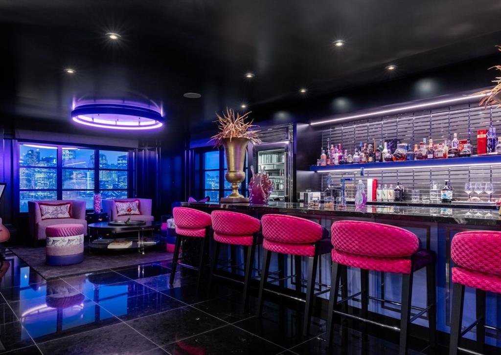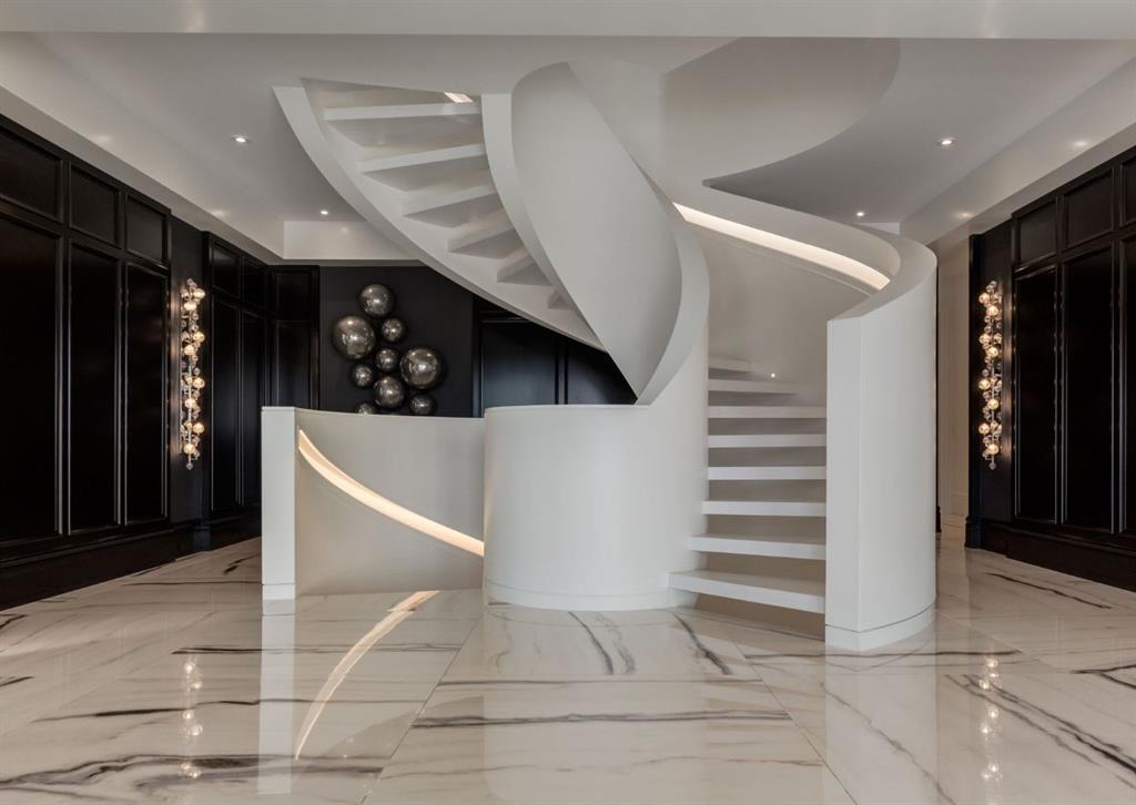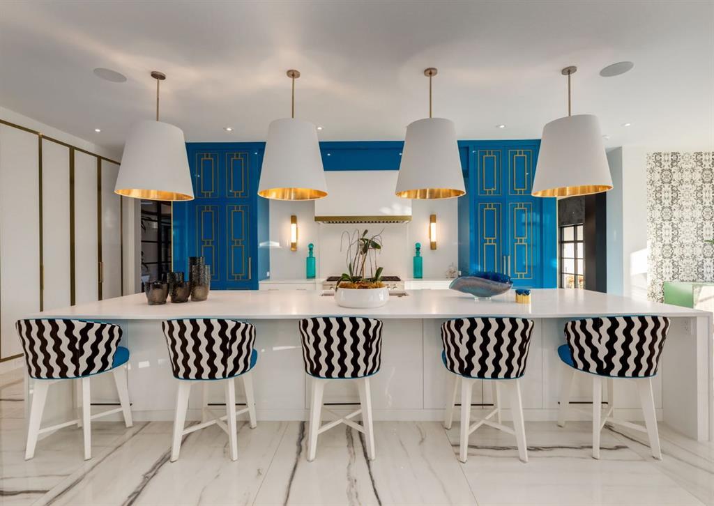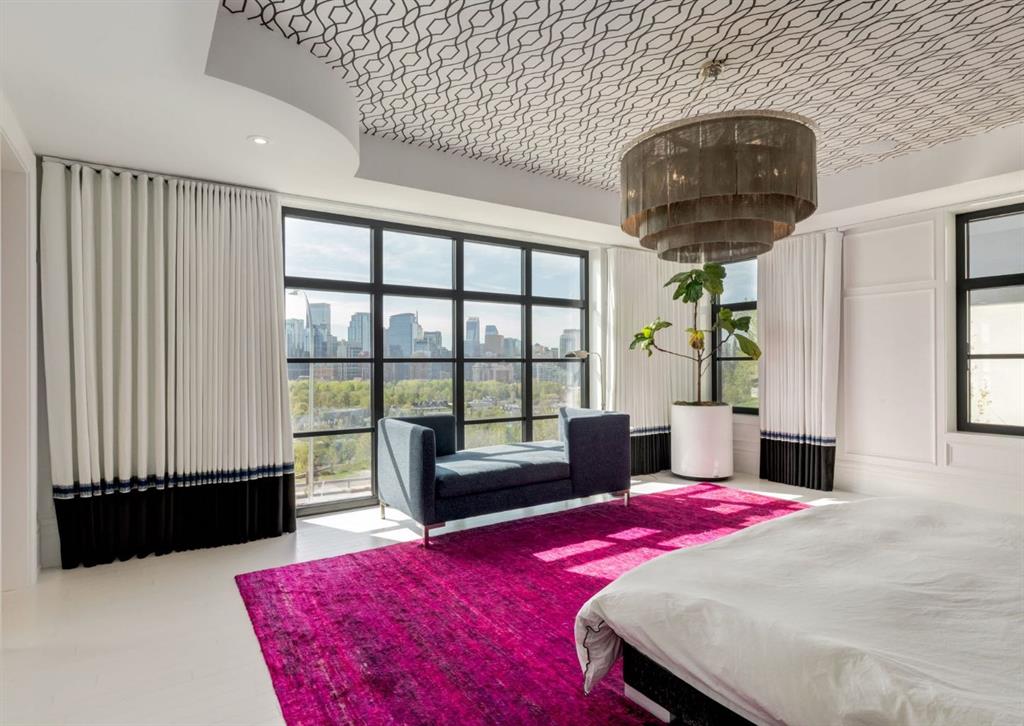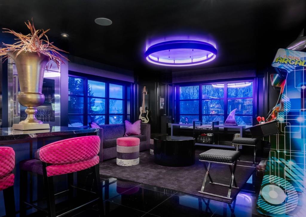 Stunning legacy estate situated on 100 feet of frontage on Calgary’s most coveted street—Crescent Road—offering unparalleled views of the downtown skyline and river valley. This architectural masterpiece boasts over 11,400 sq ft of living space, crafted by boutique luxury builder Maillot Homes in collaboration with Paul Lavoie Interior Design, who drew inspiration from Alice in Wonderland to create a whimsical yet refined family retreat. Built as a forever home and completed in 2022, no expense was spared. The exterior is clad in full-bed Turkish limestone, and the home features high-velocity heating and cooling, an elevator, a roof-mounted solar array, and premium designer finishes throughout. The chef’s kitchen is equipped with a Sub-Zero/Wolf appliance package, steam oven, warming drawers, heated floors, custom millwork with liquid metal finishes, a pot filler, and a fully outfitted butler’s pantry. A highlight of the home is the two-storey library, inspired by Dumbledore’s office in the Harry Potter series—complete with thousands of books, cozy reading nooks, and sweeping city views. The primary retreat features dual private ensuites and walk-in closets, with spa-level features including a steam shower, soaker tub, towel warming drawer, heated floors, custom cabinetry, electronic window coverings, and even a rotating shoe carousel. Additionally, the upper level includes three spacious bedrooms, each with walk-in closets and private ensuites, plus a large laundry room with discreet access from the primary suite. The top floor showcases an elegant lounge with a full bar, wine tasting room, covered patio with gas fireplace, and a designer powder room. Silver-leaf ceilings & a solvable floor maze add to this glamorous space. The lower level mimics a private sports club with an impressive custom gym with soaring ceilings (over 11 feet), nanny quarters, guest suite, recreational room with surround sound, extra laundry, secondary mud room, and ample storage. Outdoors, enjoy the expansive backyard with a retractable-screen patio, gas heaters, fireplace, outdoor dining area, pizza oven, and playhouse. Car enthusiasts will appreciate two heated, attached garages with epoxy floors, custom cabinetry, and a heated front driveway. Ideal for families and grand-scale entertaining, properties of this caliber on the Ridge are extremely rare, this one-of-a-kind estate is a must see.