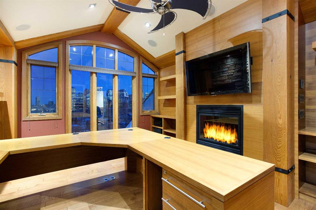 Upstairs, the primary retreat is a true sanctuary featuring vaulted ceilings, a fireplace, and commanding views of downtown and the river valley. A large walk through closet leads to a spa inspired ensuite with double vanities, a soaker tub, and a steam shower. Two additional bedrooms, each with their own walk in closets, share a well finished bathroom with double vanity and steam shower. A generous upper level den with built in desk and shelving, gas fireplace, and sun filled south facing windows provides an ideal office or lounge and may also be suitable for conversion to a fourth upstairs bedroom.