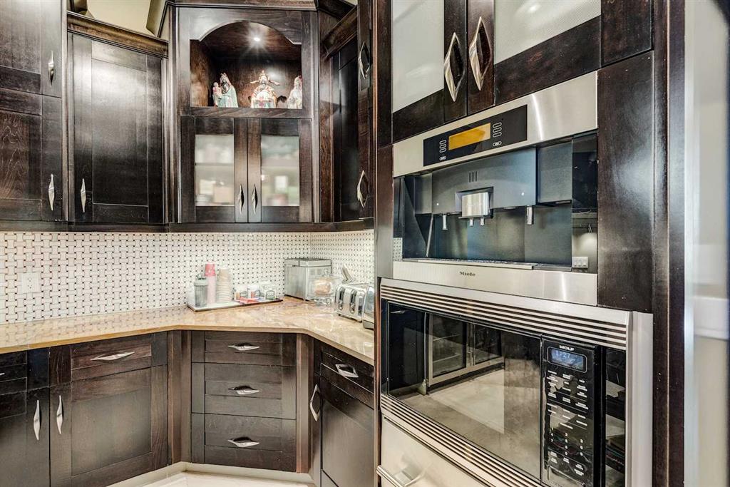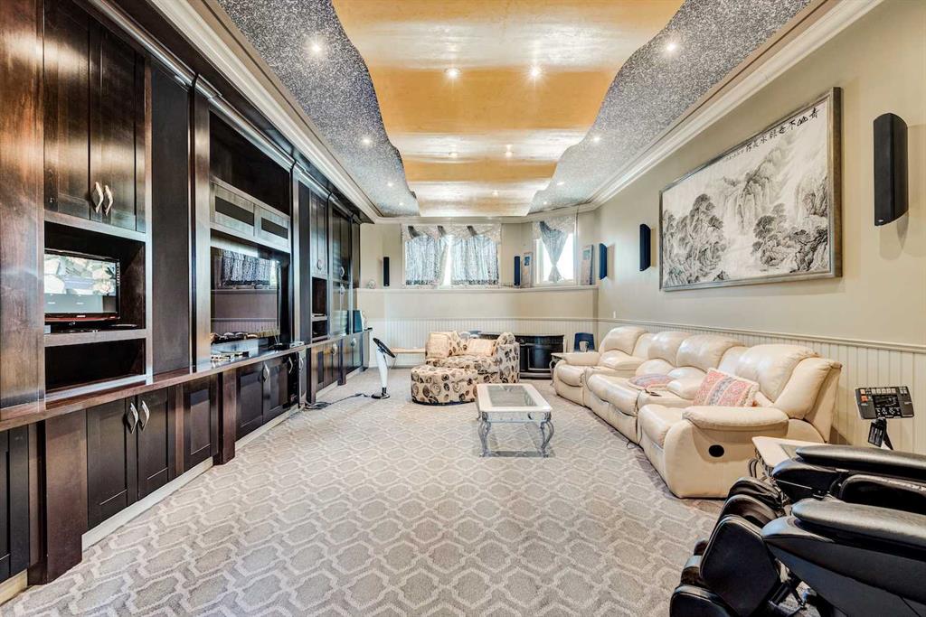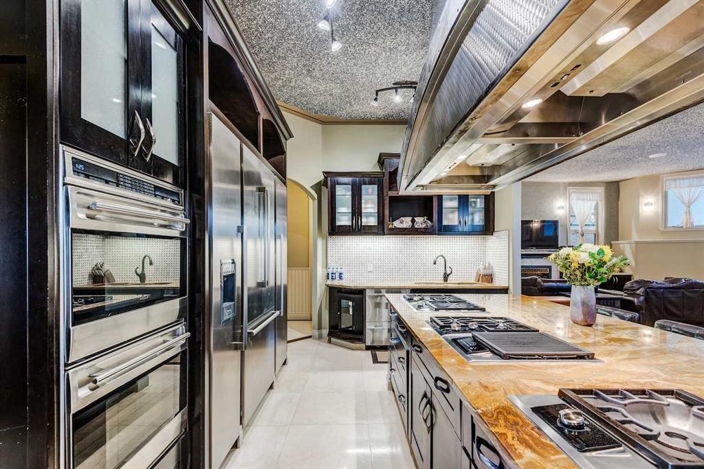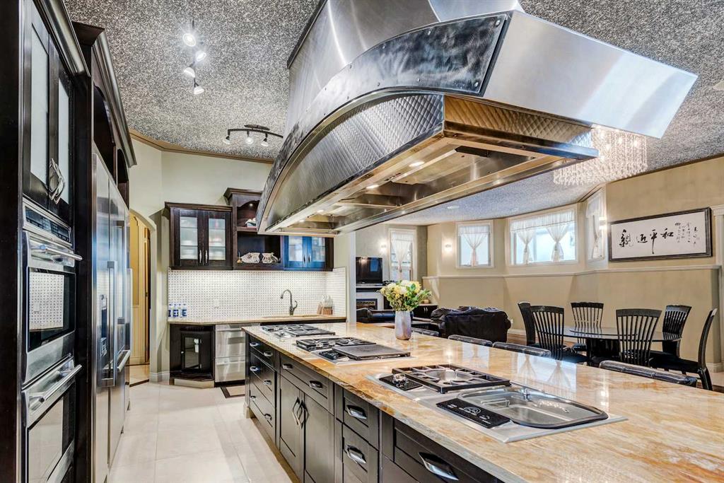 Outside, a multi-level deck and terrace provide covered and open spaces for outdoor entertainment, all while offering panoramic views of the rolling Calgary hills. The private backyard is enveloped by lush landscaping and towering trees. With a 5-car insulated oversized garage and ample paved parking for guests, convenience is never compromised.