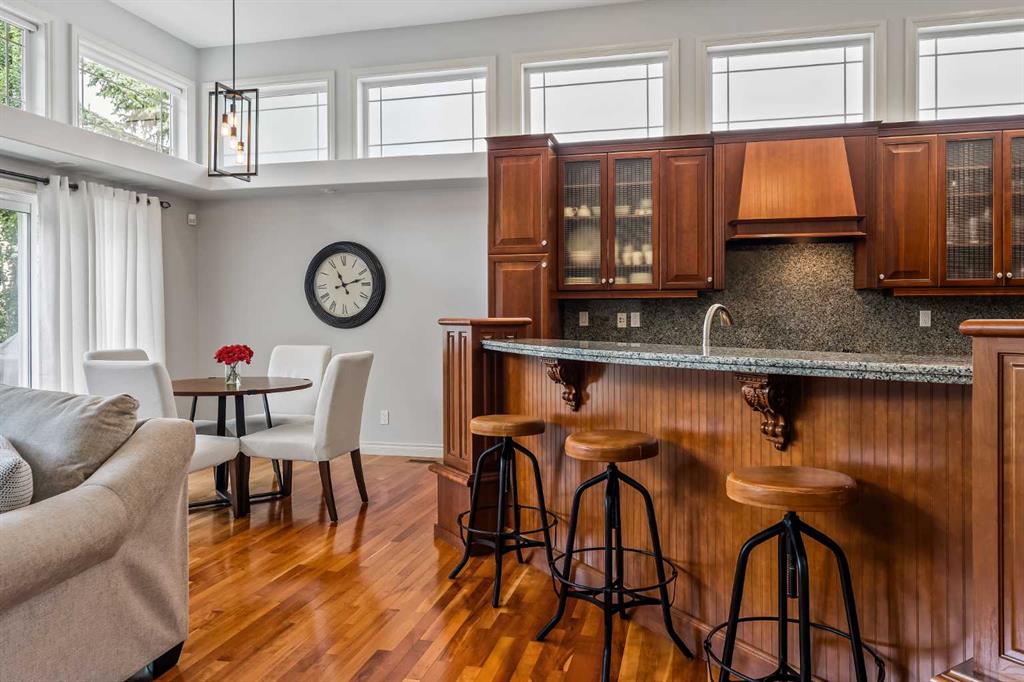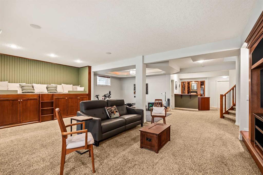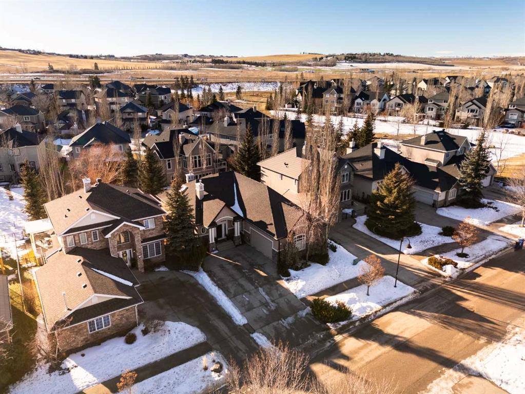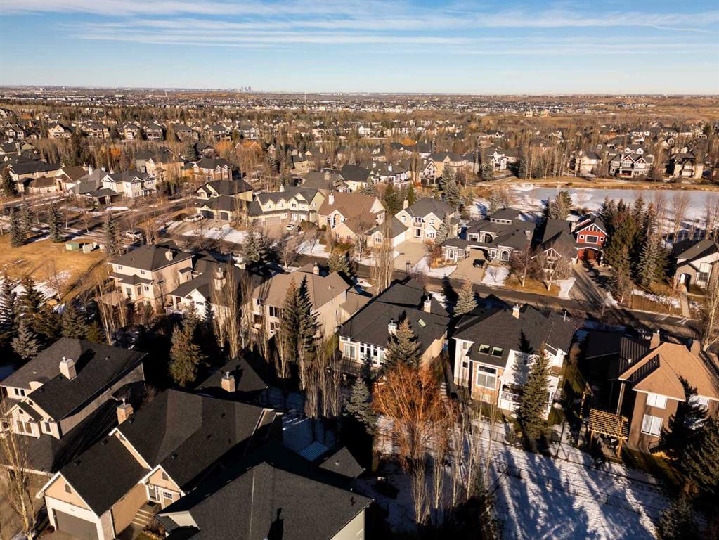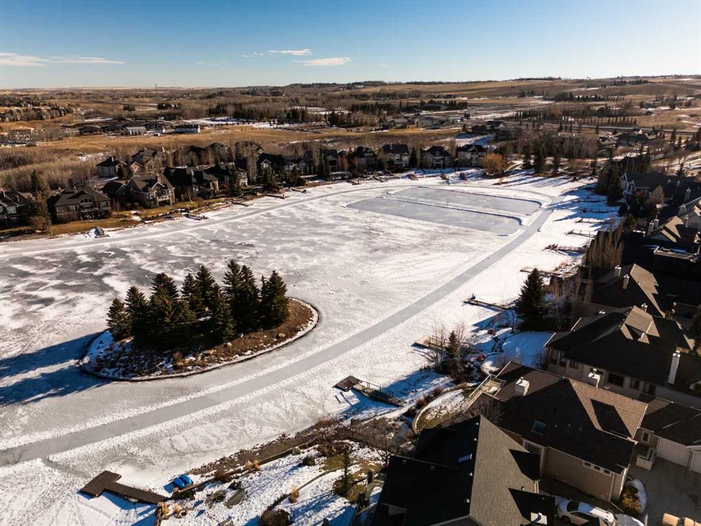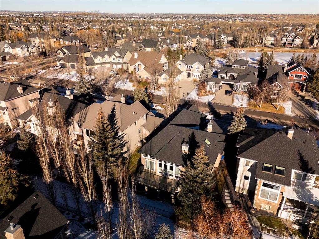 Luxurious, fully finished & beautifully updated, this walkout bungalow showcases exceptional craftsmanship & refined design throughout. Stunning curb appeal sets the tone, highlighted by an oversized double garage with in-floor heating and built-in speakers. Set within the picturesque lake community of Heritage Pointe & backing directly onto green space, the setting delivers privacy, views & a calm connection to nature rarely found so close to the city, with added peace of mind from the community’s independent water system and a full alarm system. Inside, soaring 12’ ceilings & an abundance of natural light elevate the main level, complemented by exotic cherry hardwood flooring & updated lighting for a warm, cohesive flow. A dedicated den with floor-to-ceiling built-ins offers an ideal home office, while a formal dining room framed by tray ceilings creates an elegant setting for hosting with built-in speakers. The open-concept layout unfolds with expansive windows, drawing the outdoors in. At the heart of the home, the chef’s kitchen impresses with granite countertops, custom cabinetry, stainless steel appliances & a large breakfast bar island. Adjacent dining adds everyday flexibility, while patio sliders open to the upper deck for effortless outdoor entertaining. Anchoring the main level, a spectacular living room centers around a striking fireplace with built-in speakers, creating an inviting space to unwind. The private primary suite is a true retreat, featuring a tray ceiling, oversized window, walk-in closet & a beautifully updated ensuite complete with an oversized skylight, deep jetted tub, oversized glass shower, heated floors, built-in speakers & dual vanities. A discreet powder room adds convenience. The walkout lower level is an entertainer’s dream, offering a spacious family room with built-in media area, gas fireplace, integrated storage & elevated seating, with built-in speakers throughout the family room and flex space. A pub-style wet bar with raised seating & a built-in wine cellar is ideal for entertaining, while an additional flex space suits fitness or hobbies. Two bedrooms & a 4-piece bathroom complete this level. Outdoor living continues with a covered lower patio overlooking green space, complemented by an easy-maintenance west-facing backyard with underground sprinklers and a garden shed. Located in sought-after Heritage Pointe, residents enjoy access to a private lake with sandy beach, parks, playgrounds & scenic pathways, all close to schools, shopping & dining, making this an exceptional opportunity to experience refined living in a truly special setting.