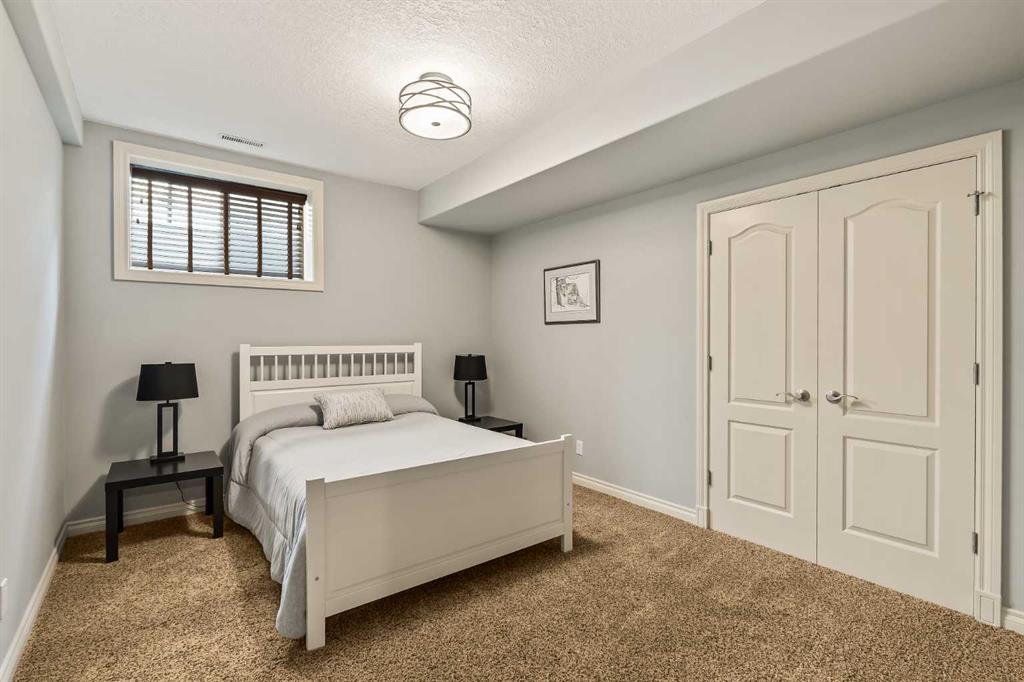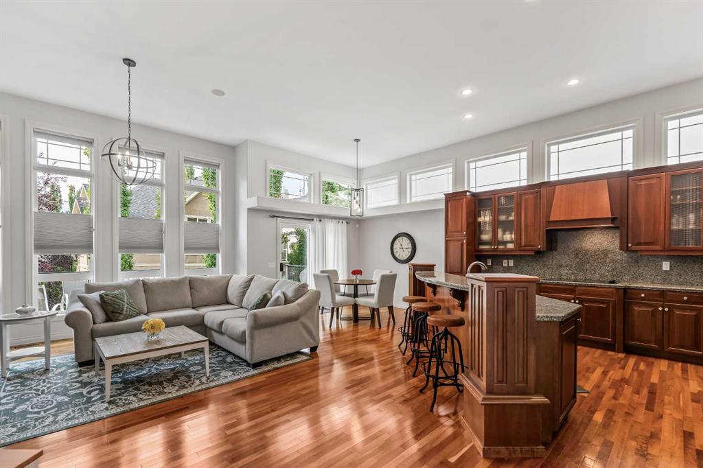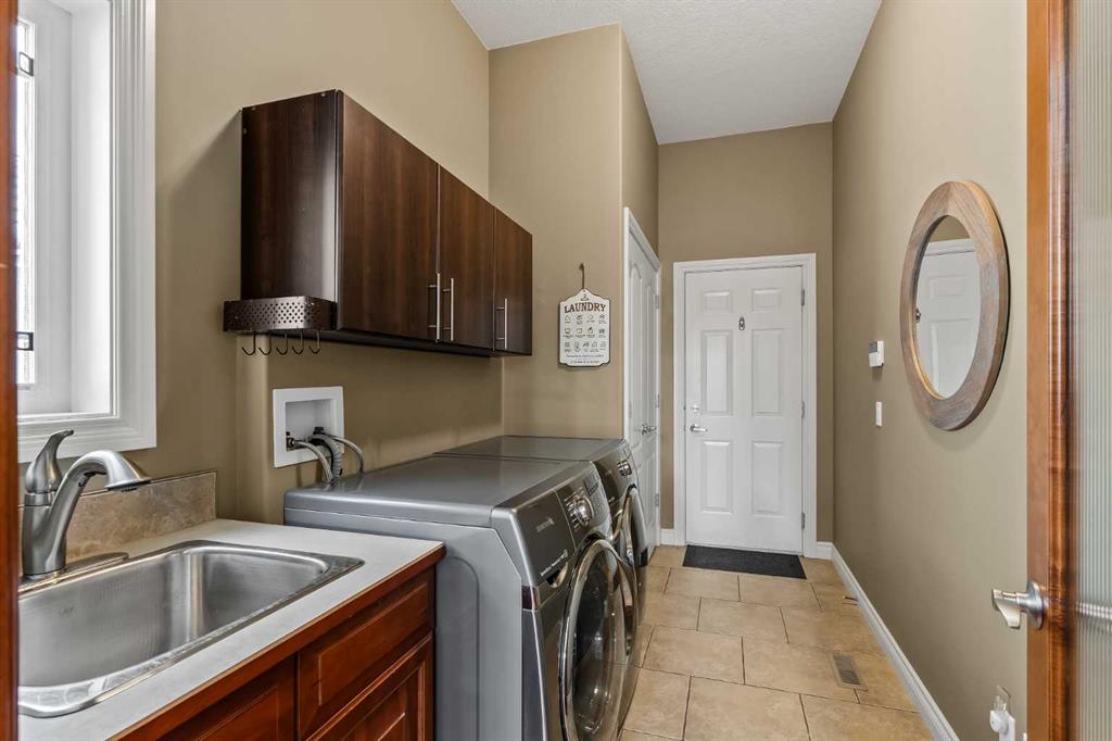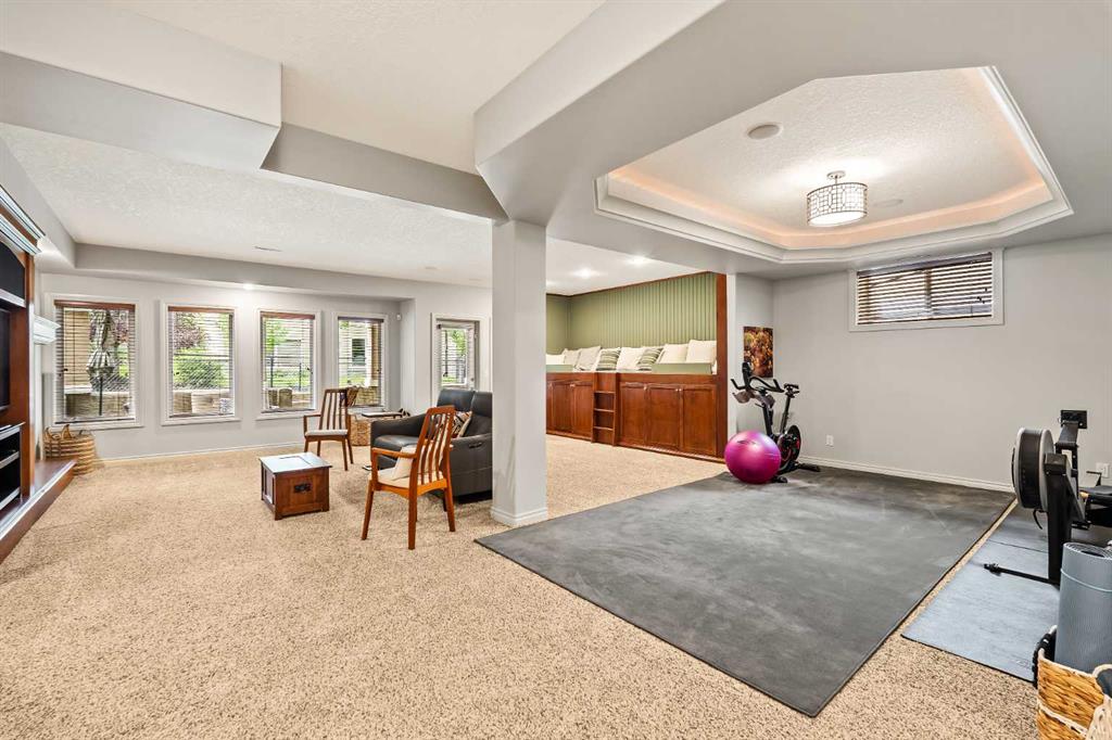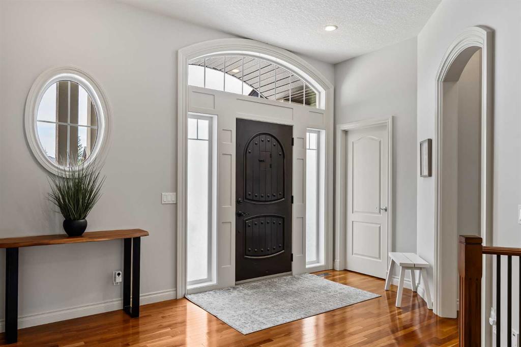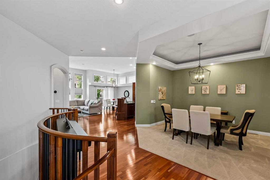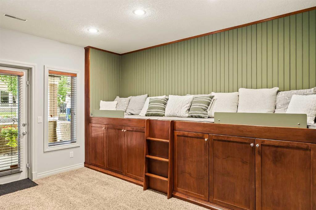 Luxurious, fully finished & beautifully updated, this walkout bungalow showcases exceptional craftsmanship & refined design throughout. Stunning curb appeal sets the tone, highlighted by an oversized double garage with in-floor heating and built-in speakers. Set within the picturesque lake community of Heritage Pointe & backing directly onto green space, the setting delivers privacy, views & a calm connection to nature rarely found so close to the city, with added peace of mind from the community’s independent water system and a full alarm system. Inside, soaring 12’ ceilings & an abundance of natural light elevate the main level, complemented by exotic cherry hardwood flooring & updated lighting for a warm, cohesive flow. A dedicated den with floor-to-ceiling built-ins offers an ideal home office, while a formal dining room framed by tray ceilings creates an elegant setting for hosting with built-in speakers. The open-concept layout unfolds with expansive windows, drawing the outdoors in. At the heart of the home, the chef’s kitchen impresses with granite countertops, custom cabinetry, stainless steel appliances & a large breakfast bar island. Adjacent dining adds everyday flexibility, while patio sliders open to the upper deck for effortless outdoor entertaining. Anchoring the main level, a spectacular living room centers around a striking fireplace with built-in speakers, creating an inviting space to unwind. The private primary suite is a true retreat, featuring a tray ceiling, oversized window, walk-in closet & a beautifully updated ensuite complete with an oversized skylight, deep jetted tub, oversized glass shower, heated floors, built-in speakers & dual vanities. A discreet powder room adds convenience. The walkout lower level is an entertainer’s dream, offering a spacious family room with built-in media area, gas fireplace, integrated storage & elevated seating, with built-in speakers throughout the family room and flex space. A pub-style wet bar with raised seating & a built-in wine cellar is ideal for entertaining, while an additional flex space suits fitness or hobbies. Two bedrooms & a 4-piece bathroom complete this level. Outdoor living continues with a covered lower patio overlooking green space, complemented by an easy-maintenance west-facing backyard with underground sprinklers and a garden shed. Located in sought-after Heritage Pointe, residents enjoy access to a private lake with sandy beach, parks, playgrounds & scenic pathways, all close to schools, shopping & dining, making this an exceptional opportunity to experience refined living in a truly special setting.