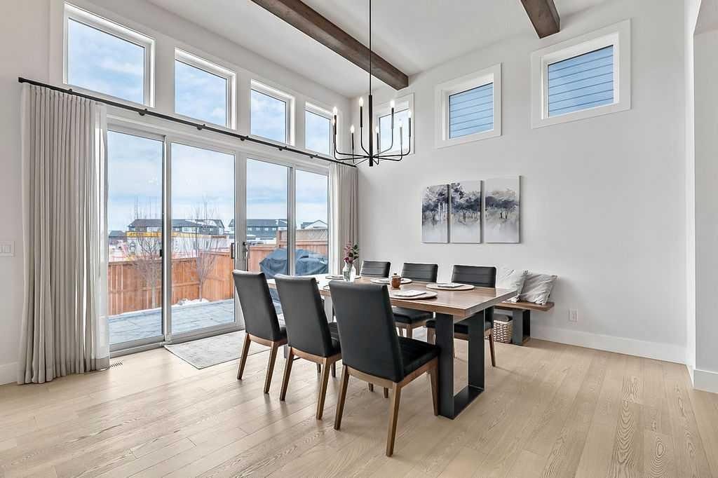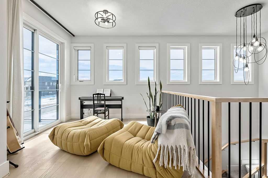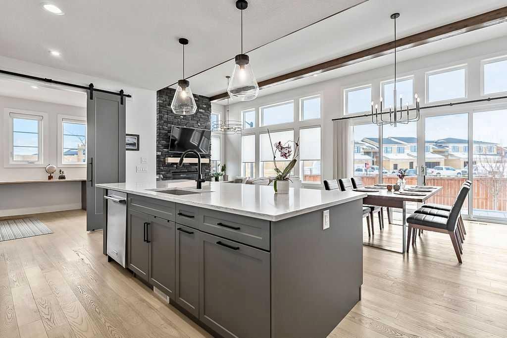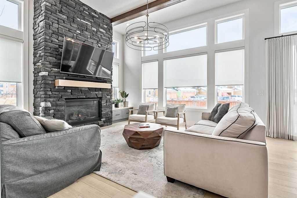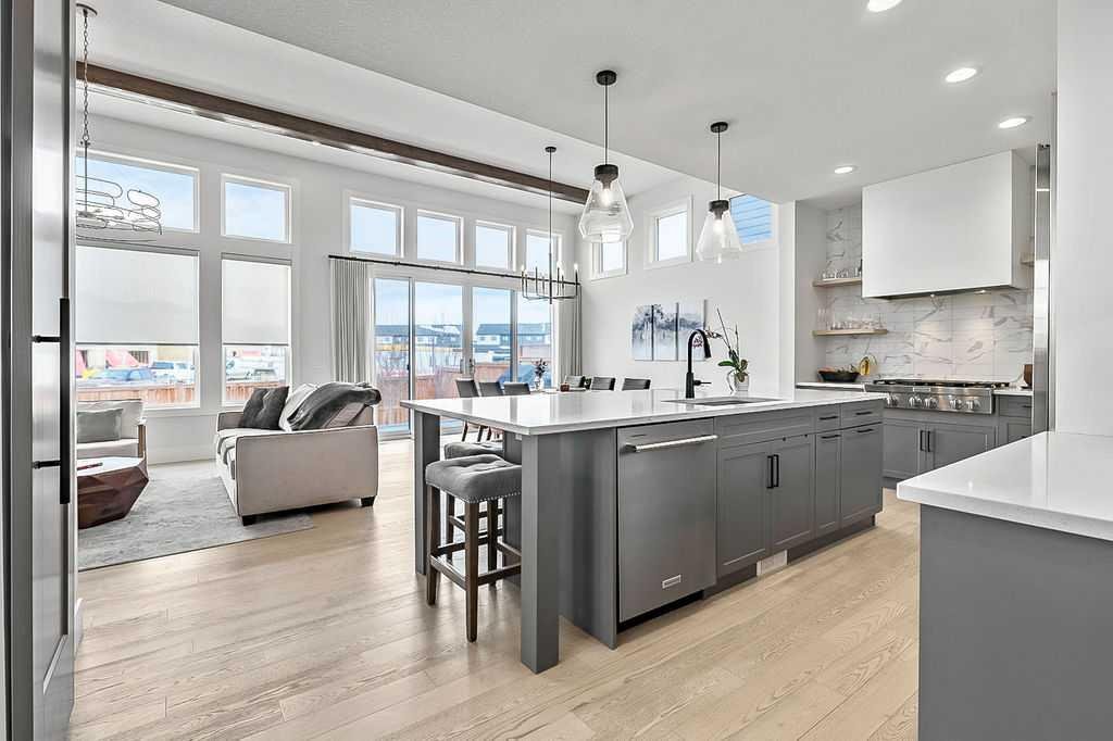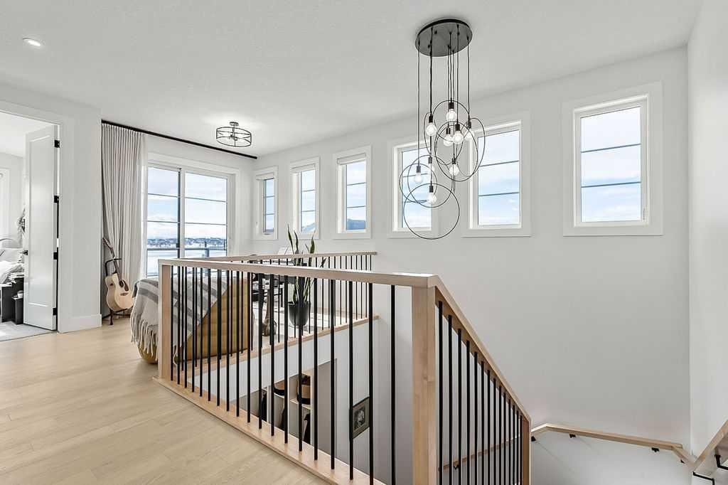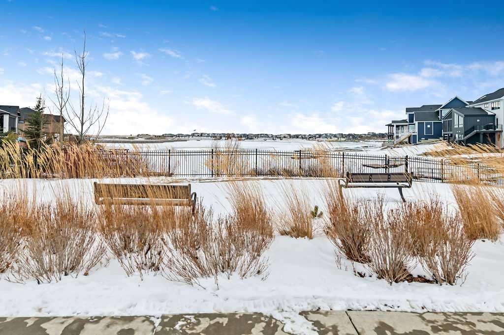 Exceptional residence on an OVERSIZED CORNER LOT WITH GORGEOUS LAKE VIEWS. Thoughtful professional design aspects and upgrades throughout the home result in 3,500 sq. ft. of beautiful developed space, including a fully finished basement. This is the ultimate family home designed for both everyday comfort and elevated entertaining. The open concept design seamlessly connects the living, dining and kitchen spaces and features walls of floor to ceiling windows that flood the home with natural light. The chef inspired kitchen is a true showpiece, featuring high end appliances including a double fridge/freezer, 6 burner gas cooktop, built-in oven, custom hood fan, walk-in pantry and an ultra convenient butler’s pantry. The spacious dining area opens through patio doors to a custom tiered stone patio, fully landscaped and fenced yard. The living room, complete with floor to ceiling 16’ stone fireplace, beamed ceiling, STUNNING WINDOWSCAPING and built-in window seating is sure to create memories with family and friends. A main floor office provides ample space for a work from home set up, while the front entrance features built-in hanging and storage compartments to keep busy family life organized. Upstairs, an open loft with a full wall of windows and patio doors leads to a private BALCONY OVERLOOKING THE LAKE - an ideal retreat for morning coffee or evening relaxation. The primary suite offers an elegant ensuite with dual vanities, a stand alone soaker tub and a generously sized walk in shower with dual shower heads, creating a serene, zen like escape. The secondary bedrooms are equally charming, each featuring cozy built-in window seats. The main bath has an extra long double vanity with abundant storage. The fully developed basement continues the home’s thoughtful design, featuring a spacious family room with a fireplace feature wall, built-in over sized wet bar with sink and beverage fridge, a fourth bedroom, full bathroom and a laundry room - perfect for guests, teens, or multi-generational living. This perfect family home also has a heated double garage as an added bonus. Harmony is an exceptional award winning community with two private lakes, a Phil Mickelson world class golf course, miles of biking and walking trails, greenspace, easy access to downtown Calgary and the Rocky Mountains.