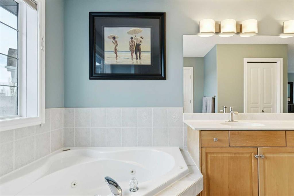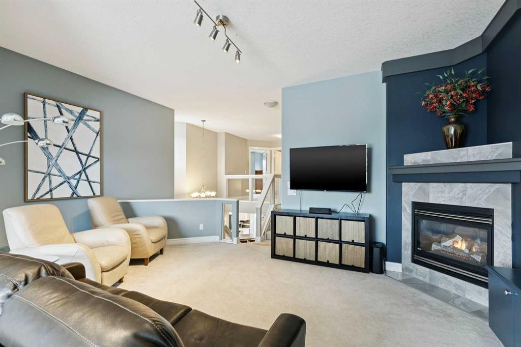 This is the kind of home where families put down roots. It is tucked away on a quiet cul-de-sac in one of the most sought-after pockets of the community, with a south facing yard backing on to a treed green space. With a charming front porch, a welcoming red door, and a flowering tree providing curb appeal, the tone is set from the moment you arrive. Inside, refinished hardwood floors lead you through a comfortable living room anchored by a fireplace and flowing seamlessly into the open-concept kitchen and dining area designed for everyday life. The kitchen has been thoughtfully updated in a fresh black and white palette, featuring quartz countertops, stainless steel appliances, a gas cooktop, a central island with seating, and a spacious pantry that keeps everything organized and within reach. A dedicated main-floor den offers an ideal work-from-home space, complete with built-in bookcases and a peaceful outlook to the front porch. Upstairs, the home truly shines for family living. A generous bonus room with vaulted ceilings and a fireplace creates the perfect gathering place for movie nights, games, or simply unwinding together. The primary bedroom is a serene retreat, with space for a sitting area overlooking the backyard, a walk-in closet, and a private ensuite. Two additional bedrooms - one with a built-in desk, along with a full bathroom complete the upper level.