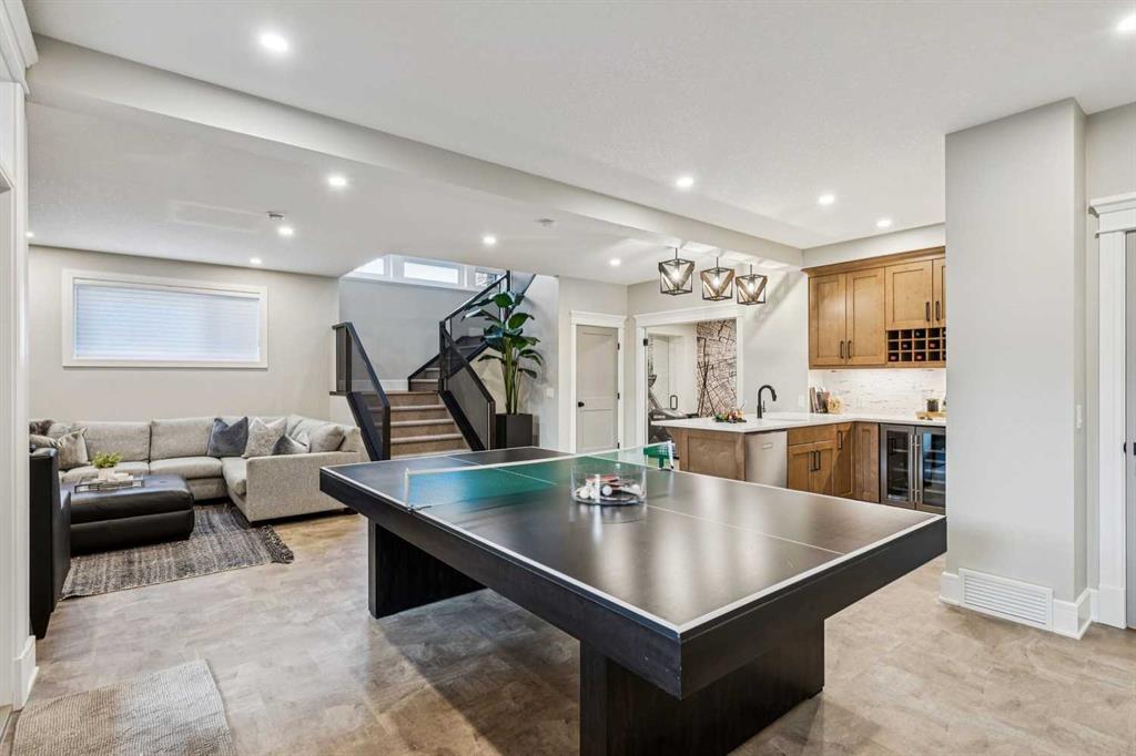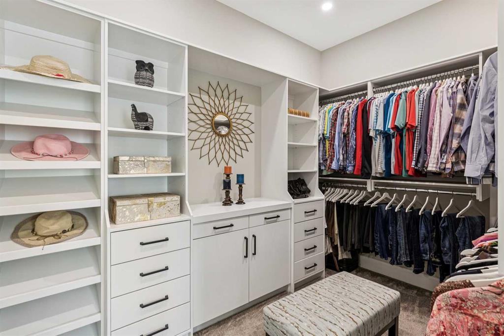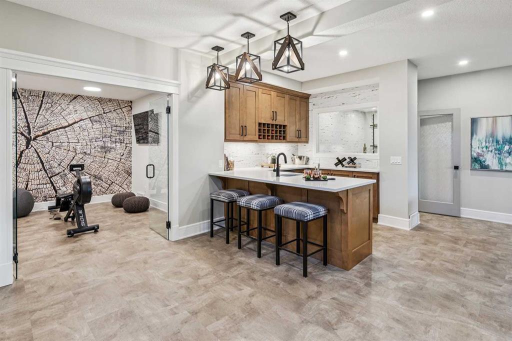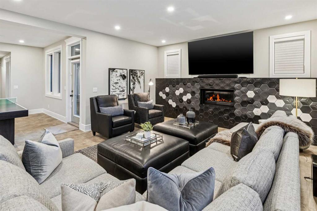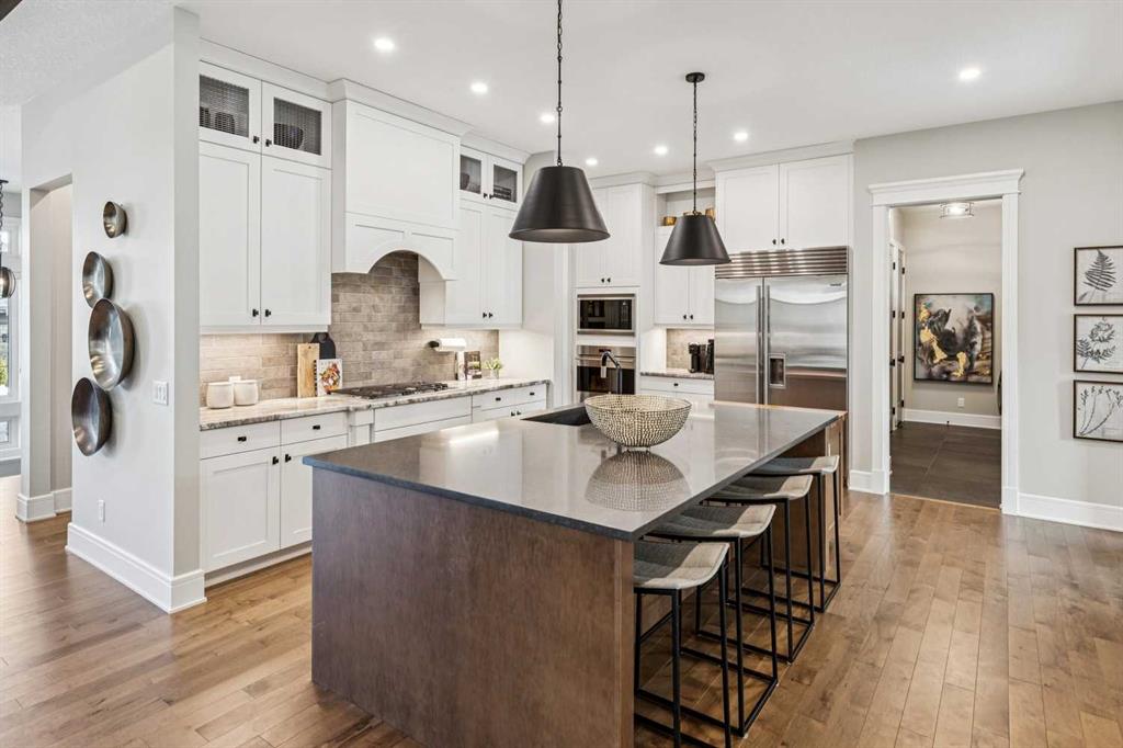 Welcome to a truly remarkable residence in the sought-after southwest community of Crestmont—a former Augusta show home showcasing extensive upgrades, refined craftsmanship, and a unique combination of luxury and functionality. Positioned on a generous corner lot with rare 5-car garage, this highly coveted bungalow boasts more than 4,000 sq. ft. on two levels and offers an elevated lifestyle with thoughtfully designed spaces both indoors and out. The open-concept main level boasts 10' & 11' ceilings and is anchored by a stunning chef's kitchen, featuring extensive custom cabinetry, high-end Sub-Zero and Wolf appliances, and an oversized pantry—perfectly suited for both everyday living and elegant entertaining. Sunlight fills the space through transom windows, flowing seamlessly into inviting living and dining areas that open to multiple outdoor spaces. The primary suite on the main level is a private retreat of impressive scale, complete with its own southwest-facing deck. A spa-inspired ensuite with dual vanities, heated floors, a luxurious soaker tub and an expansive dressing room creates a serene, hotel-calibre experience. The main floor is complete with an executive style office featuring built-in desk and cabinetry, powder room and functional laundry & mudroom. Designed for entertaining and relaxation alike, the fully developed lower level offers two additional generously sized bedrooms, each with it's own full bath and an spacious recreation and games room. A sophisticated wet bar is complemented by a dedicated wine room, while a fitness room and hobby/craft room with second laundry area adds to the home’s lifestyle appeal. Outdoor living is equally exceptional, with multiple decks and private outdoor spaces, including a secluded walk-out cove featuring a hot tub. Outstanding landscaping includes feature rundle stone, wrought iron fence and back yard bordered by additional evergreen trees for enhanced privacy and year-round enjoyment. A standout feature rarely found: a five-car garage with room for vehicle lifts, and offering unparalleled storage, dog wash and flexibility for car enthusiasts or hobbyists. Situated in the coveted Crestmont community on Calgary’s west side, this home offers more than just luxury indoors. Residents enjoy access to an inviting HOA clubhouse, scenic parks and pathways, and sport courts for recreation and play. Retail destinations are conveniently close, and the location provides easy access to downtown Calgary as well as direct routes to the mountains, making daily life and weekend escapes effortless. This is a rare opportunity to own a statement property in Crestmont—perfect for empty nesters or those about to be - where luxury, privacy, and thoughtful design converge in one extraordinary home.