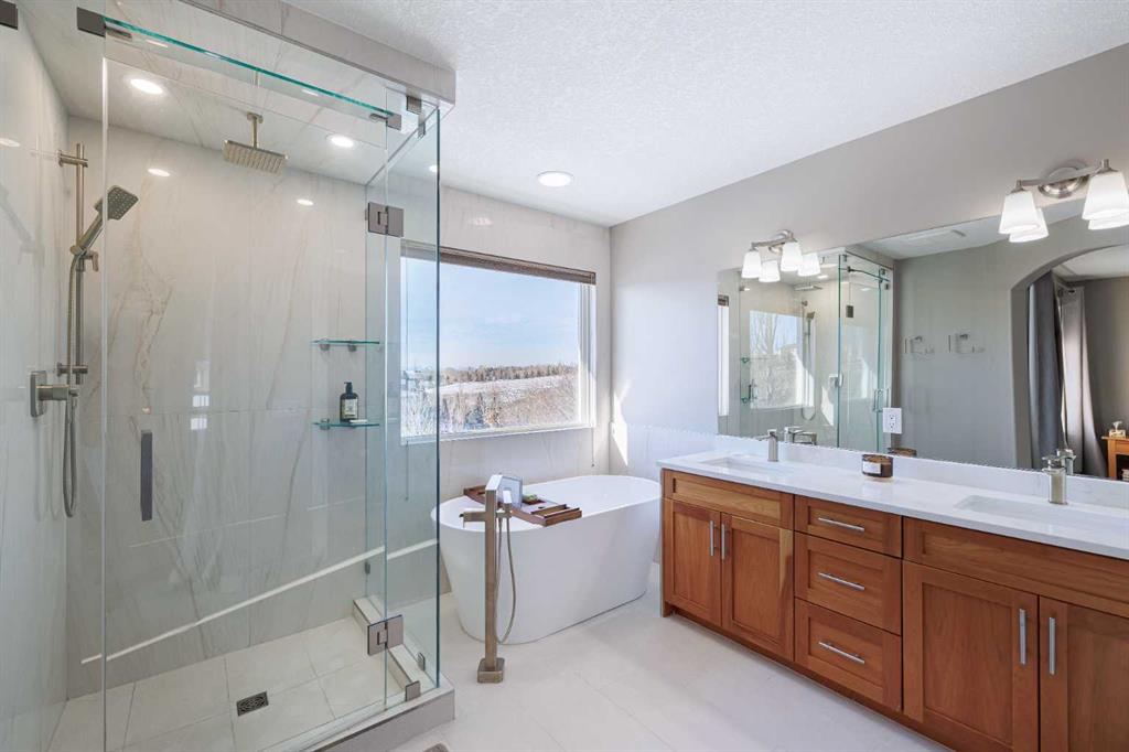 Hardwood flooring spans the main level, complemented by air conditioning for year-round comfort.? At the heart of the home is a beautifully designed kitchen featuring granite countertops, stainless steel appliances, ceiling-height cabinetry, a spacious corner pantry, and a large central island ideal ?perfect for meal prep. A window above the sink overlooks the backyard, bringing in natural light and reinforcing the home’s connection to its outdoor surroundings. The bright eating nook sits adjacent to the kitchen and offers direct access to the back deck—perfect for everyday dining or effortless indoor-outdoor living. The open-concept living room features a cozy fireplace, creating a warm focal point for relaxing evenings or entertaining guests.? A conveniently located two-piece powder room and main floor laundry add to the home’s practical appeal.? The fully fenced backyard is a true retreat, backing onto a walking path and framed by mature trees for added privacy and tranquility. From the upper deck to the lower patio accessed via the walkout basement, this outdoor space is ideal for entertaining, relaxing, or enjoying nature year-round.? Upstairs, a spacious bonus room with built-in desk and charming window seat provides a versatile family gathering space. Three generous bedrooms share a beautifully renovated four-piece bathroom, while the primary suite offers a peaceful sanctuary with mountain views, a walk-in closet, and a fully renovated five-piece ensuite featuring dual vanities, a soaking tub, stand-alone shower, and private water closet.? The fully finished walkout basement expands the living space with a large family and recreation room, an additional bedroom, and a four-piece bathroom—ideal for guests, extended family, or flexible living arrangements.? Thoughtfully designed and beautifully maintained, this home offers an exceptional balance of space, style, and setting—where everyday living feels elevated and every detail supports a refined, comfortable lifestyle.