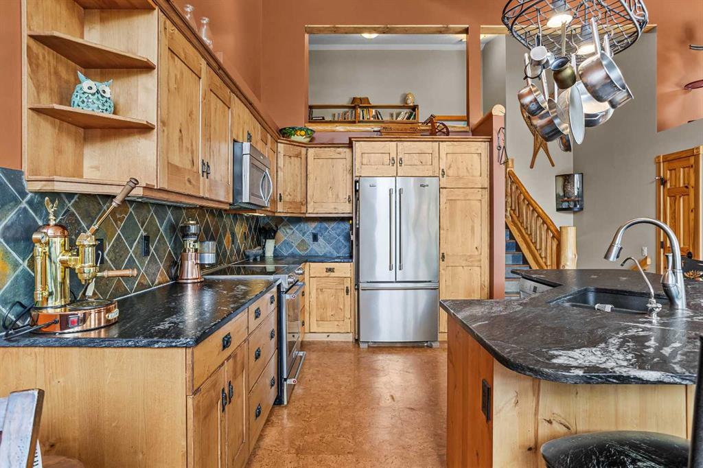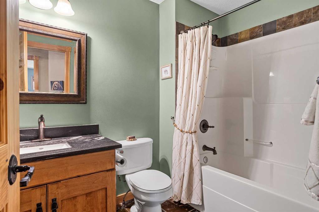 This 3 bed, 3-bath mountain retreat offers over 2,400 sq ft of beautifully designed living space, ideal for full-time living or as a luxurious getaway. Step into the main floor where soaring vaulted ceilings and expansive windows flood the open-concept living area with natural light. The gourmet kitchen is a chef’s dream, featuring stainless steel appliances, leathered granite countertops, abundant cabinetry, and a seamless flow into the dining and living spaces. A striking stone fireplace anchors the living room, creating a warm and inviting atmosphere, while the spacious deck invites you to soak in unobstructed mountain views. The private primary suite occupies its own floor—a true sanctuary complete with a walk-in closet, private deck, and a spa-inspired 4-piece ensuite. Enjoy quartz countertops, double vanities, and a large walk-in shower in this peaceful retreat. The second level includes two generous bedrooms, a full 4-piece bath, and a convenient laundry area. The lower level can be used as an illegal suite or additional living space for guests or multi-generational living, with its separate entrance, cozy living area, Murphy bed, bathroom, storage, and a handy countertop range. Step outside to a private backyard oasis with a hot tub, fire pit, and plenty of seating for entertaining under the stars. Whether you're enjoying a quiet evening by the fire or hosting friends on the deck with panoramic views, this home offers the perfect blend of comfort, luxury, and mountain lifestyle.
