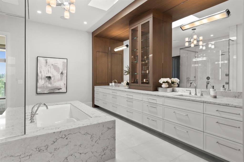Three private outdoor retreats include a 30’ x 16’ partially covered patio ideal for alfresco dining and summer gatherings. The owner’s suite offers a serene indoor-outdoor connection to a west-facing patio with panoramic treetop views, a spa-inspired ensuite wrapped in glossy porcelain tile, and a walk-in closet that feels more like a high-end boutique than a dressing room. A second bedroom with ensuite and walk-in closet, a den, and a laundry room complete the thoughtful single-level layout.
