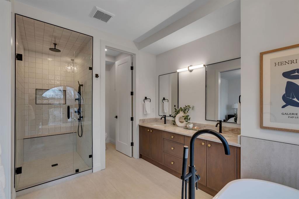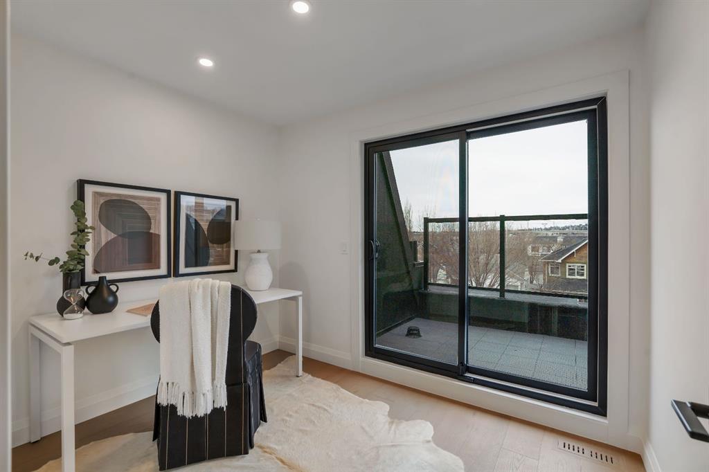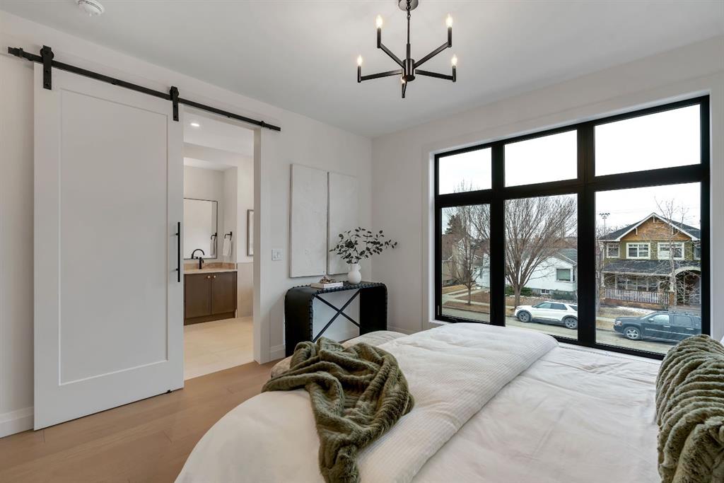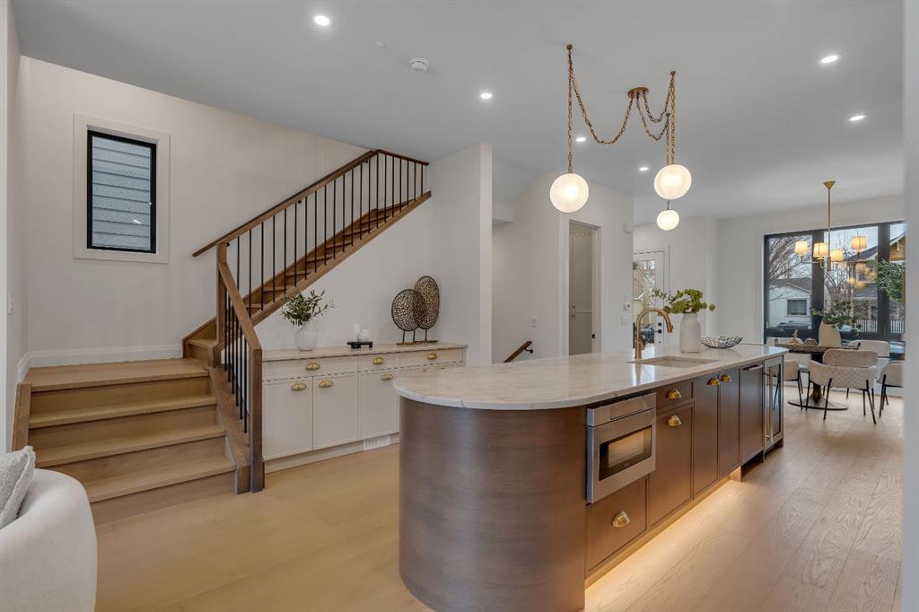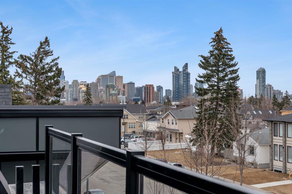 Unit 2 is sold with only Unit 1 remaining, presenting a rare opportunity to own a brand new exceptional three storey semi detached infill offering a total of over 3,700 sqft of thoughtfully curated living space across four levels in the sought after West Hillhurst. This residence showcases elevated inner city living with impeccable craftsmanship and refined contemporary design, highlighted by wide plank hardwood flooring and striking custom oak detailing throughout. The open concept main floor is defined by 10 foot ceilings and a formal dining area with custom wainscoting and large south facing windows that fill the space with natural light, while the kitchen stands out as a true centrepiece with a dramatic 12 foot curved oak island, quartz countertops and backsplash, premium built in appliances, gold and black hardware, two tone cabinetry, a plaster finished curved hood fan, gold pot filler, and under cabinet lighting, complemented by a thoughtfully concealed walk in pantry with custom cabinetry. The living room offers a warm yet sophisticated atmosphere with a designer gas fireplace featuring fluted tile, quartz accents, and curved oak built ins, stepping out to a very large backyard, while a spacious mudroom with built ins leads to a beautifully finished powder room with oak cabinetry, half panelled walls, and under mount lighting. The upper level features two luxurious primary suites, each complete with double oak vanities, freestanding soaker tubs, fully tiled showers, and in-floor heating, along with a versatile bonus room and a full laundry room, all enhanced by carefully selected designer lighting and elegant sconces. The third level loft creates a private retreat with an additional expansive primary bedroom, a large walk in closet with an oak finished island, make-up desk, a spa inspired ensuite with double oak vanity, in-floor heat, and a steam shower, as well as a dedicated office space that opens onto a private balcony with unobstructed downtown views. The fully developed basement adds further functionality with a generous recreation area, wet bar, fourth bedroom, full bathroom, in-floor heat, A/C rough in, and a dedicated home gym, all finished with oversized windows to maximize natural light. Designed by John Trin, this architectural statement home offers a seamless blend of luxury, comfort, and design, ideally located near parks, schools, the river, and everyday amenities. Call today to book your private tour!